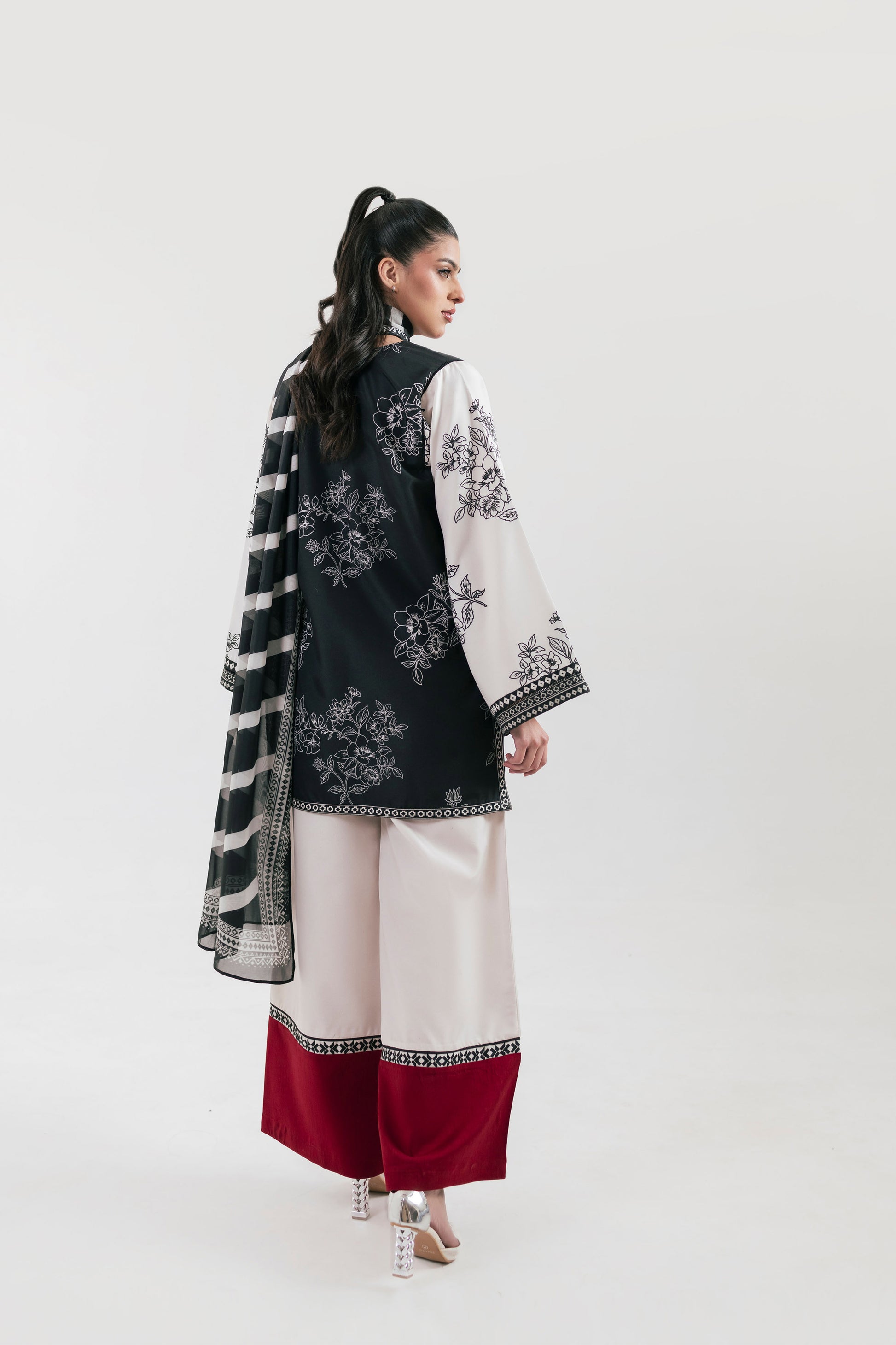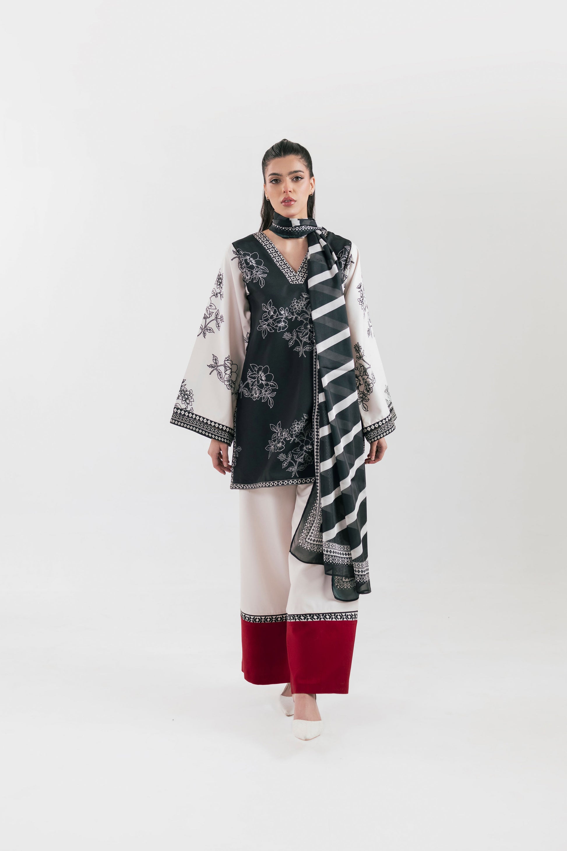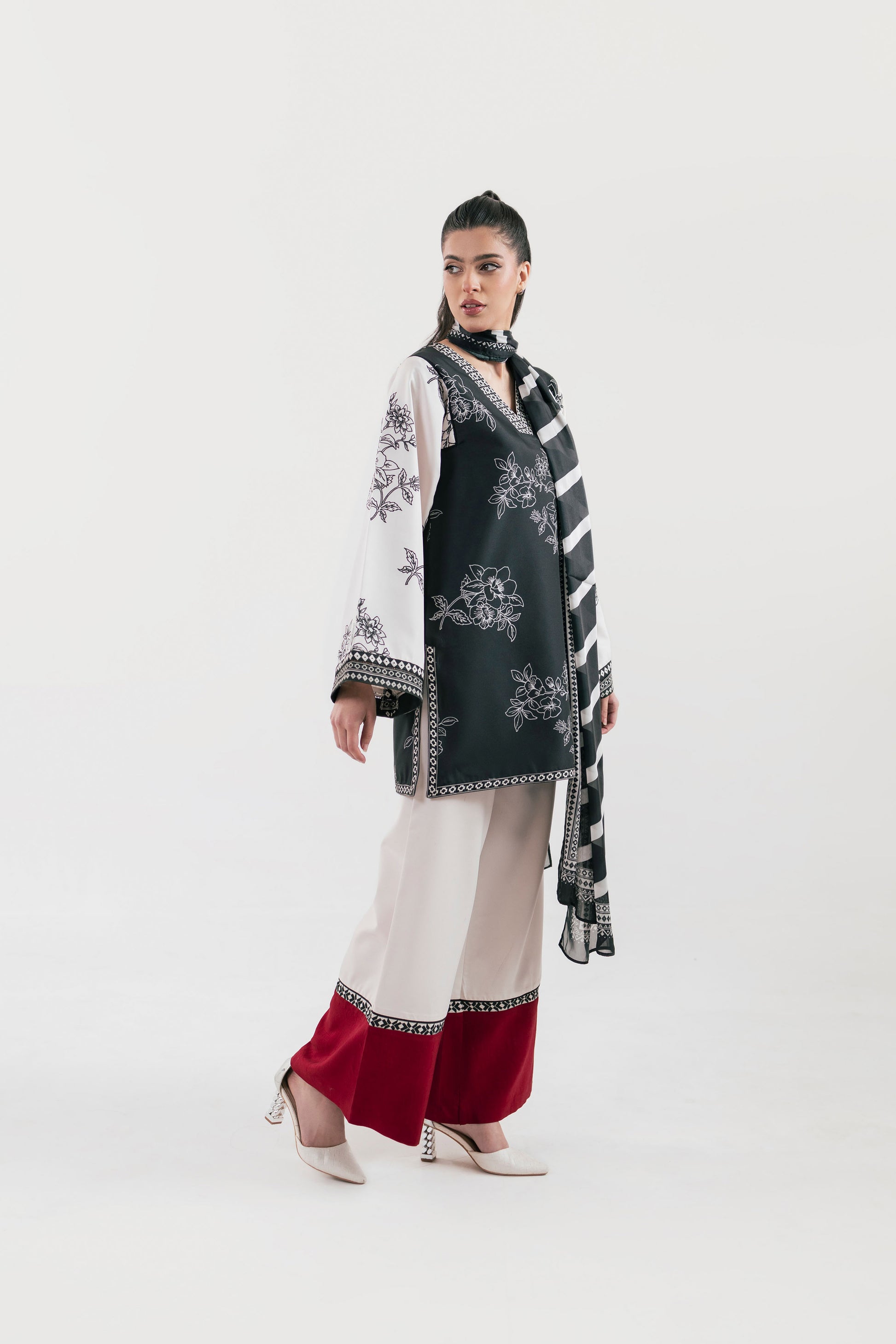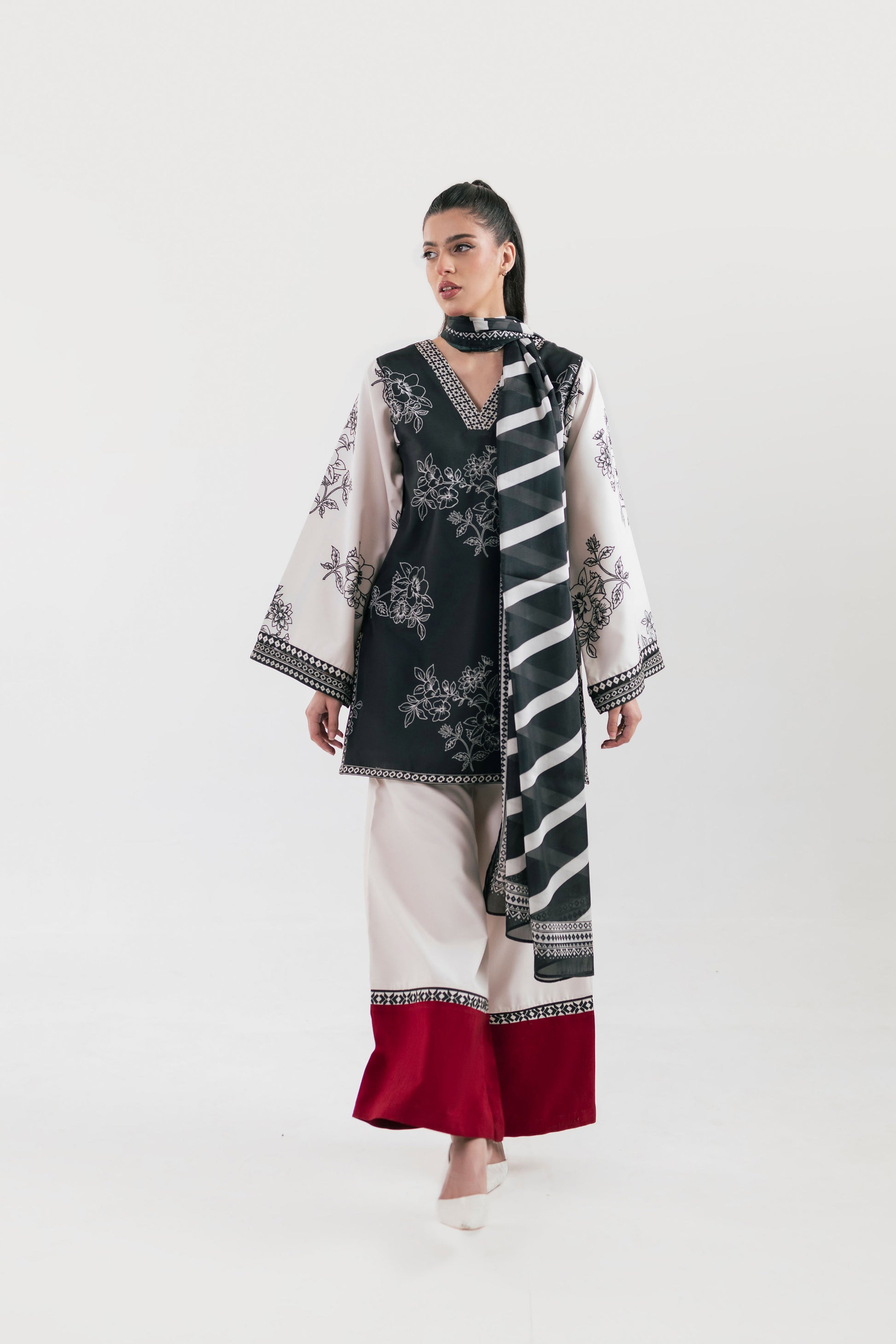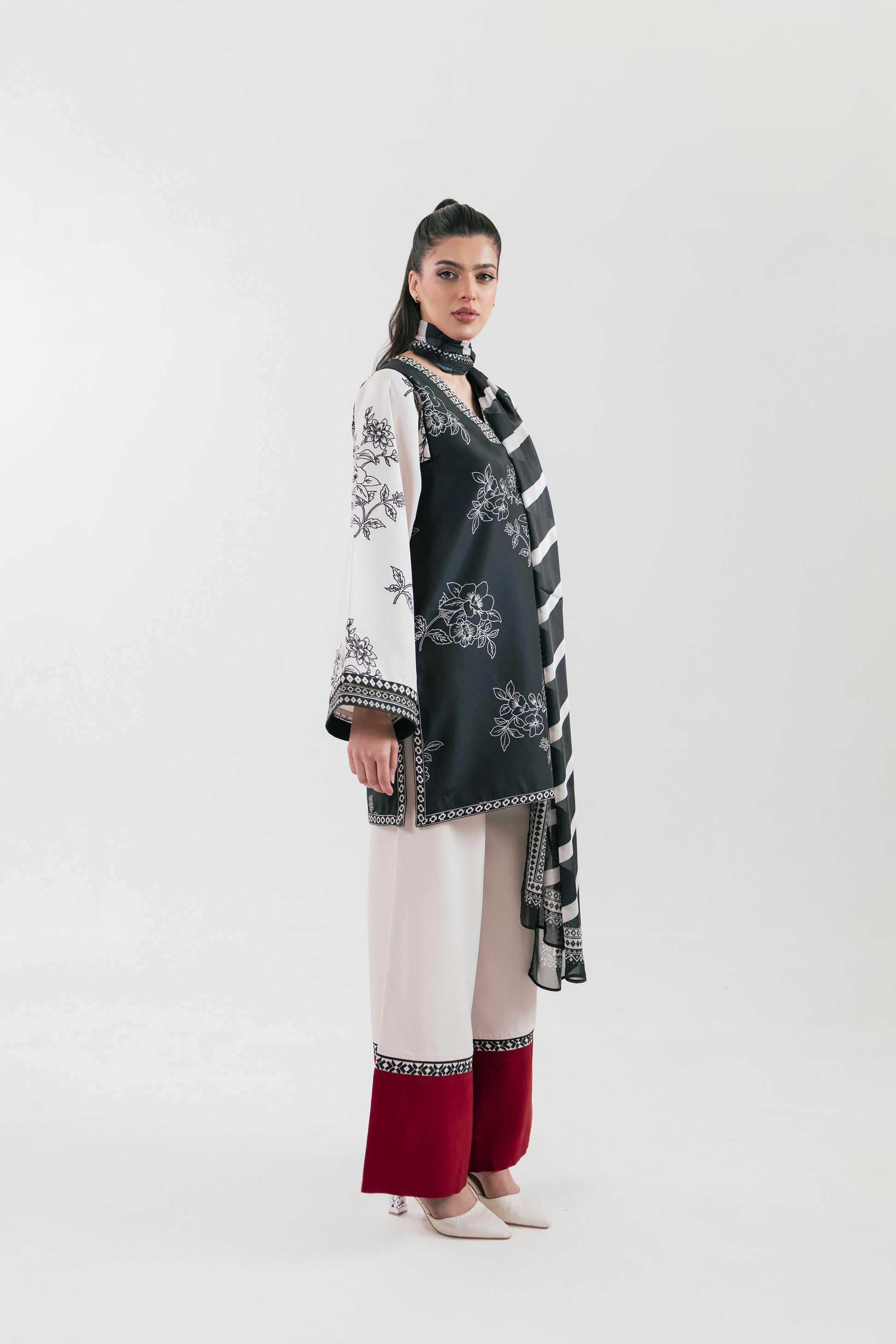 Classic monochrome with a bold twist—this stitched 3-piece set features a black and white printed shirt with delicate lace details on the sleeves. The look is elevated with a striking black apple silk dupatta adorned with white diagonal stripes and wide-leg ivory trousers with a statement red color block, adding a modern edge to timeless elegance.