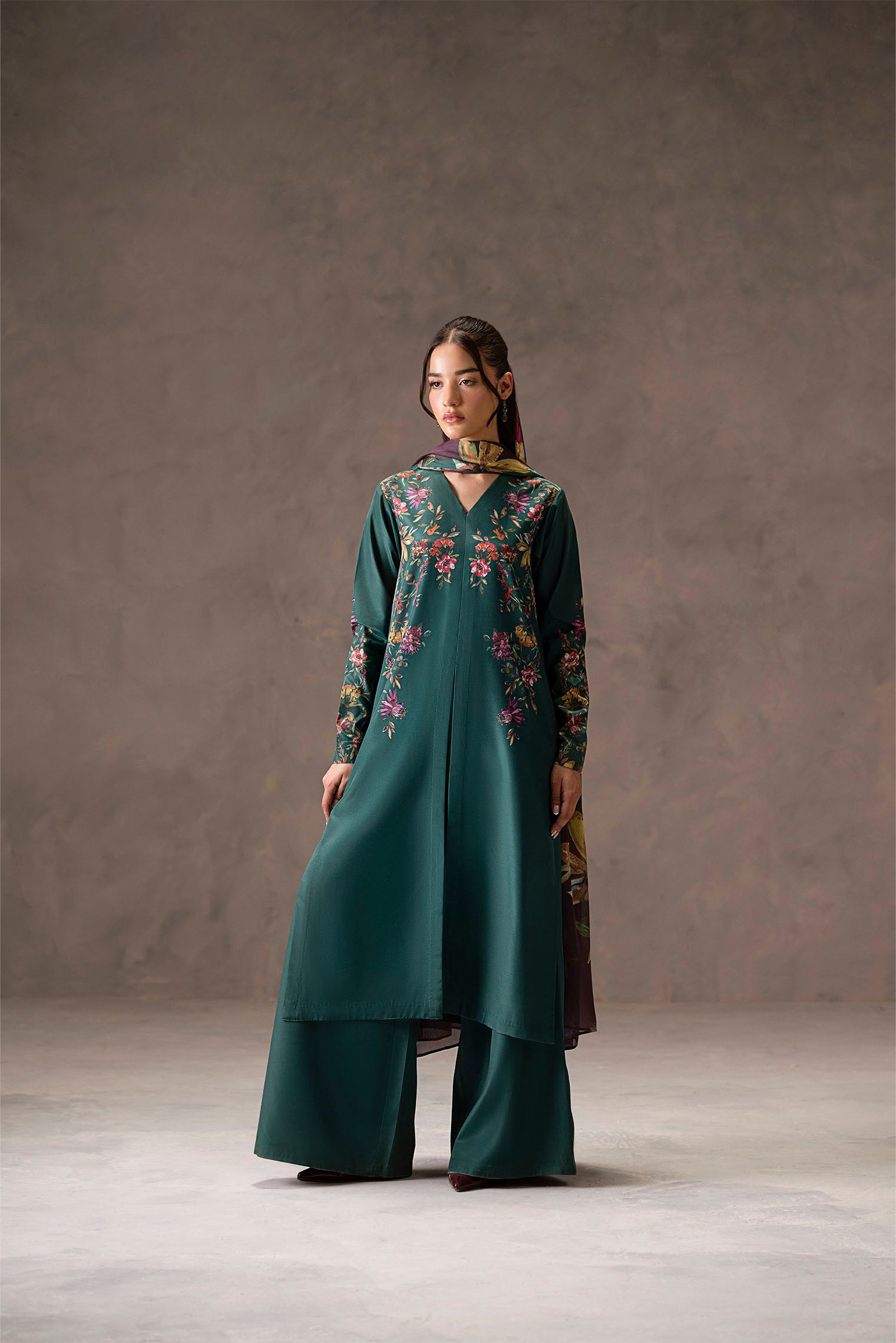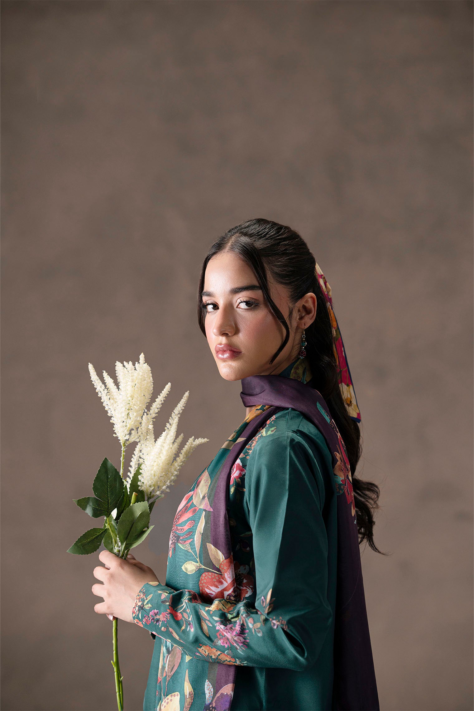 Drape yourself in sophistication with this stitched 3-piece ensemble, featuring a front-open printed poly lawn shirt in a rich bottle green hue. The flowing apple silk dupatta complements the look with its exquisite print, adding an effortless charm. Paired with solid poly lawn trousers, this outfit blends comfort with timeless elegance—perfect for any occasion.