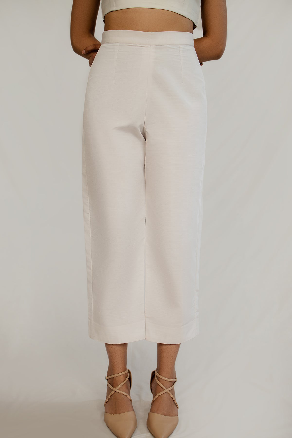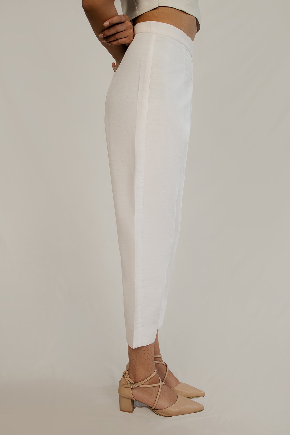 These tapered pants made in Poly Khaddar fabric feature a semi elasticated waist band center zipper opening and hook & eye closure.