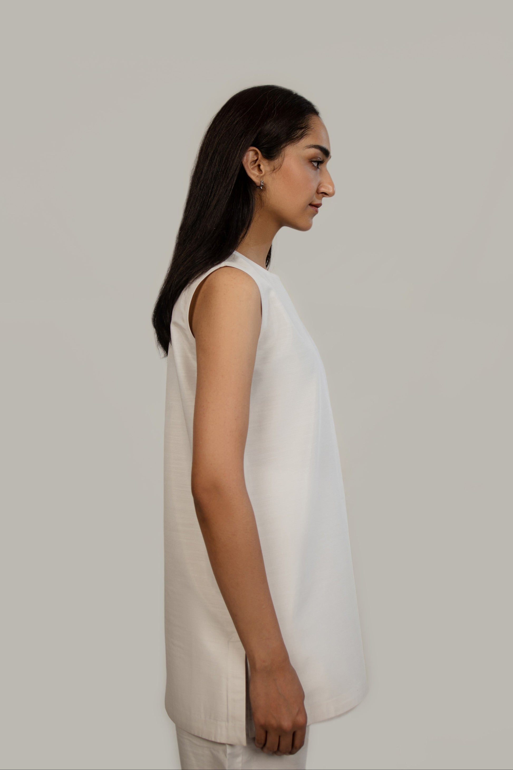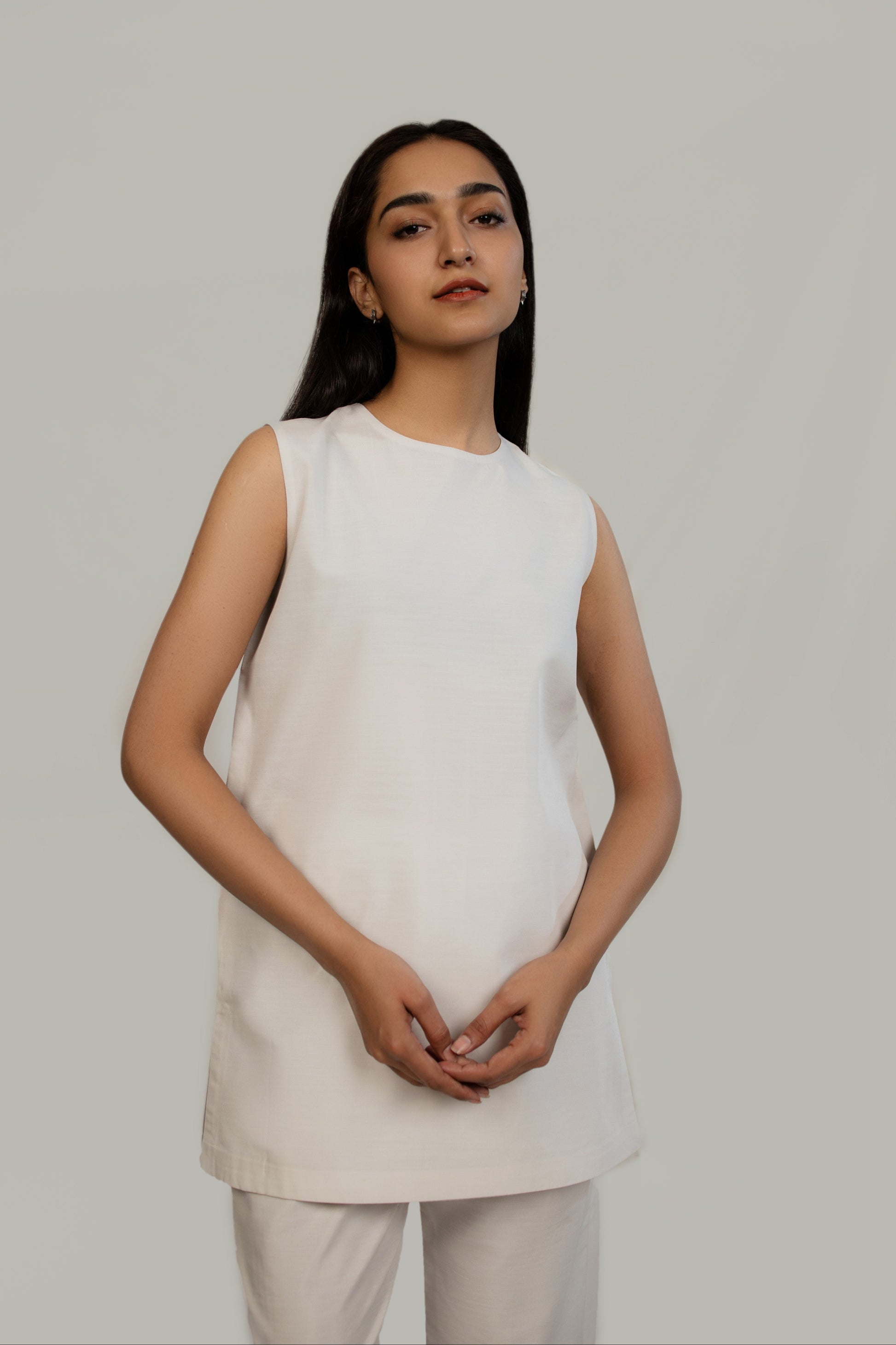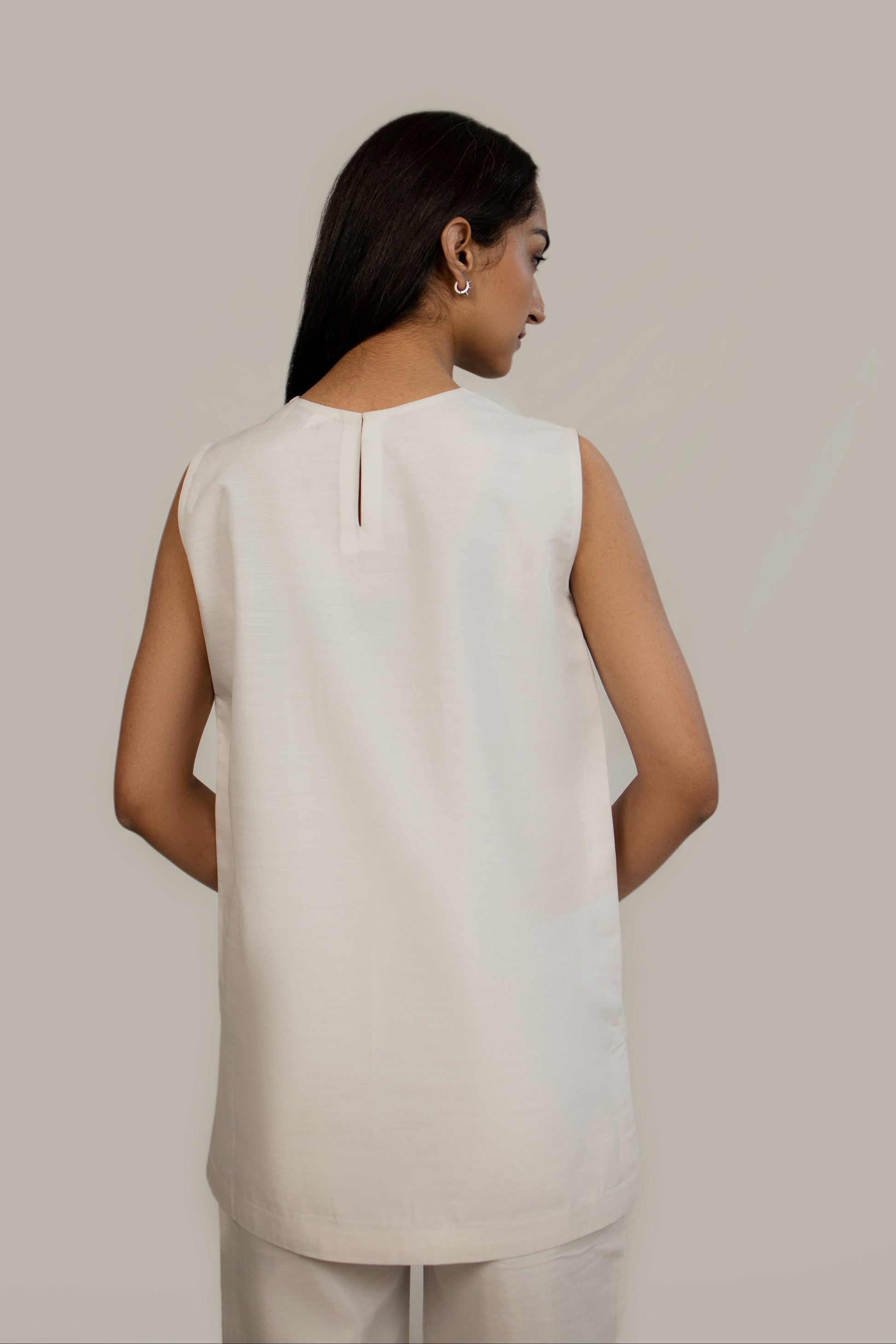 This sleeveless ivory undershirt made of Poly Khaddar fabric features a boat neckline and side slits.