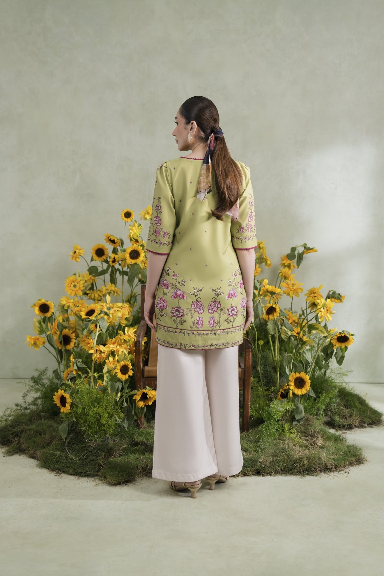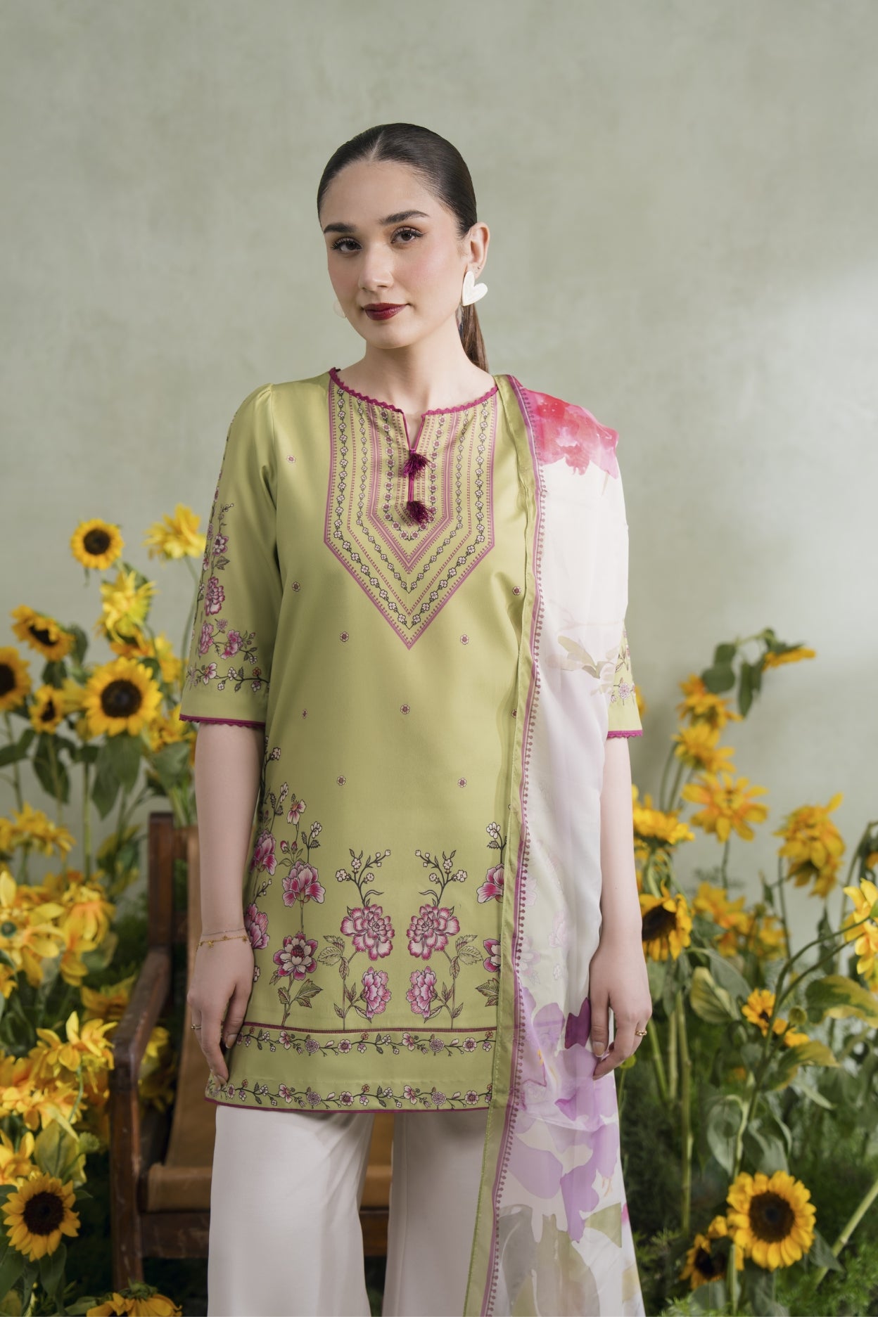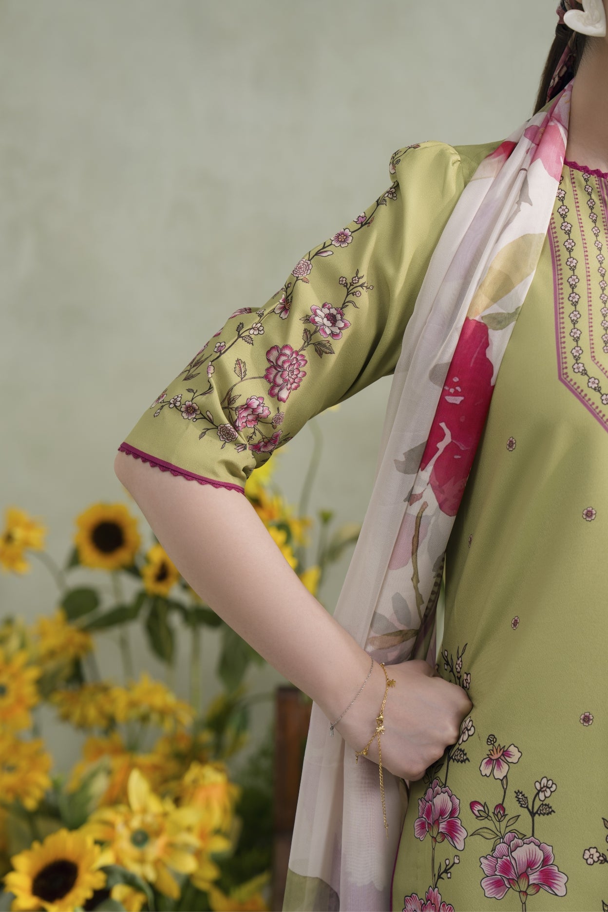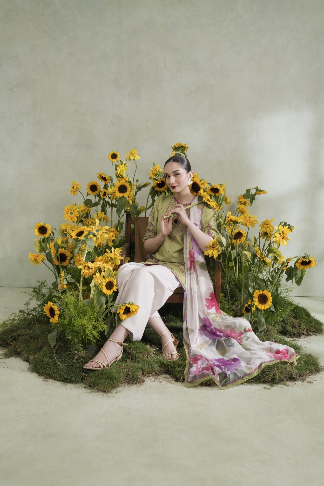 A refreshing green ensemble adorned with delicate embroidery and paired with soft white trousers. The floral printed dupatta adds a touch of romance and grace — a perfect ode to effortless charm.