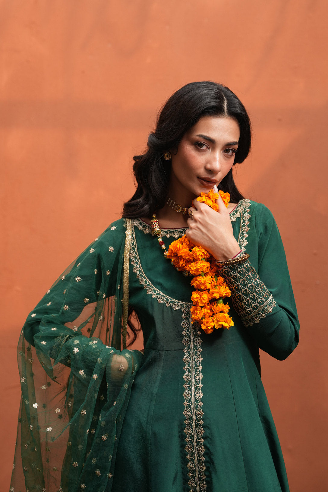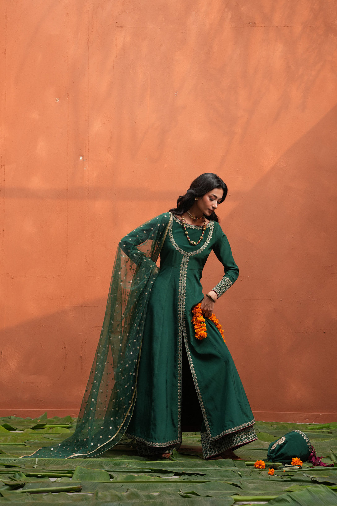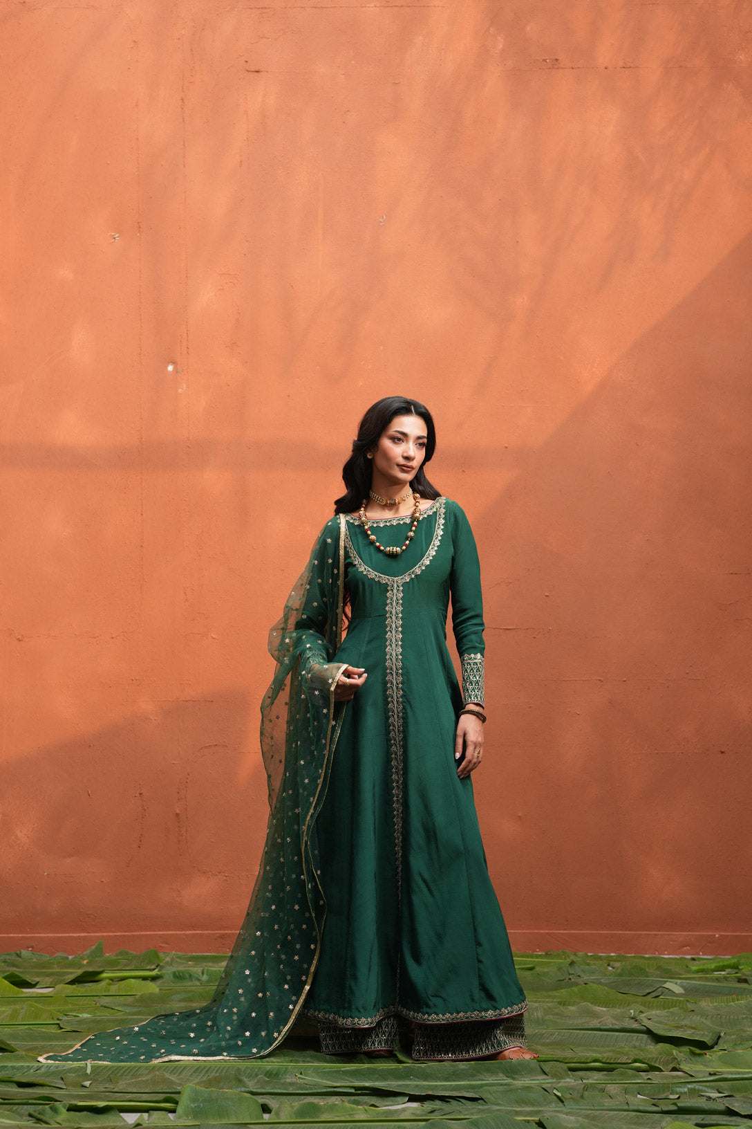 Drenched in opulence, this deep green raw silk ensemble is a masterpiece of elegance. The intricately adda work embroidered bodice flows into a voluminous silhouette, exuding regal charm. Paired with a rich organza and apple silk dupatta, this look is a celebration of timeless luxury and grace.