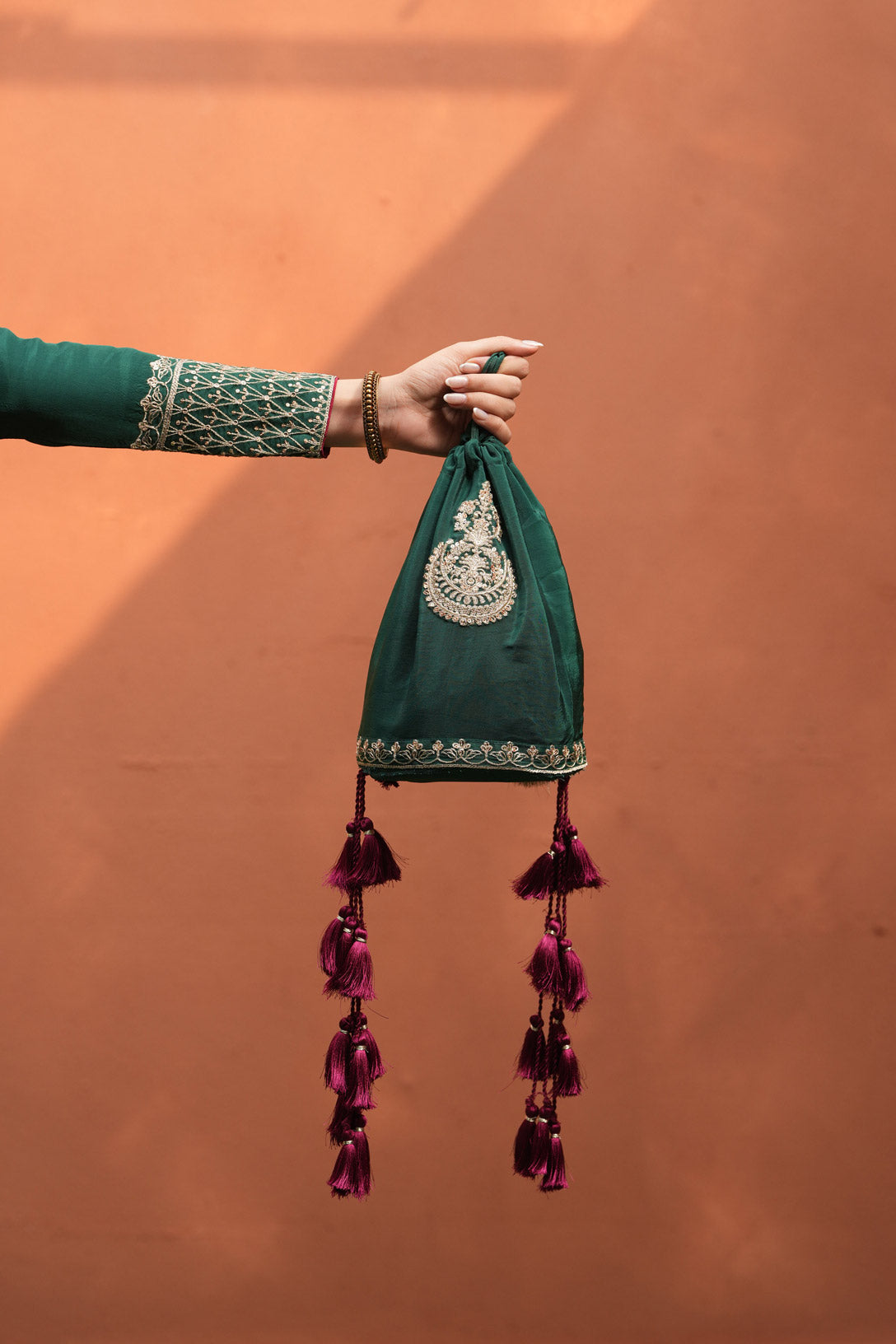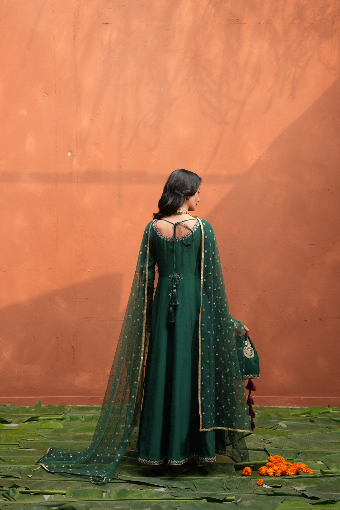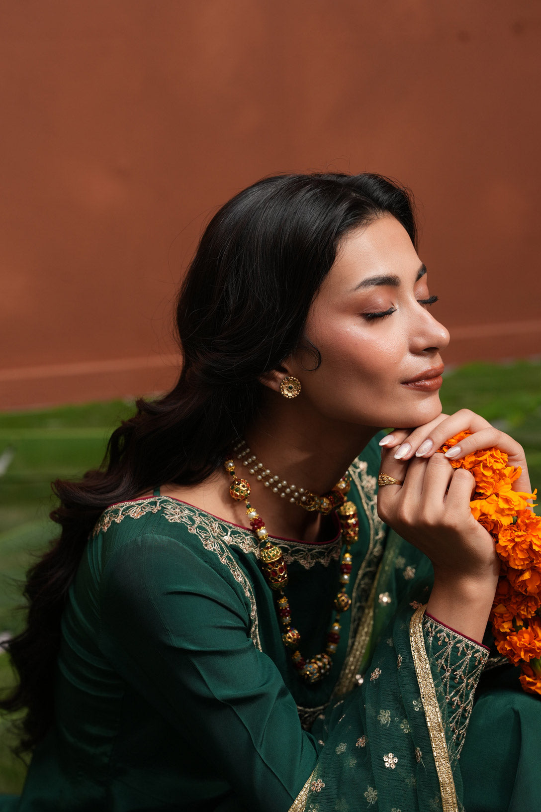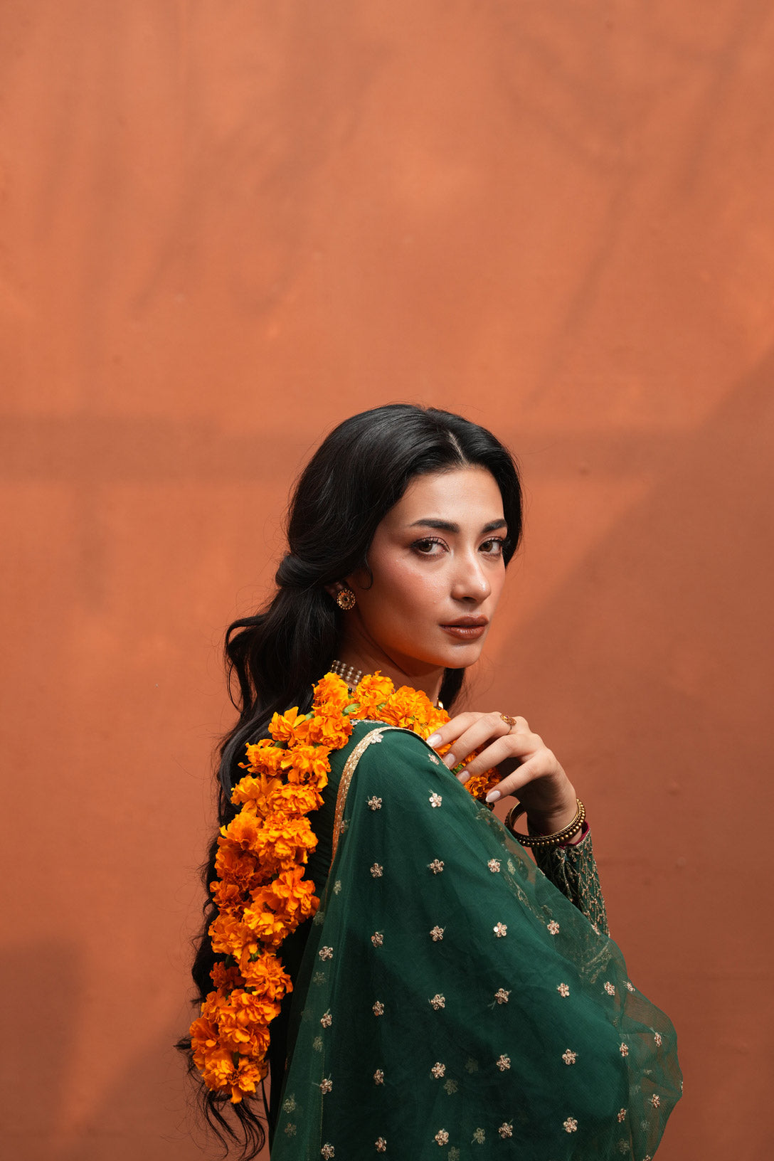 Drenched in opulence, this deep green raw silk ensemble is a masterpiece of elegance. The intricately adda work embroidered bodice flows into a voluminous silhouette, exuding regal charm. Paired with a rich organza and apple silk dupatta, this look is a celebration of timeless luxury and grace.