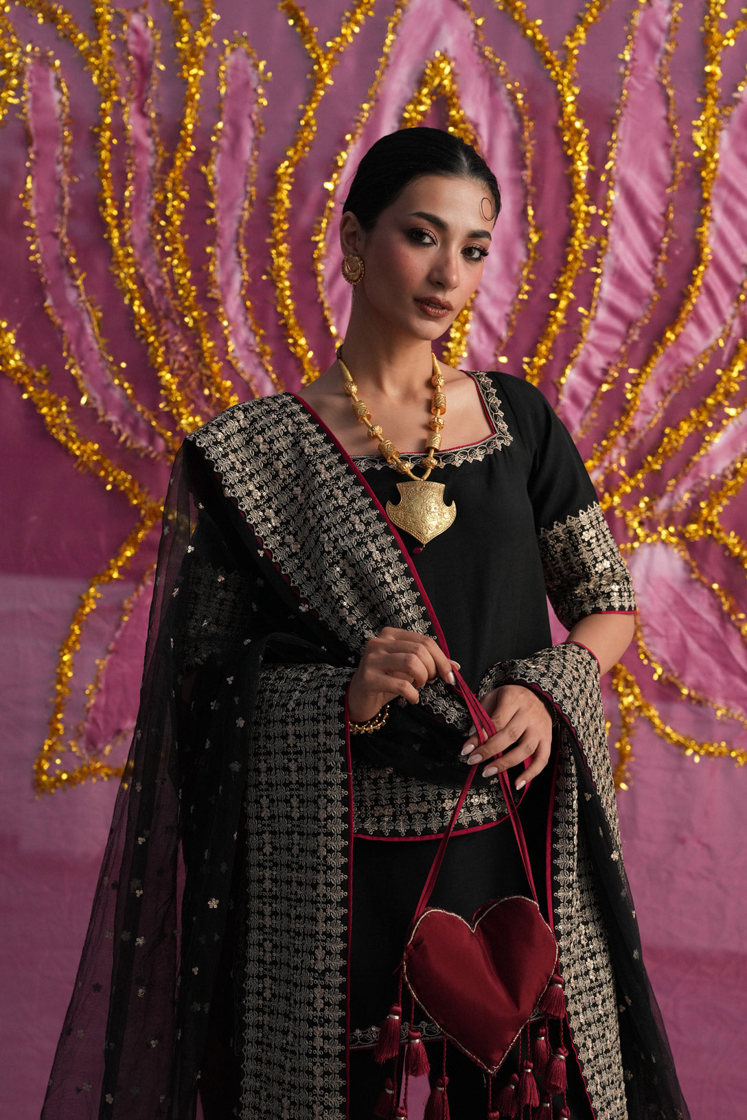 A striking black ensemble crafted with modern sophistication and traditional charm. The rich raw silk base paired with intricate detailing creates a statement look perfect for festive events and formal gatherings.
