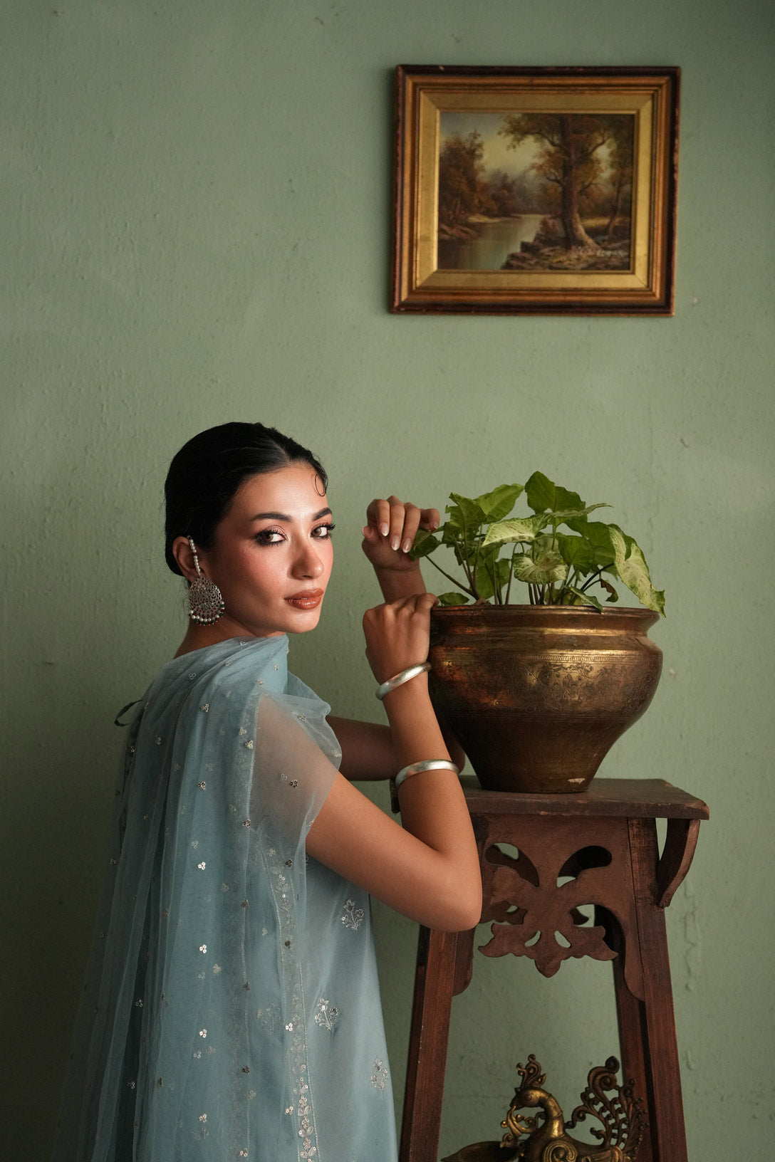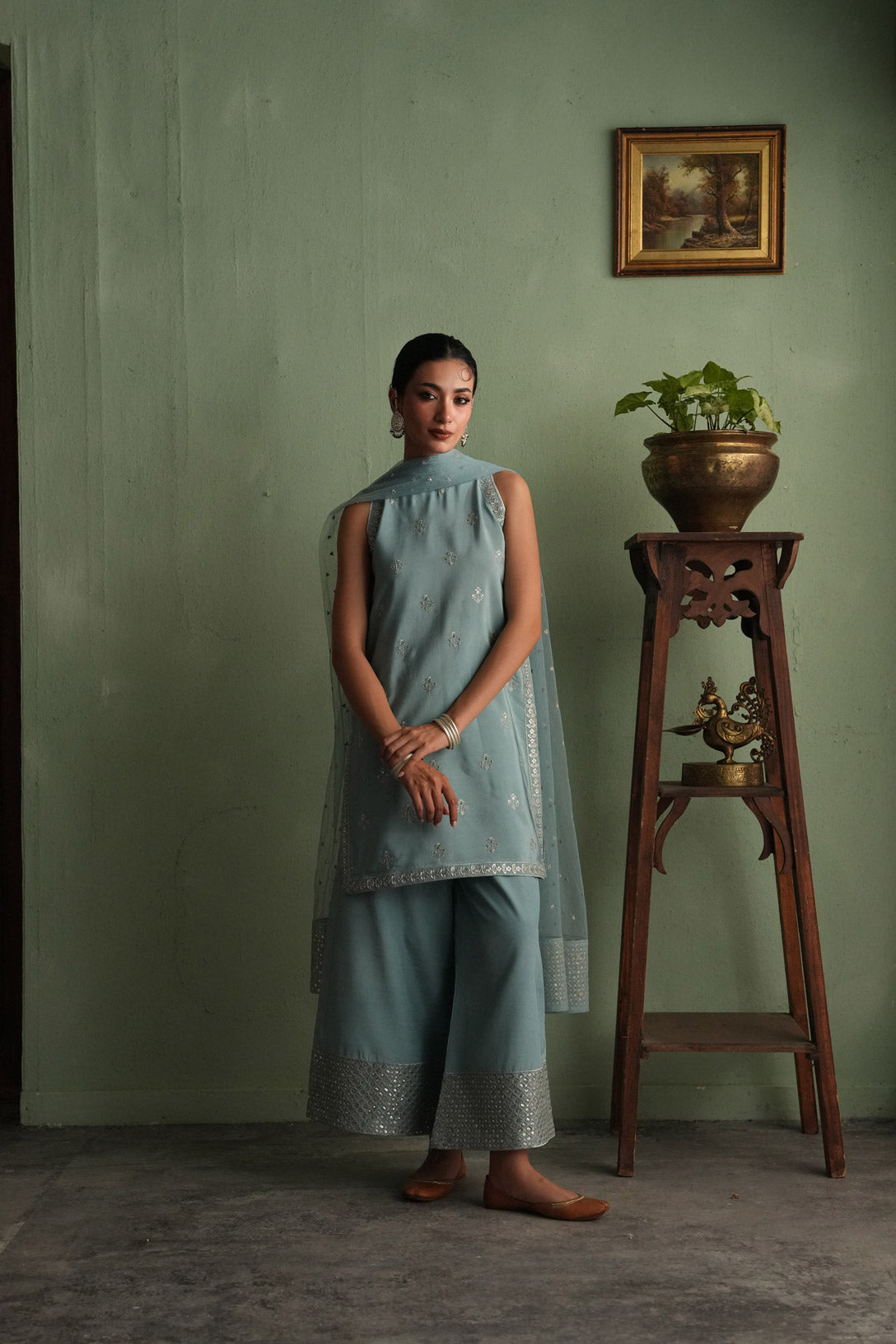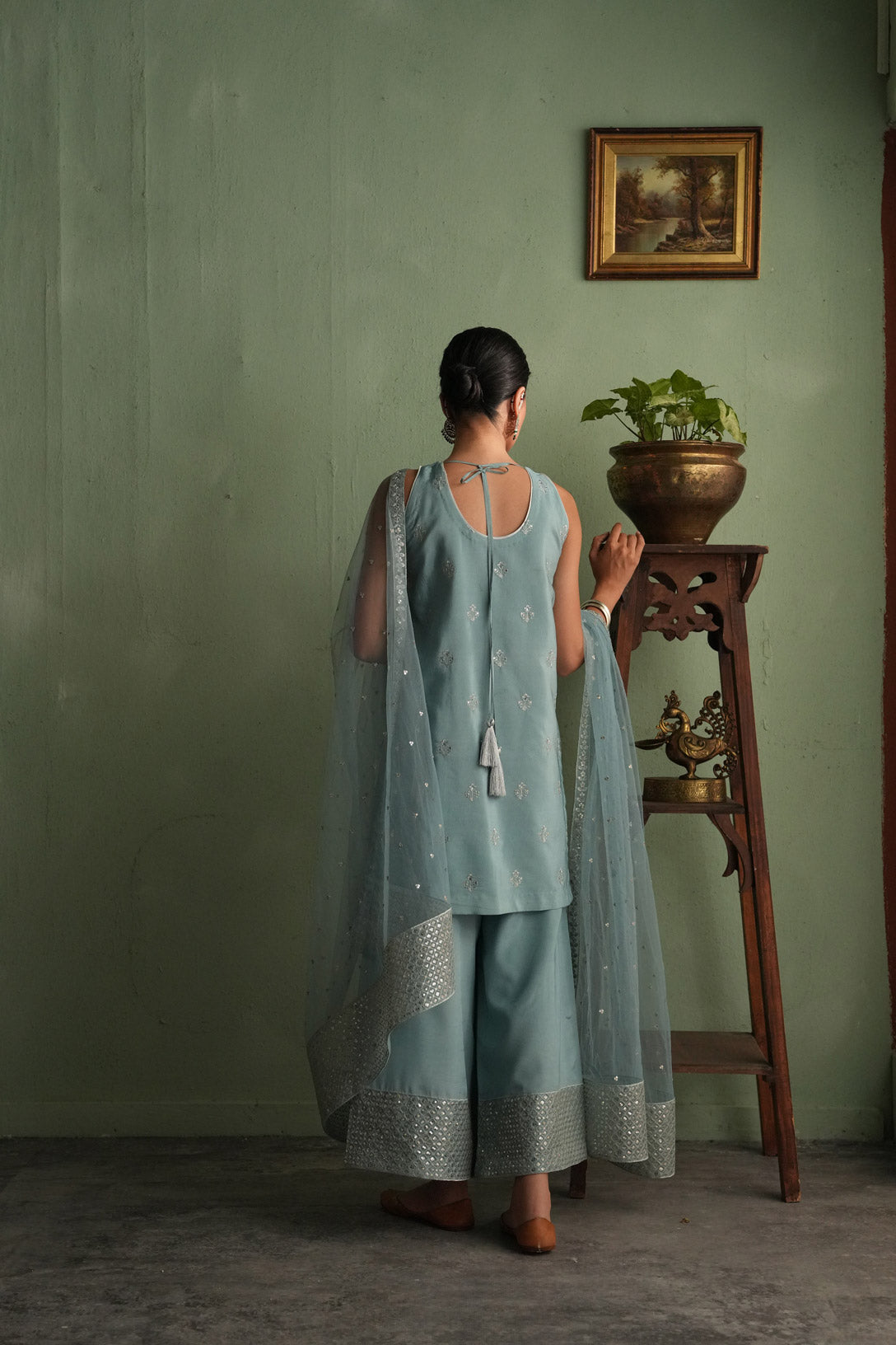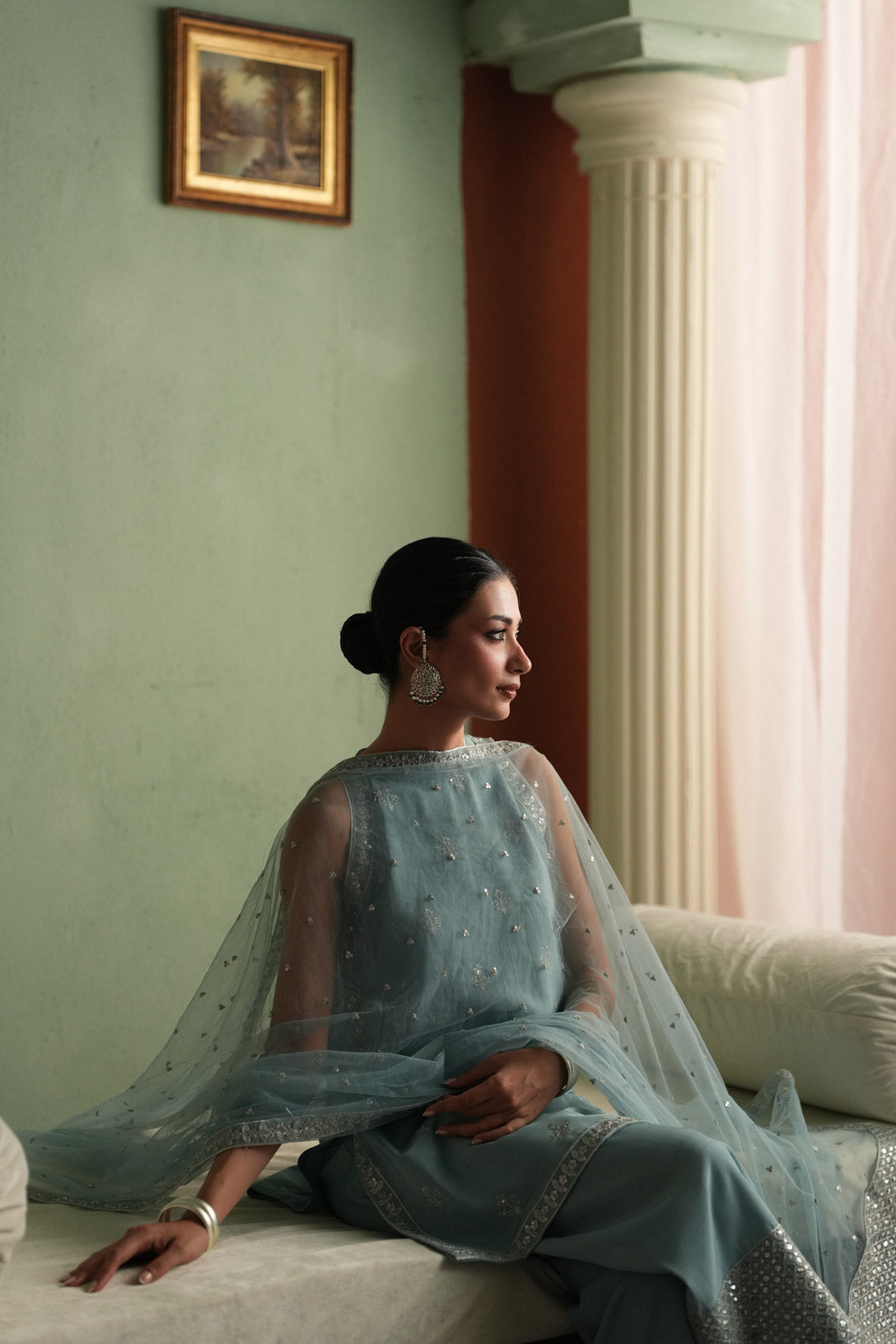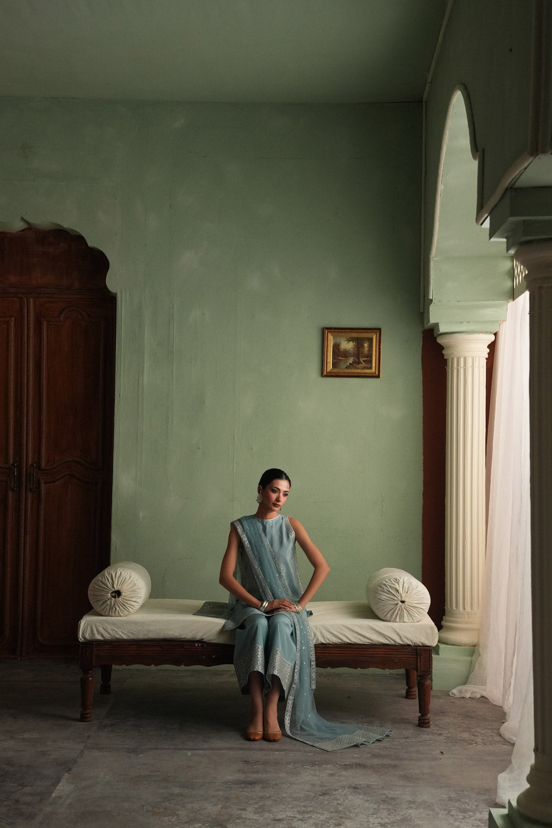 A beautifully serene ensemble crafted in premium raw silk, designed to bring effortless sophistication to your wardrobe. The soft blue hue paired with delicate embellishments creates a refined look perfect for daytime events, gatherings, or elegant casual wear. The structured silhouette adds grace, while the minimal detailing keeps it timeless.