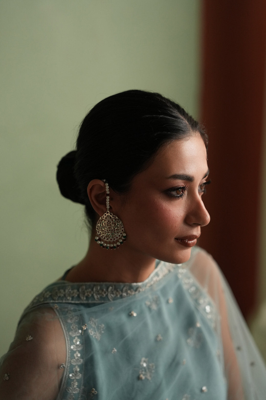 A raw silk shirt adorned with subtle embroidered motifs and finished with delicate borders. Paired with matching raw silk Pants featuring intricately worked hem for added refinement. The look is completed with a net dupatta softly embellished to enhance the outfit’s feminine charm.