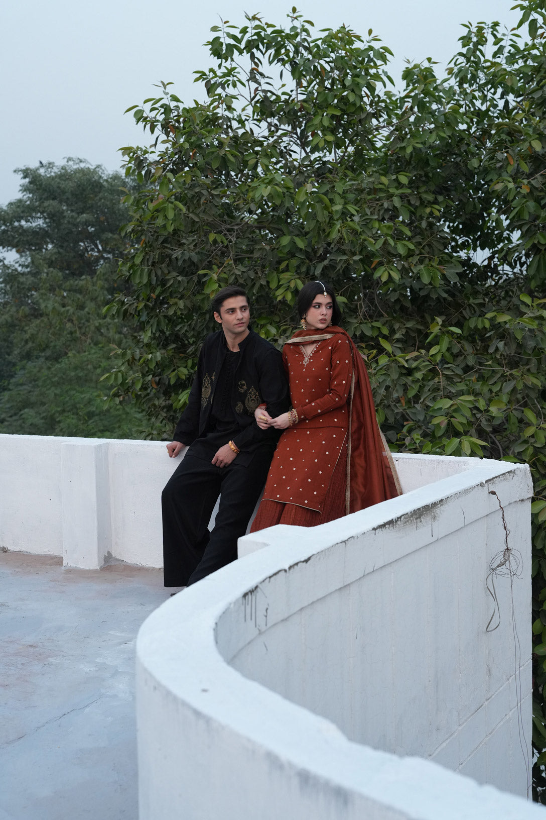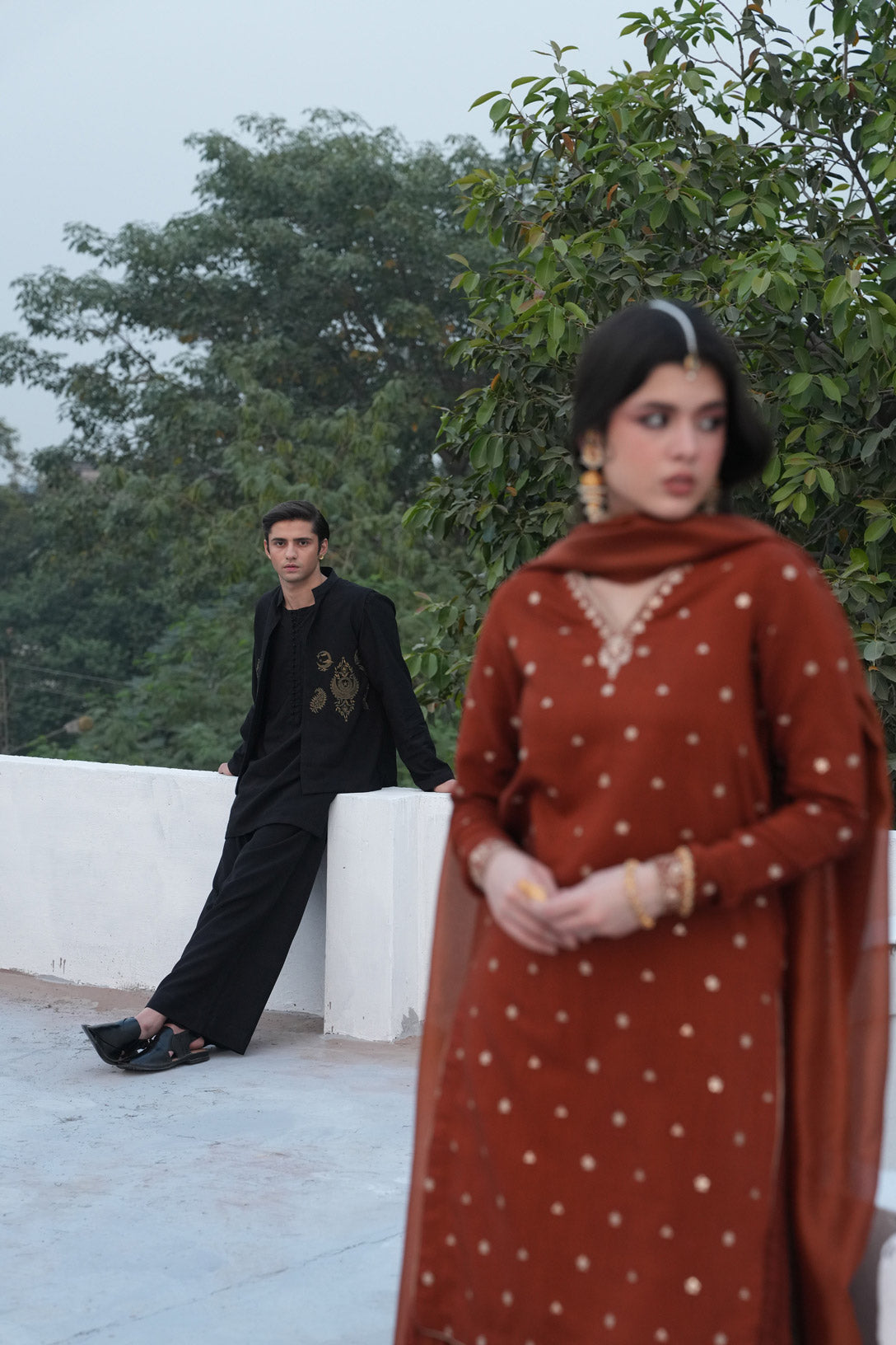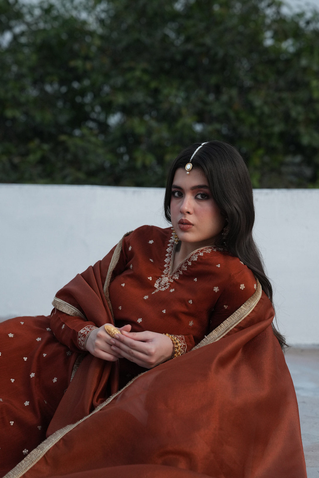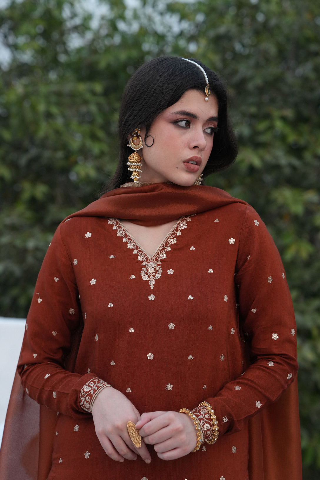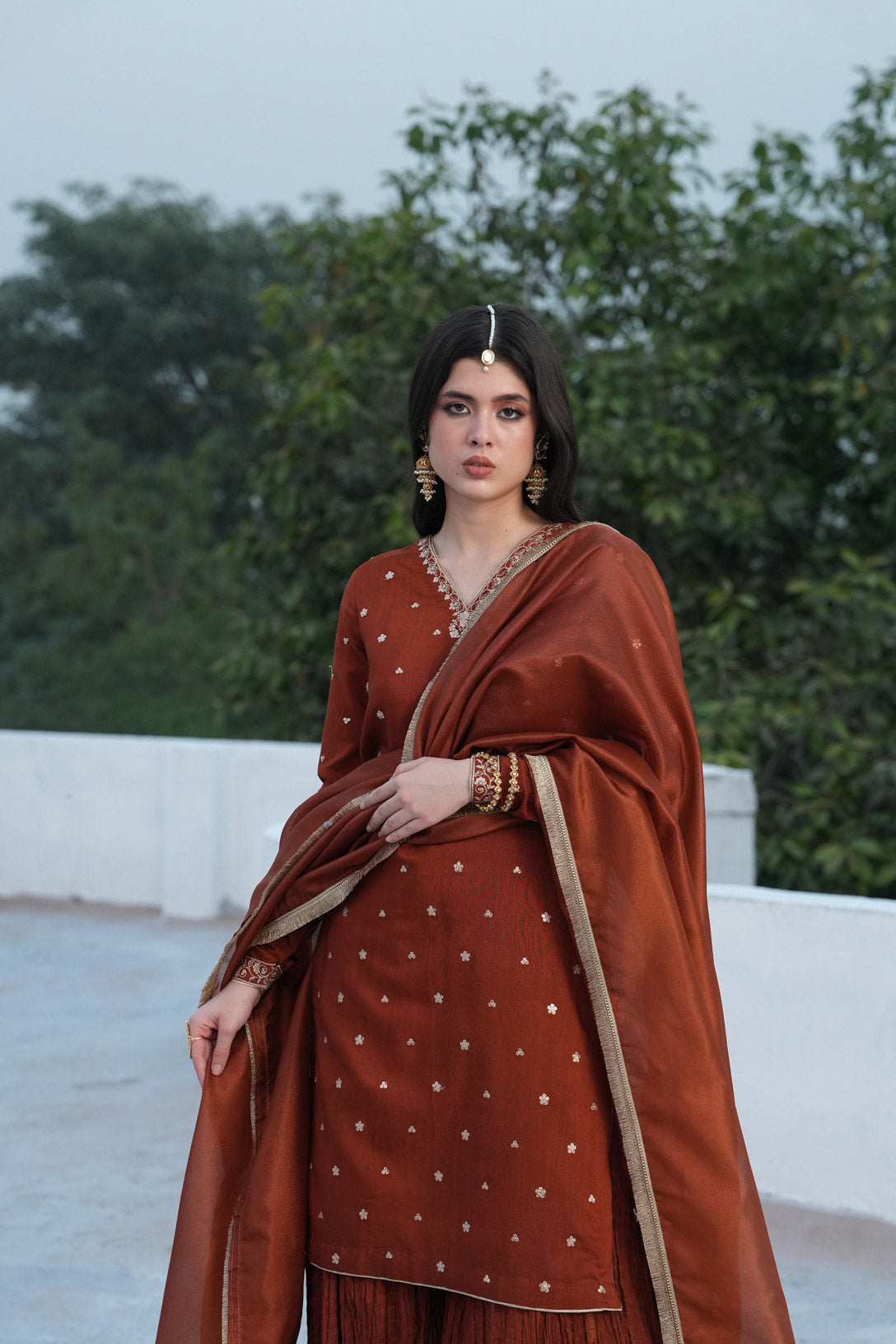 A captivating rust-toned ensemble that beautifully blends traditional elegance with modern refinement. The warm hue paired with luxurious textures creates a graceful and timeless festive look.