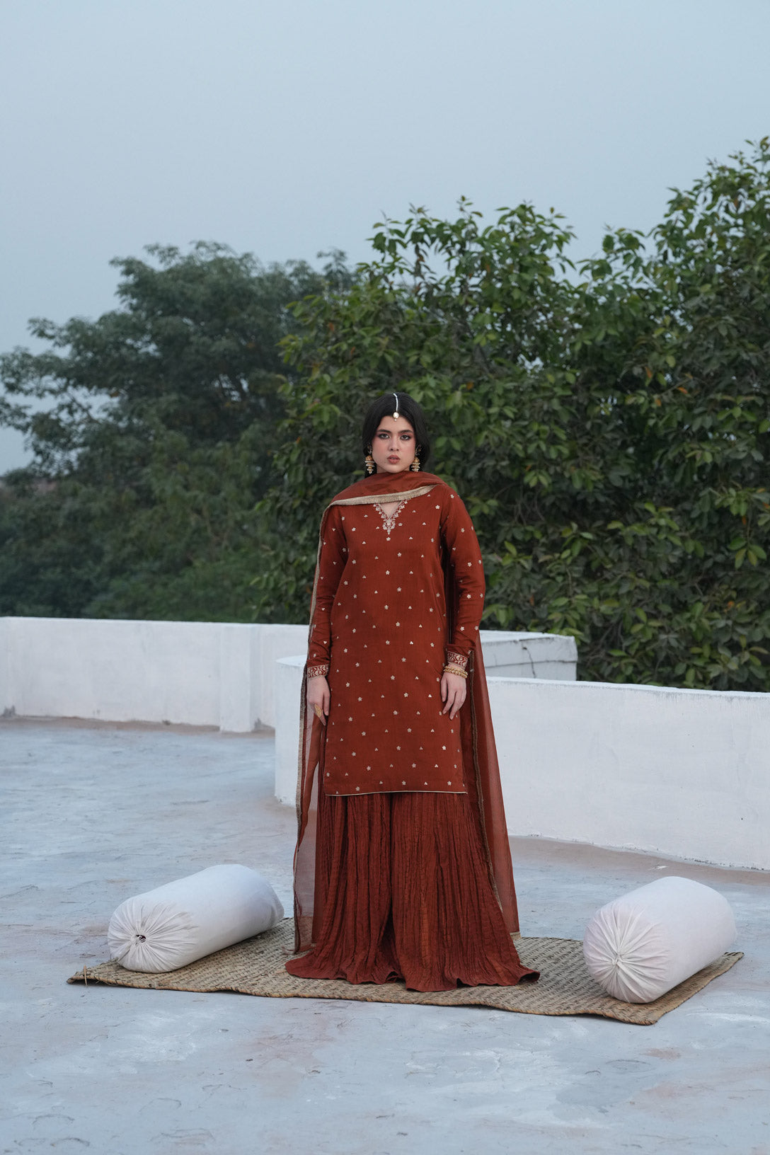 Shirt: Raw Silk Sharara: Crushed Raw Silk Dupatta: Zari Net Color: Rust