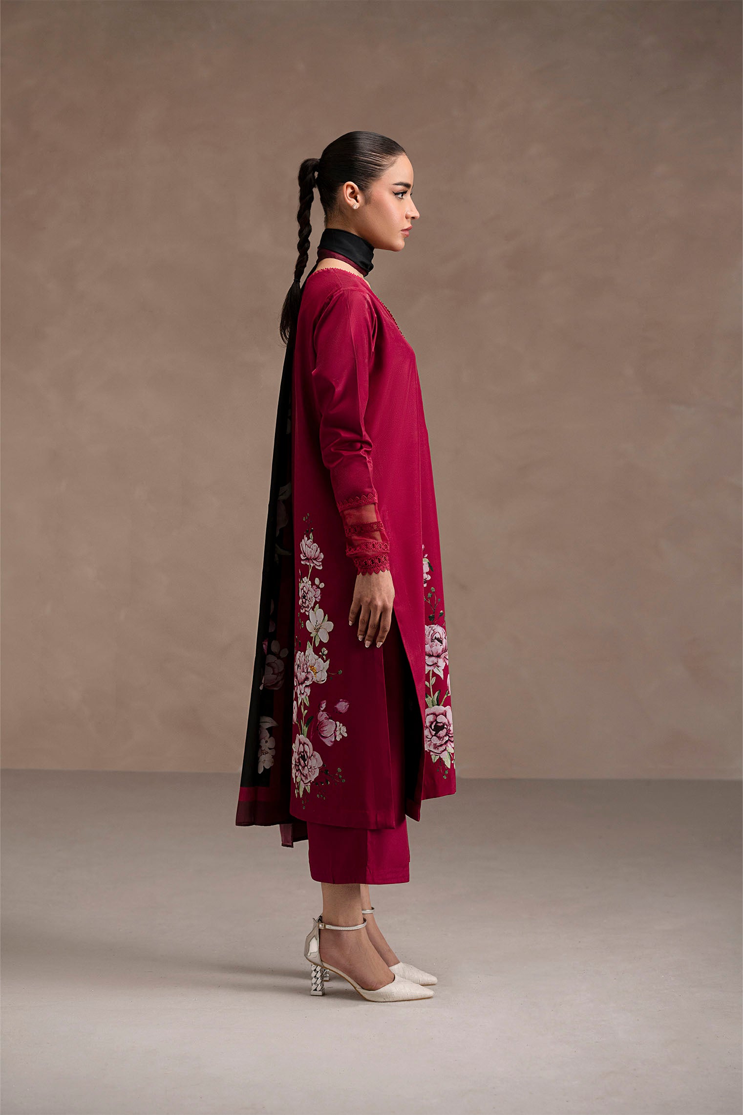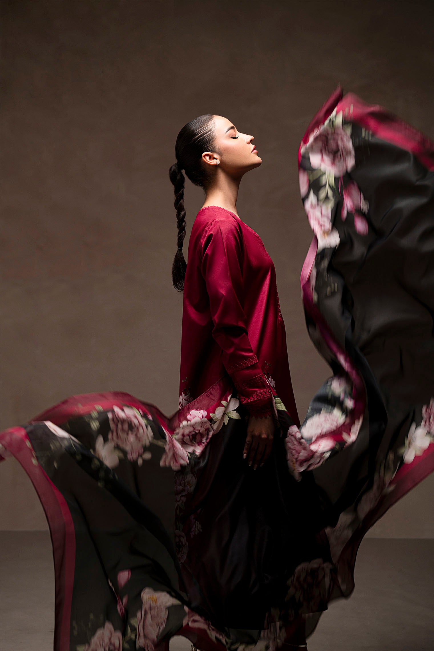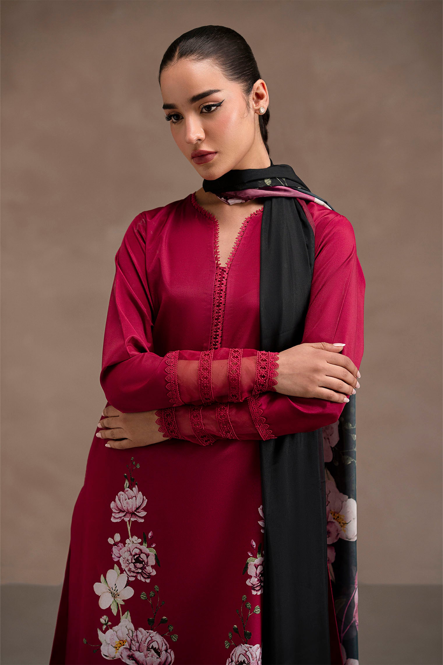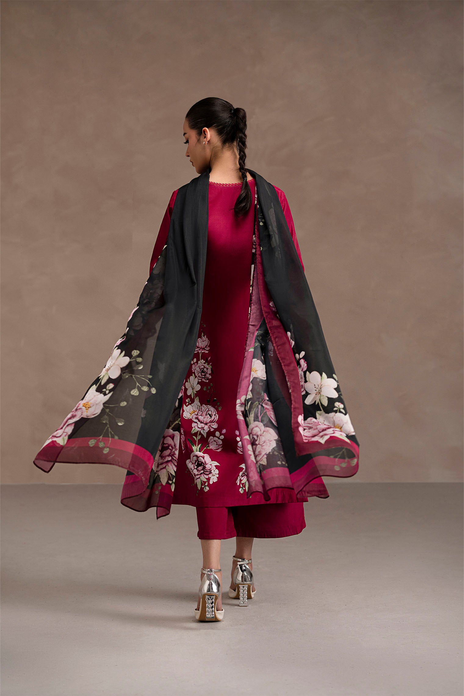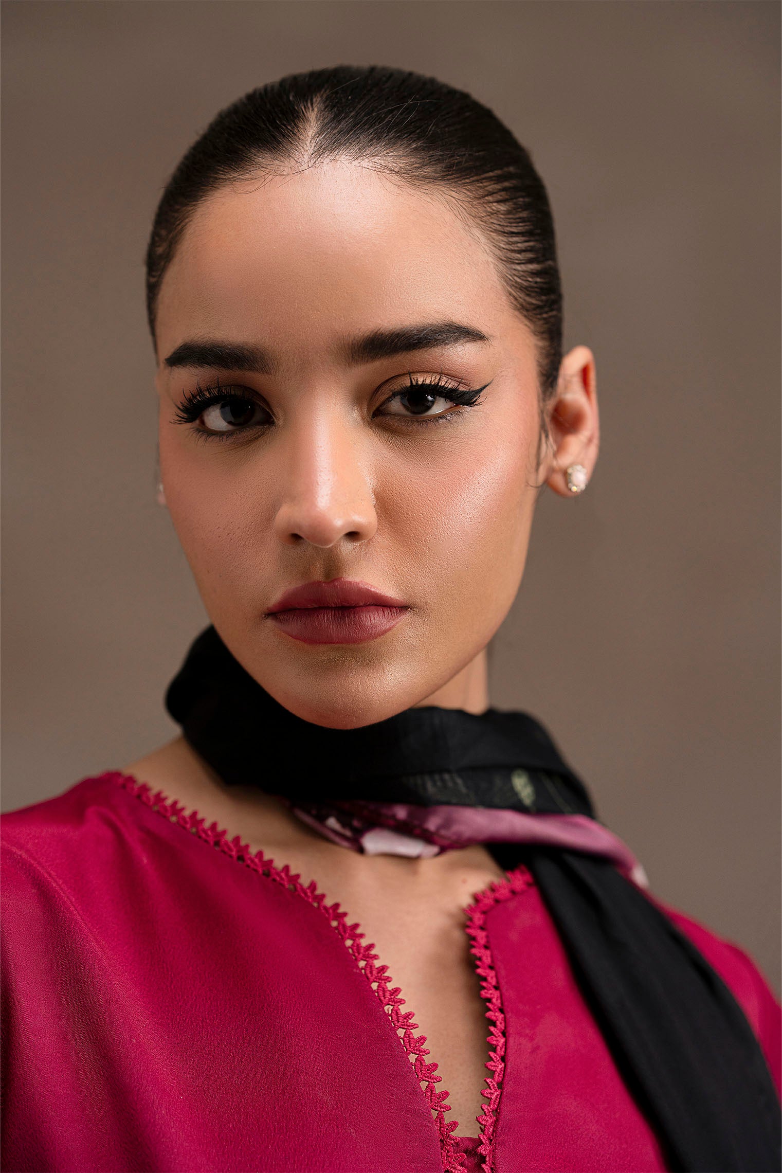 This elegant hot pink stitched 3-piece outfit features a beautifully printed poly lawn shirt adorned with delicate floral print, offering a graceful yet modern appeal. Paired with solid trousers for a comfortable yet stylish fit, the look is completed with a contrasting black printed dupatta, adding a touch of sophistication to the ensemble.