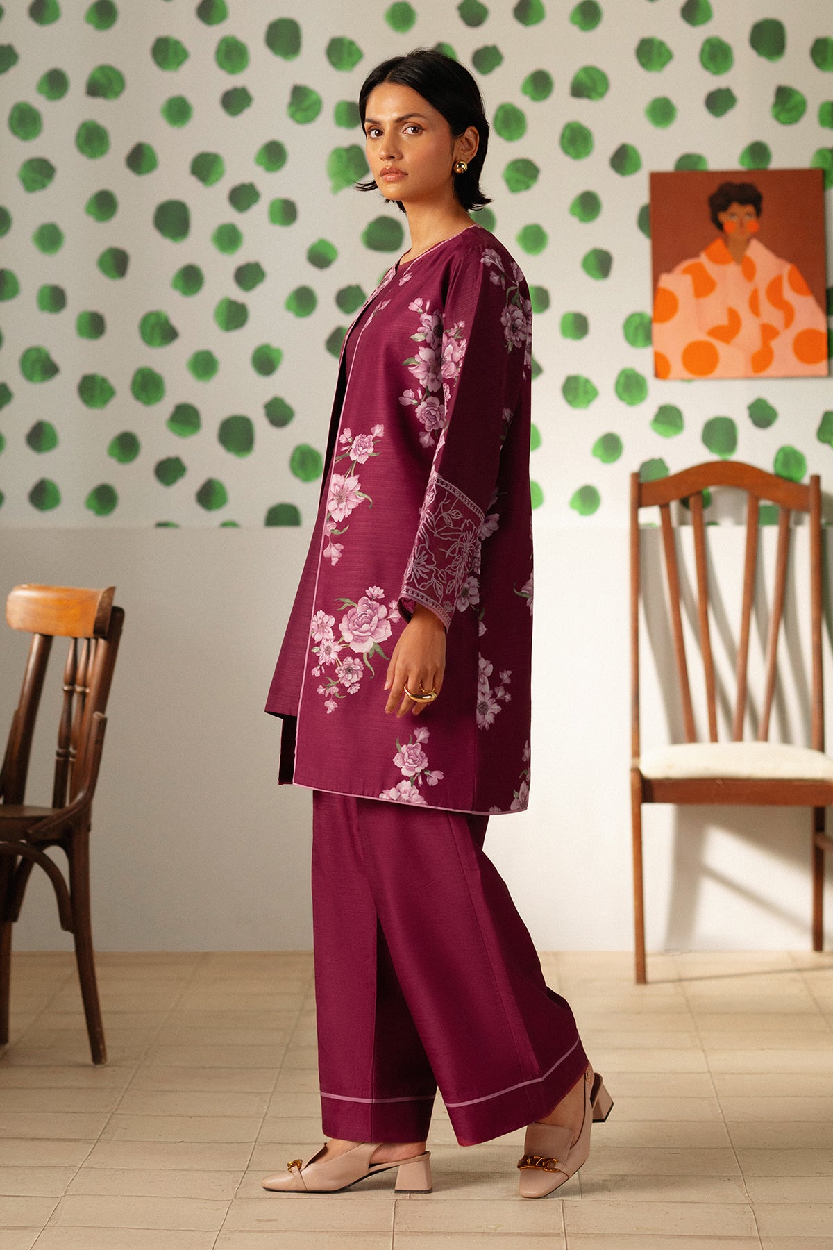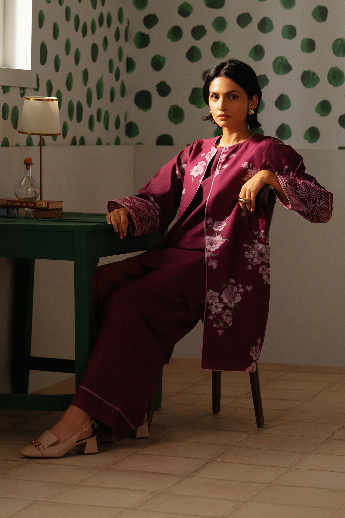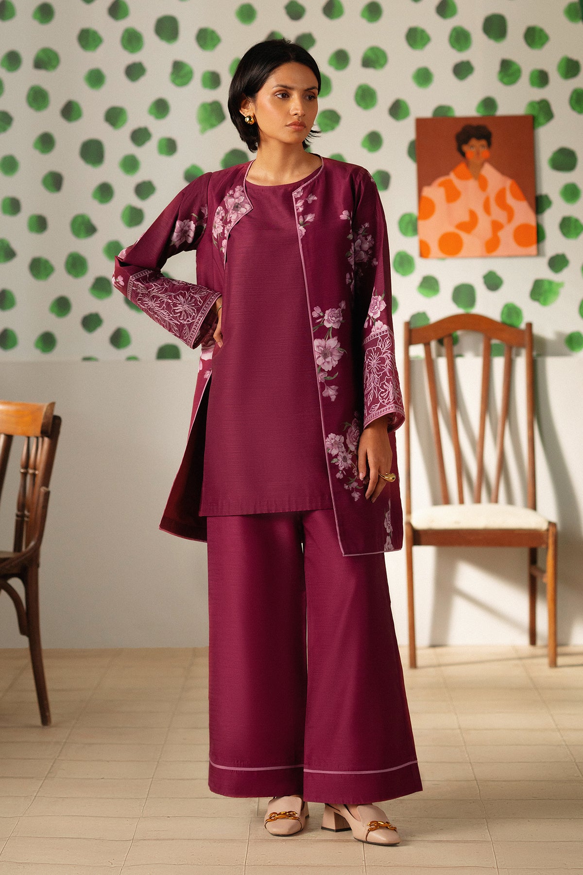 Printed Magenta Shrug with embroidered sleeves paired with plain magenta Inner shirt and wide-leg trousers.
