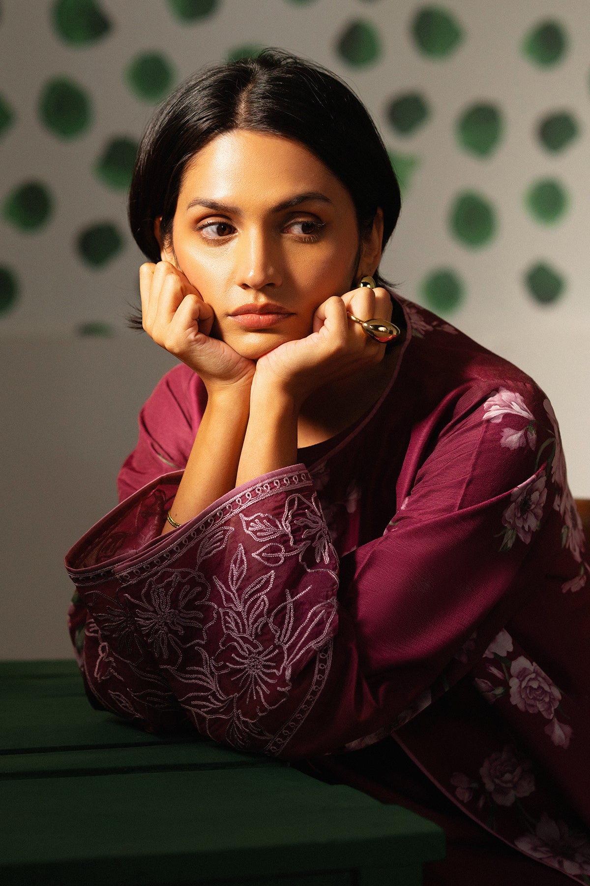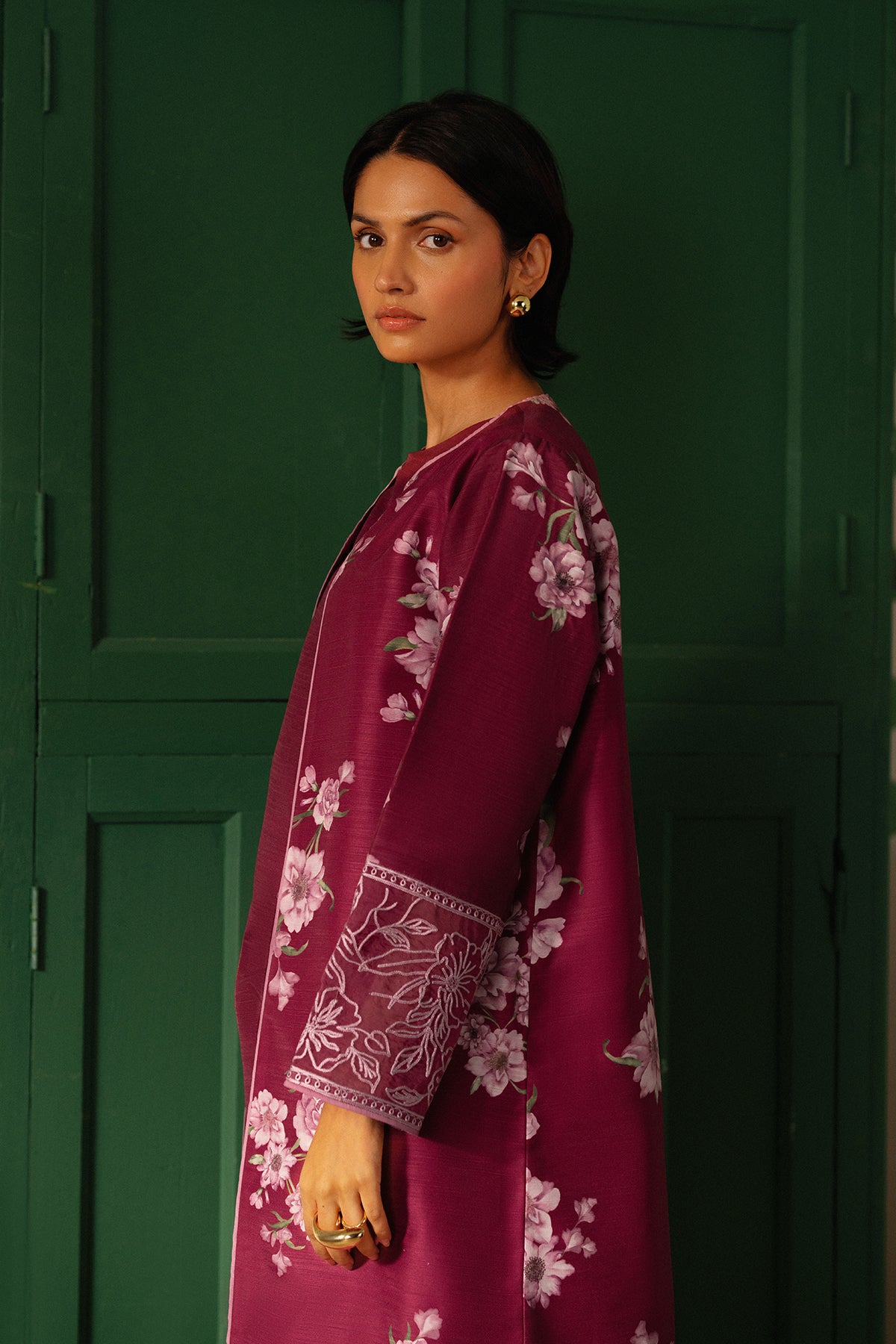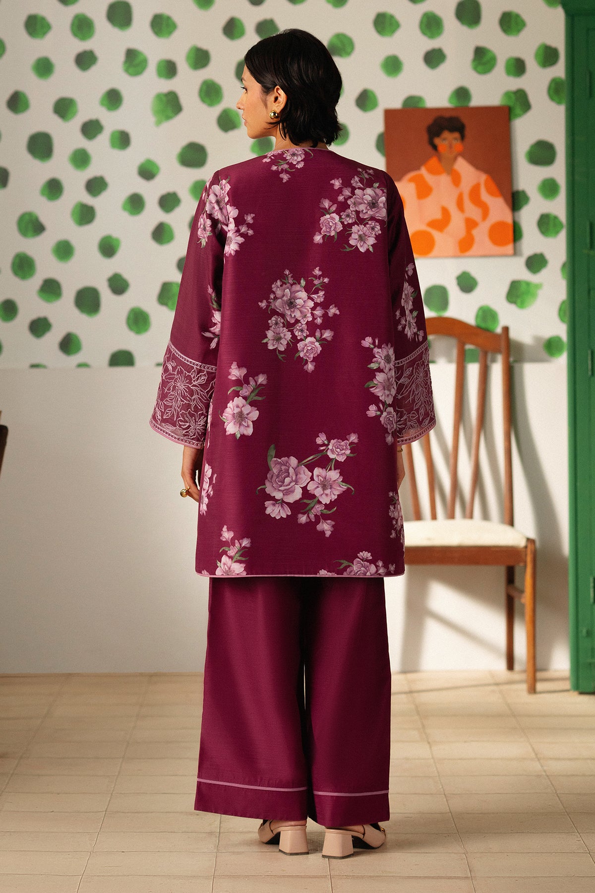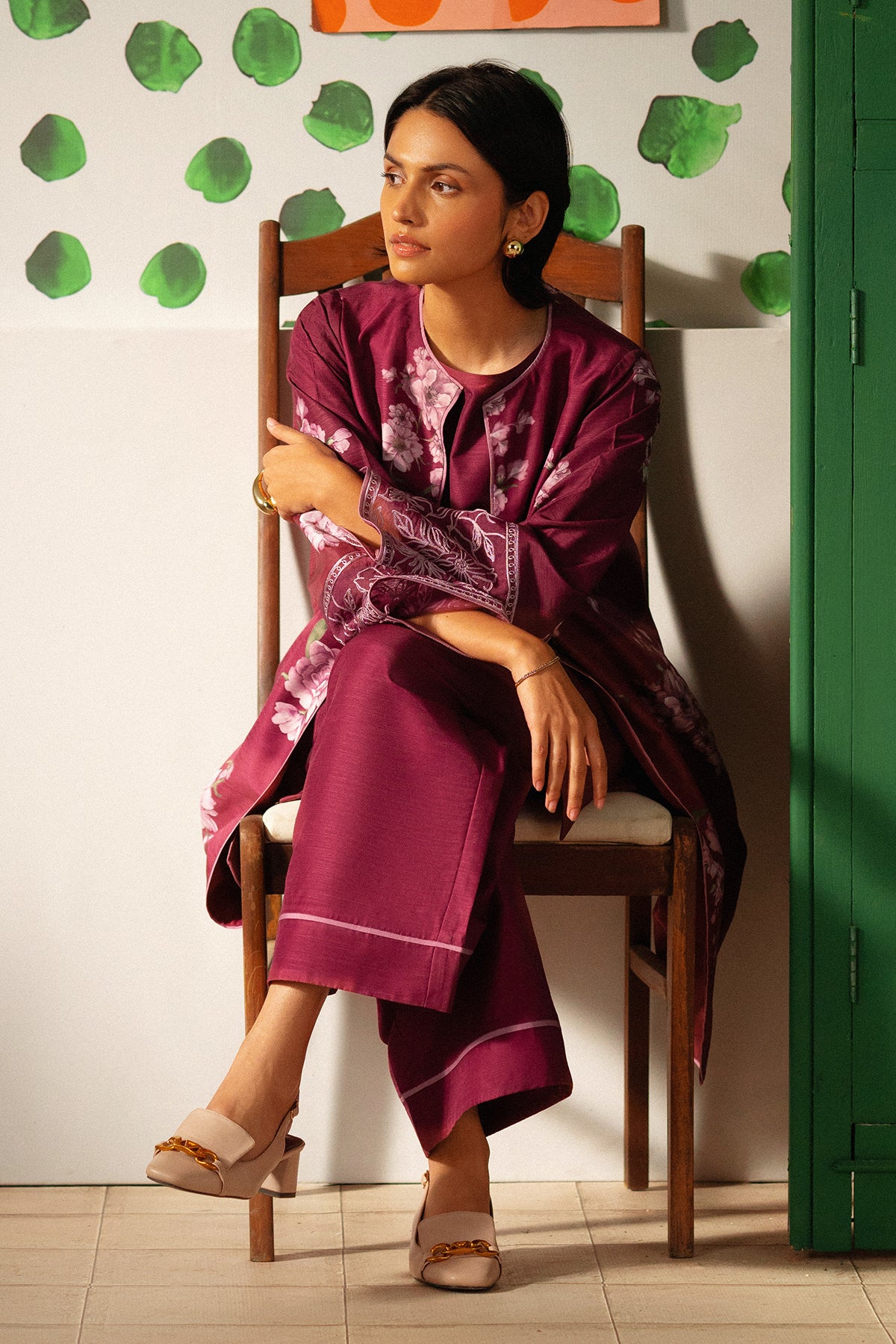 Printed Magenta Shrug with embroidered sleeves paired with plain magenta Inner shirt and wide-leg trousers.