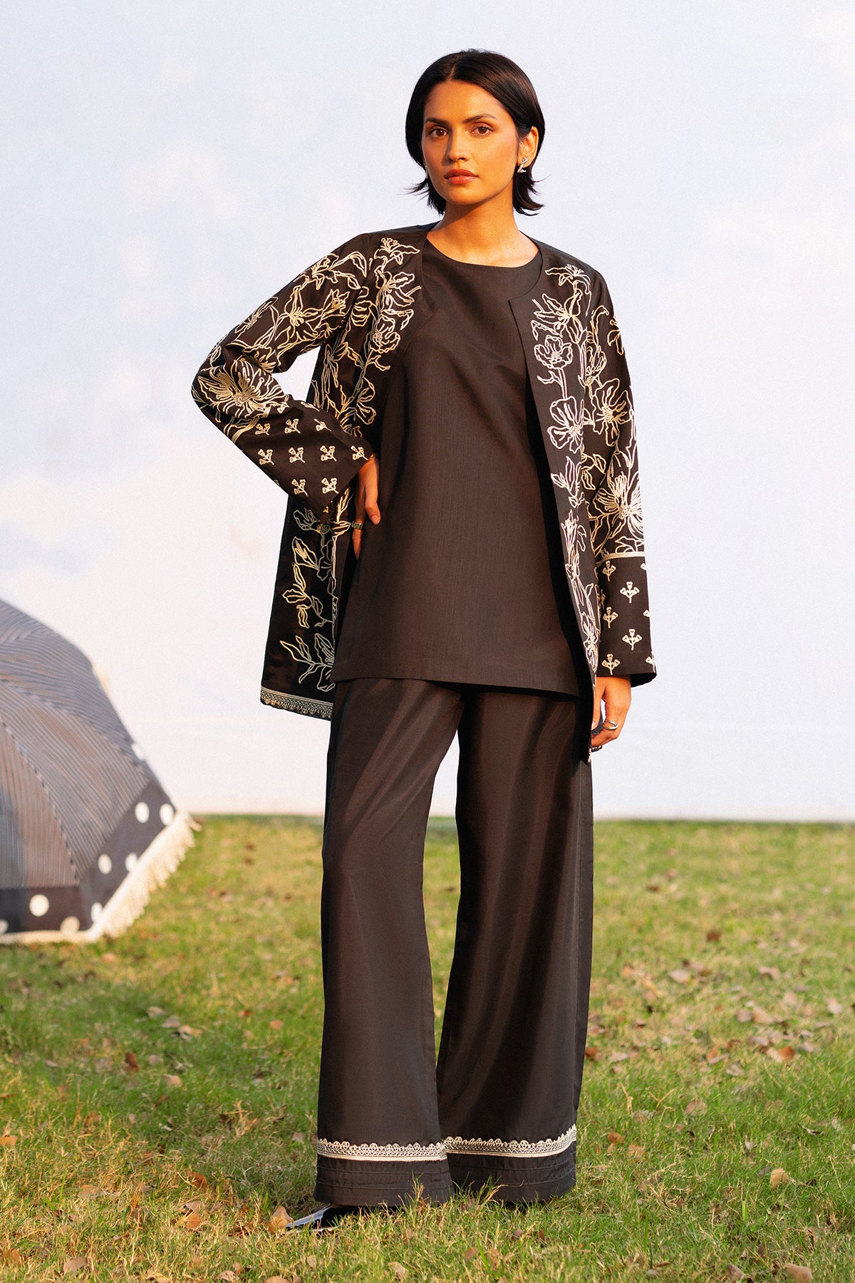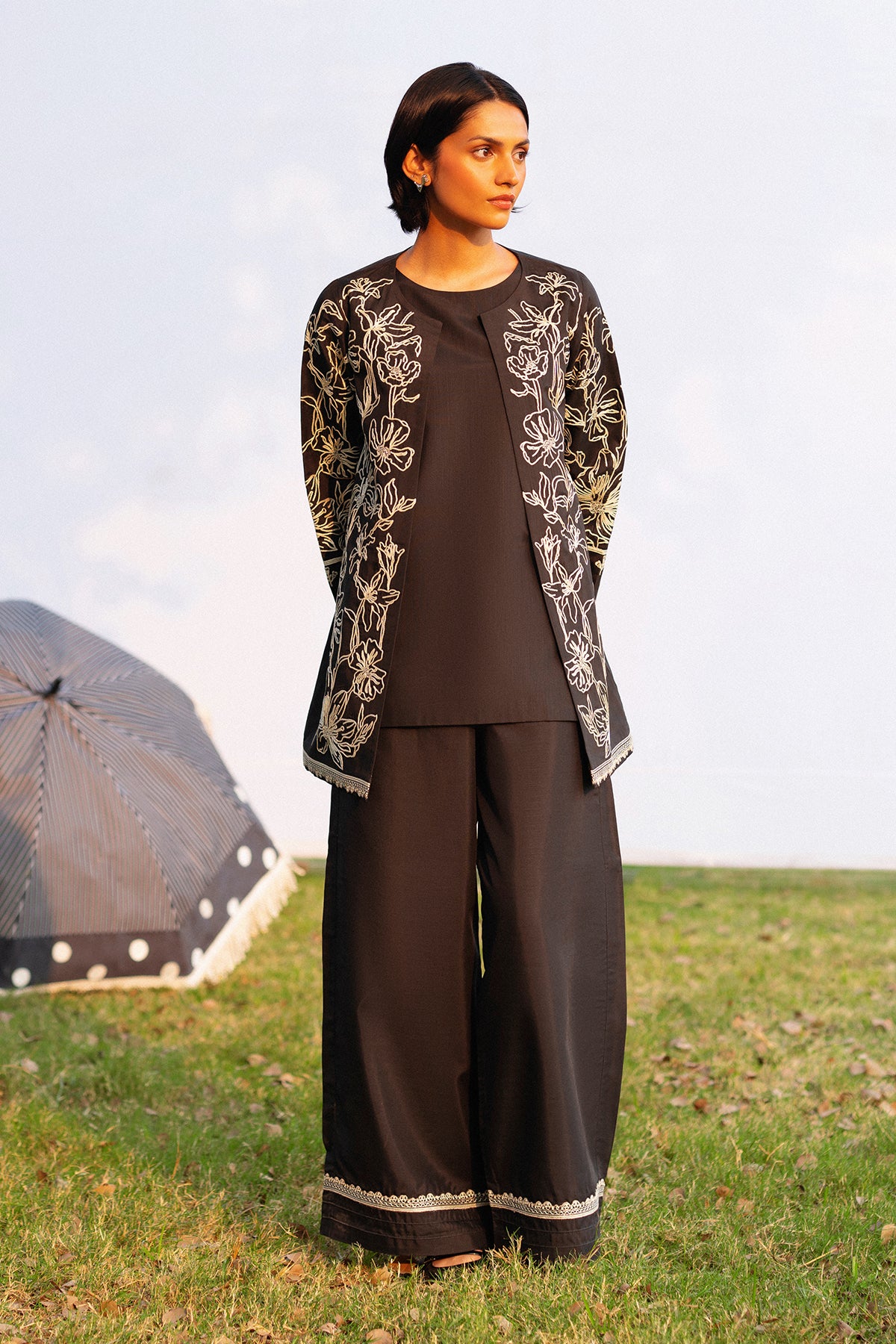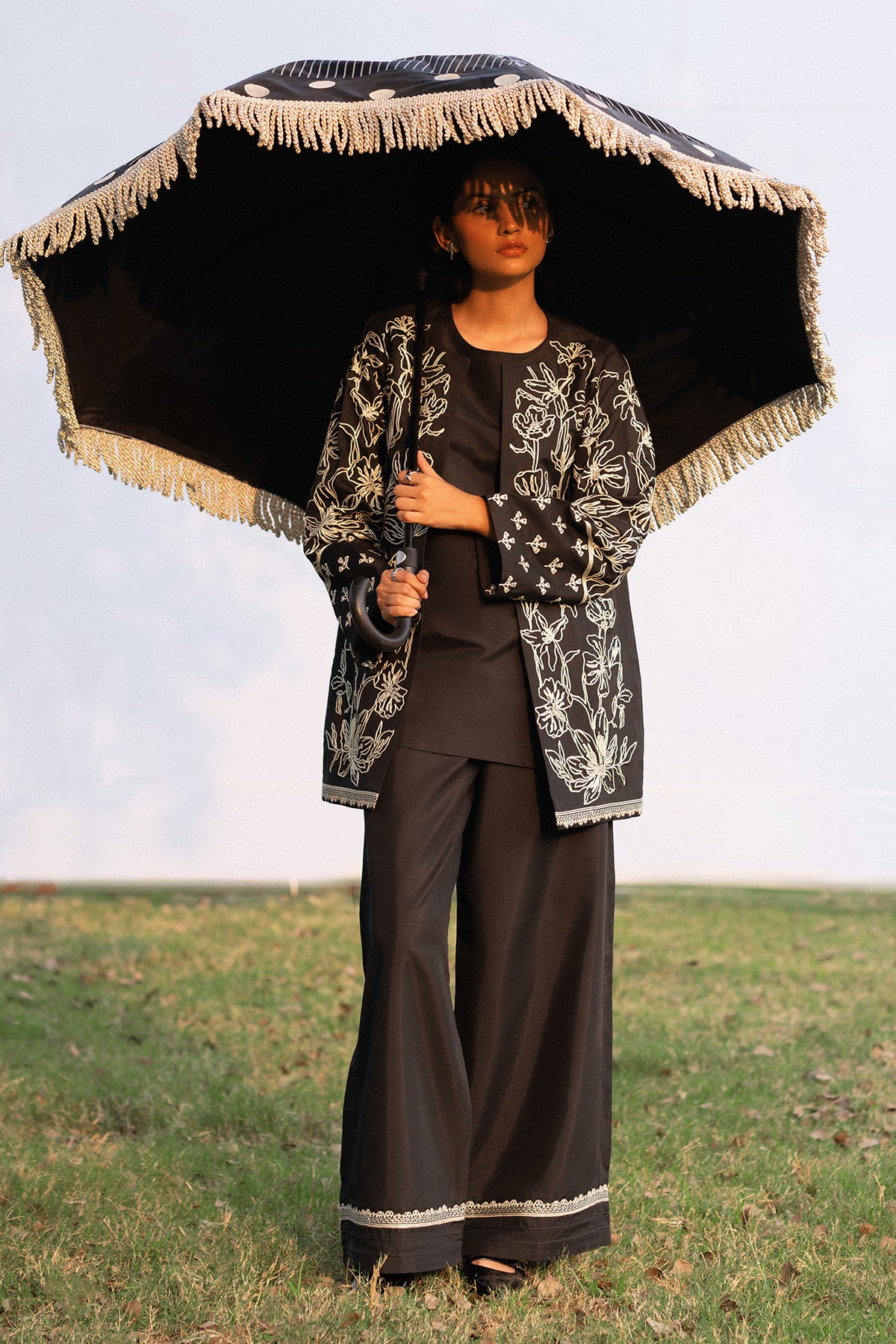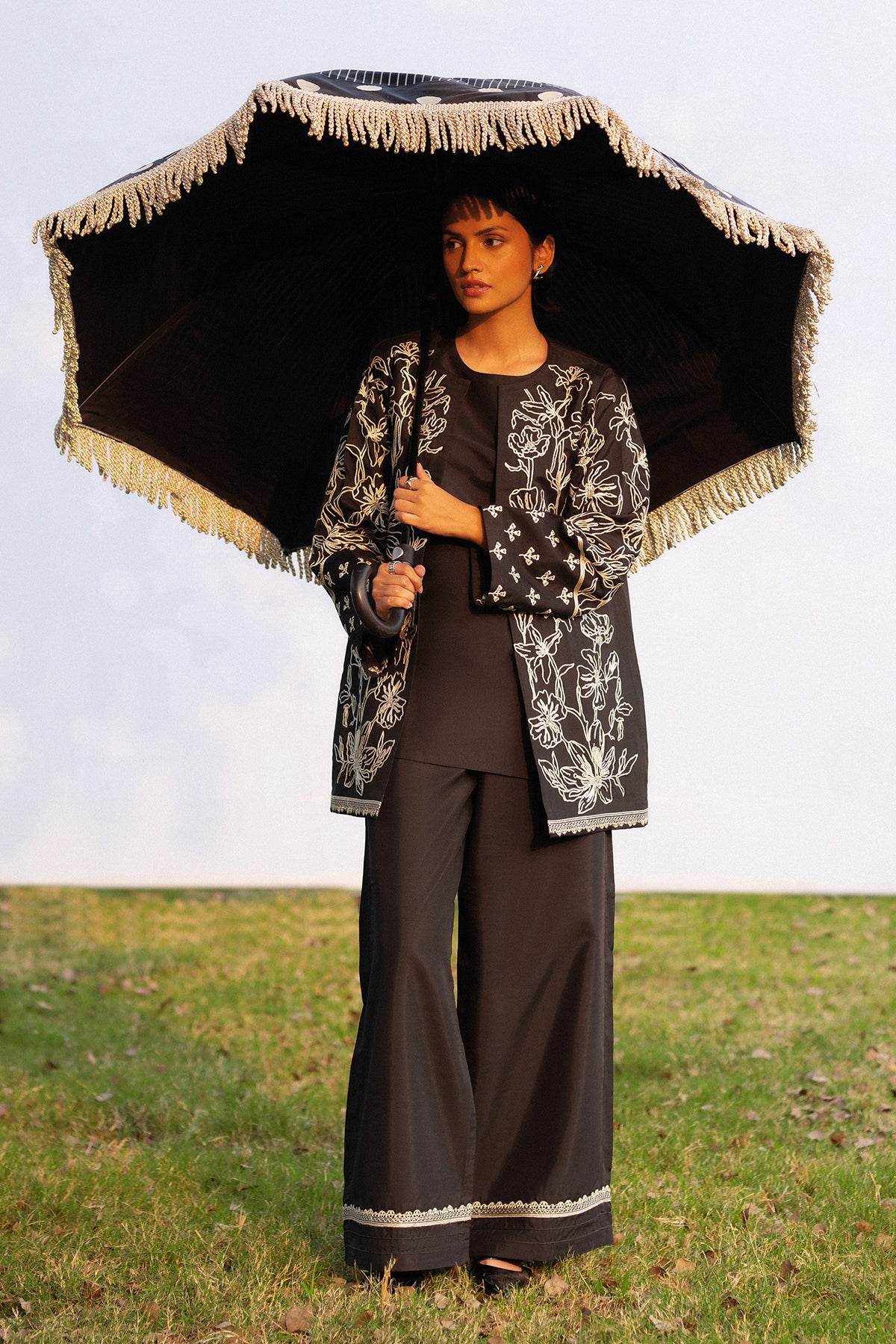 Fully embroidered shrug with inner shirt and wide leg and pant with embroidery details.
