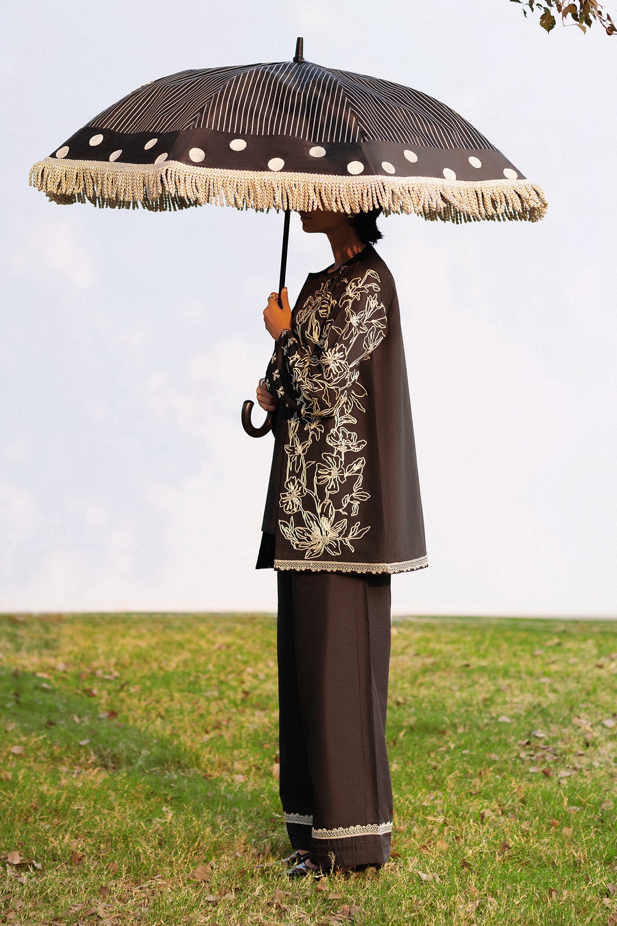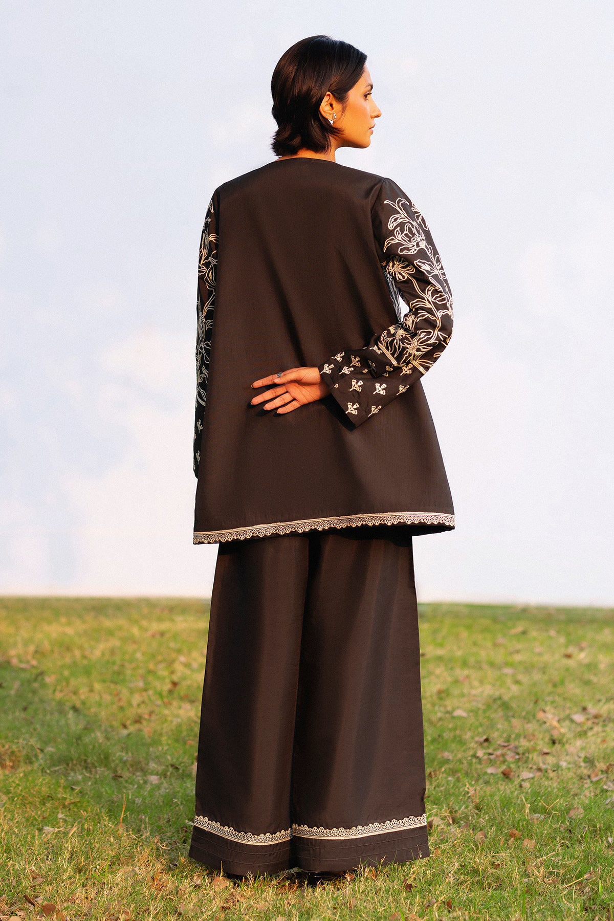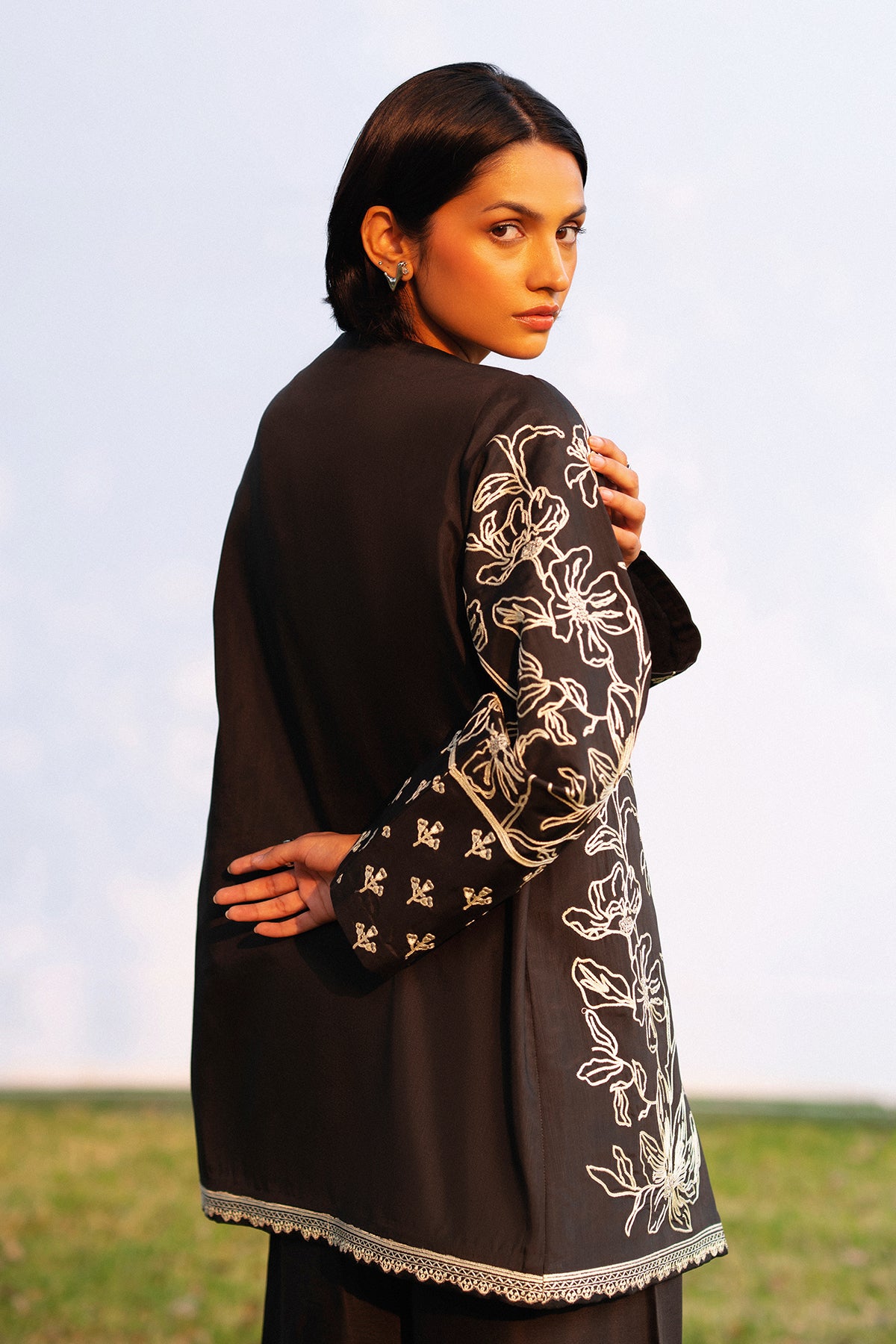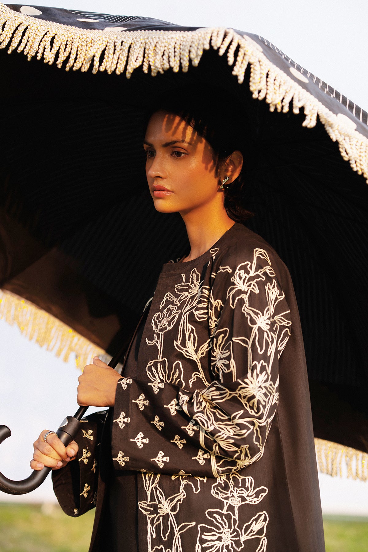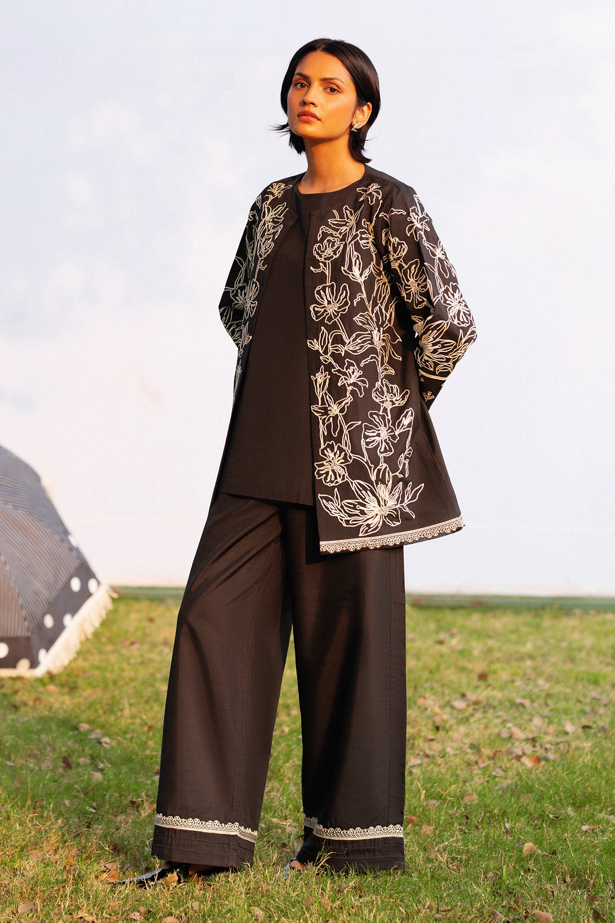 Fully embroidered shrug with inner shirt and wide leg and pant with embroidery details.