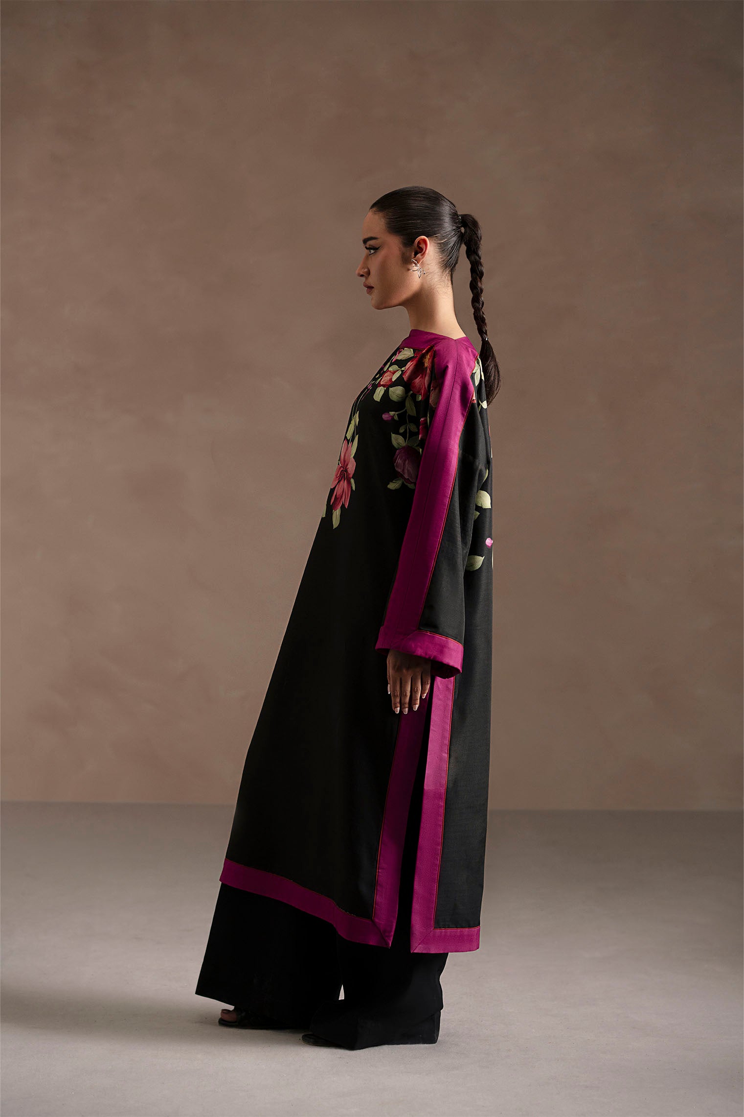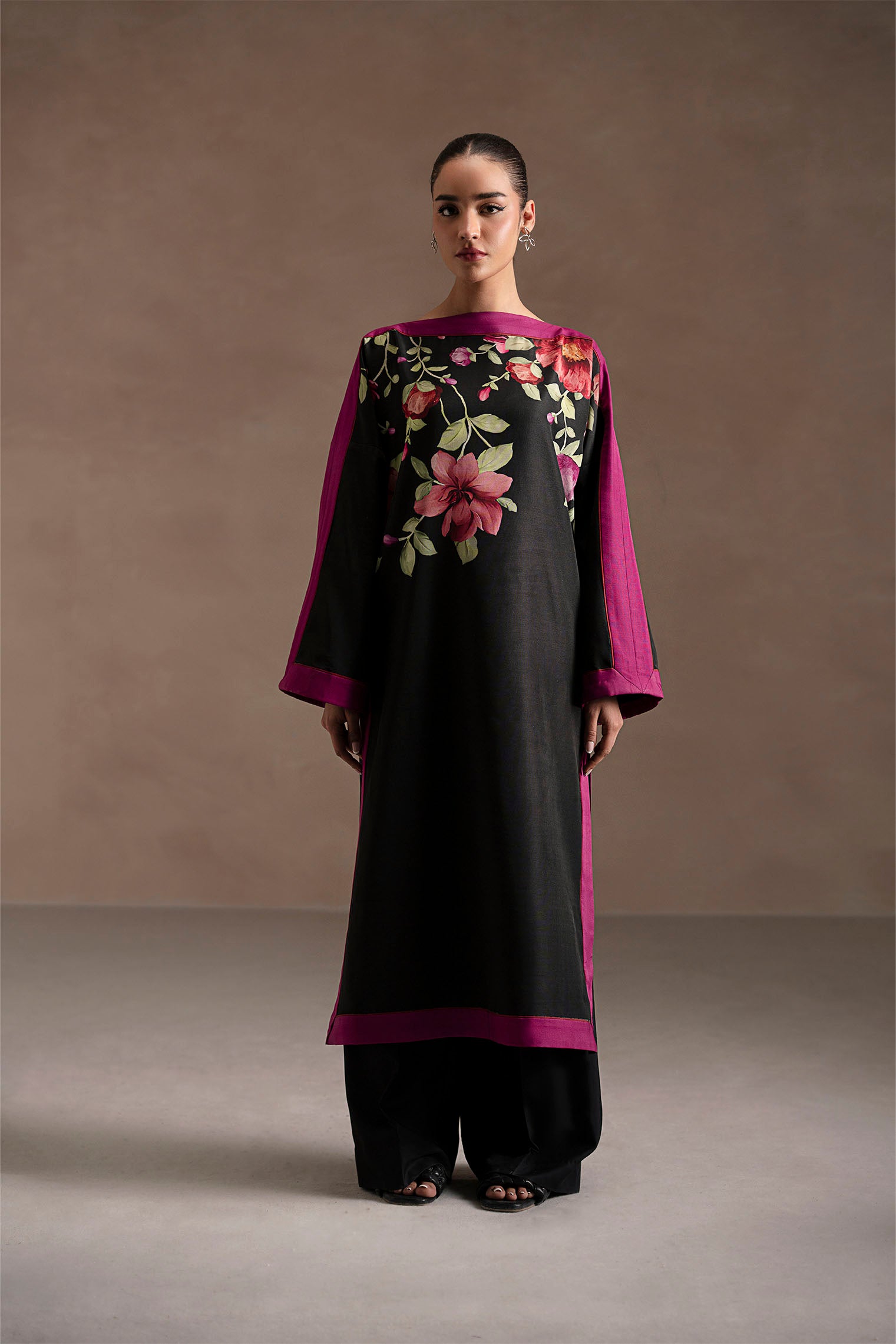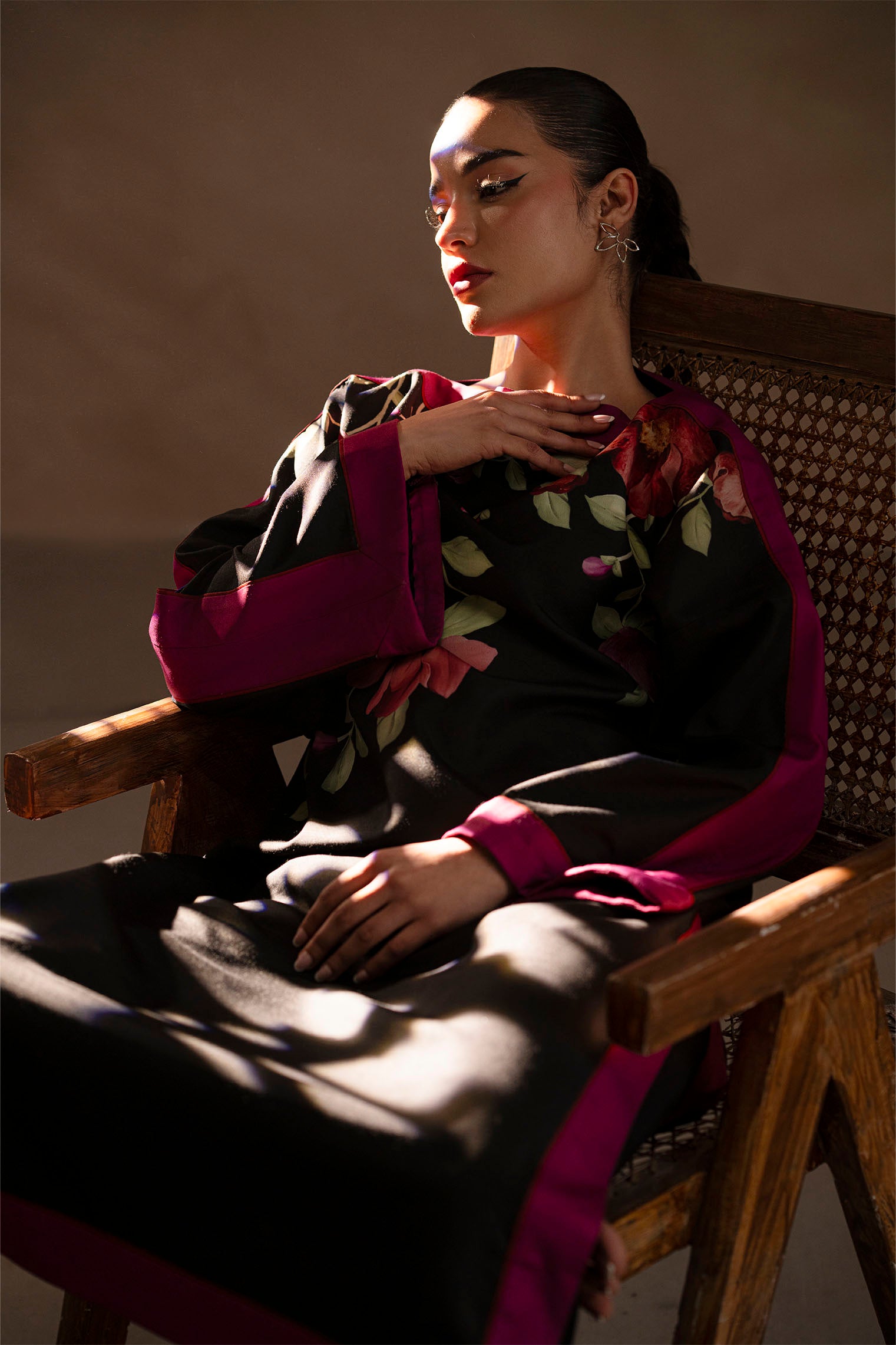 Elevate your wardrobe with this chic stitched 2-piece set, featuring a black printed poly lawn sack shirt adorned with subtle pink block details. Complemented by solid black poly lawn trousers, this ensemble blends elegance with contemporary charm.