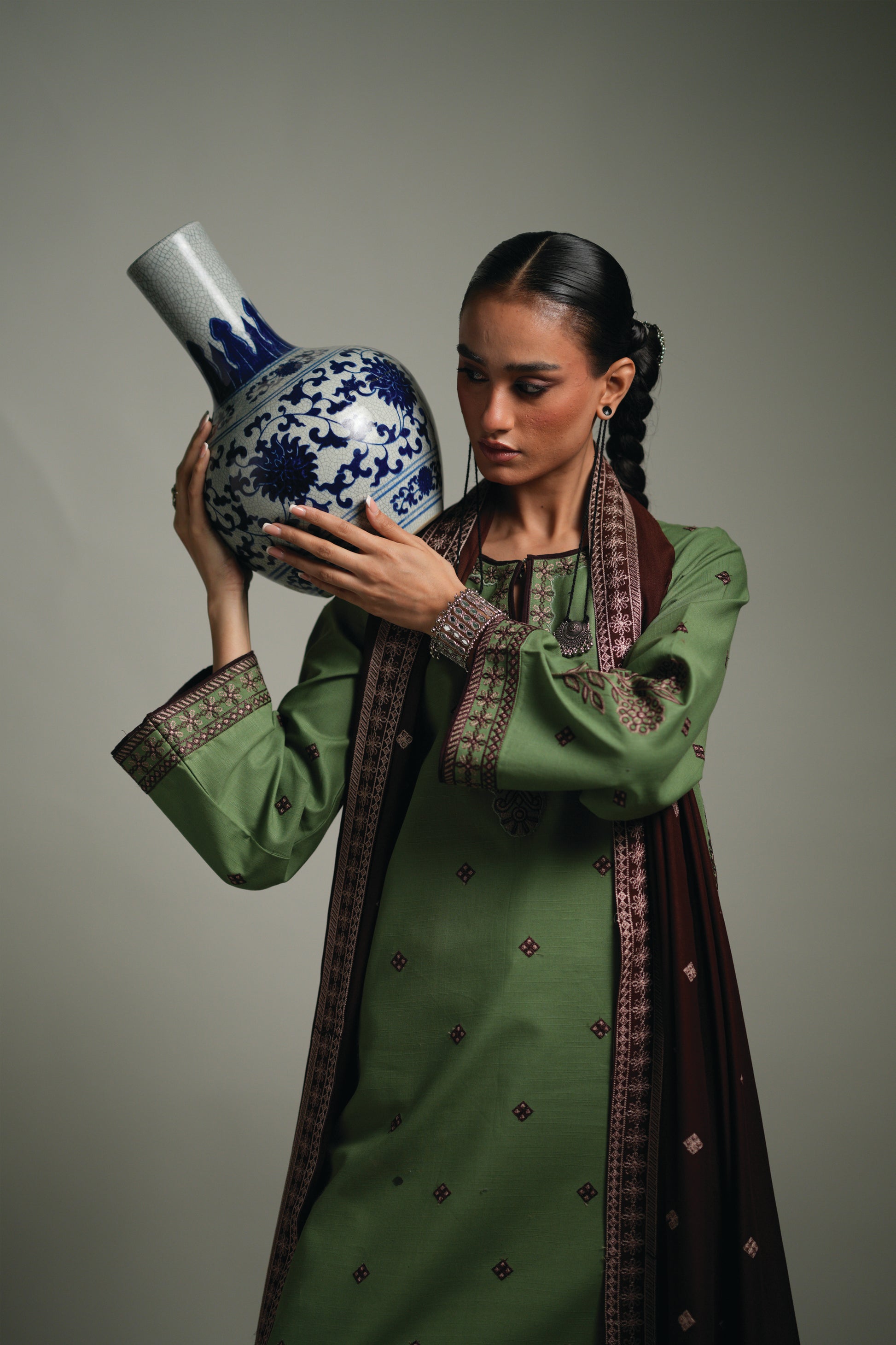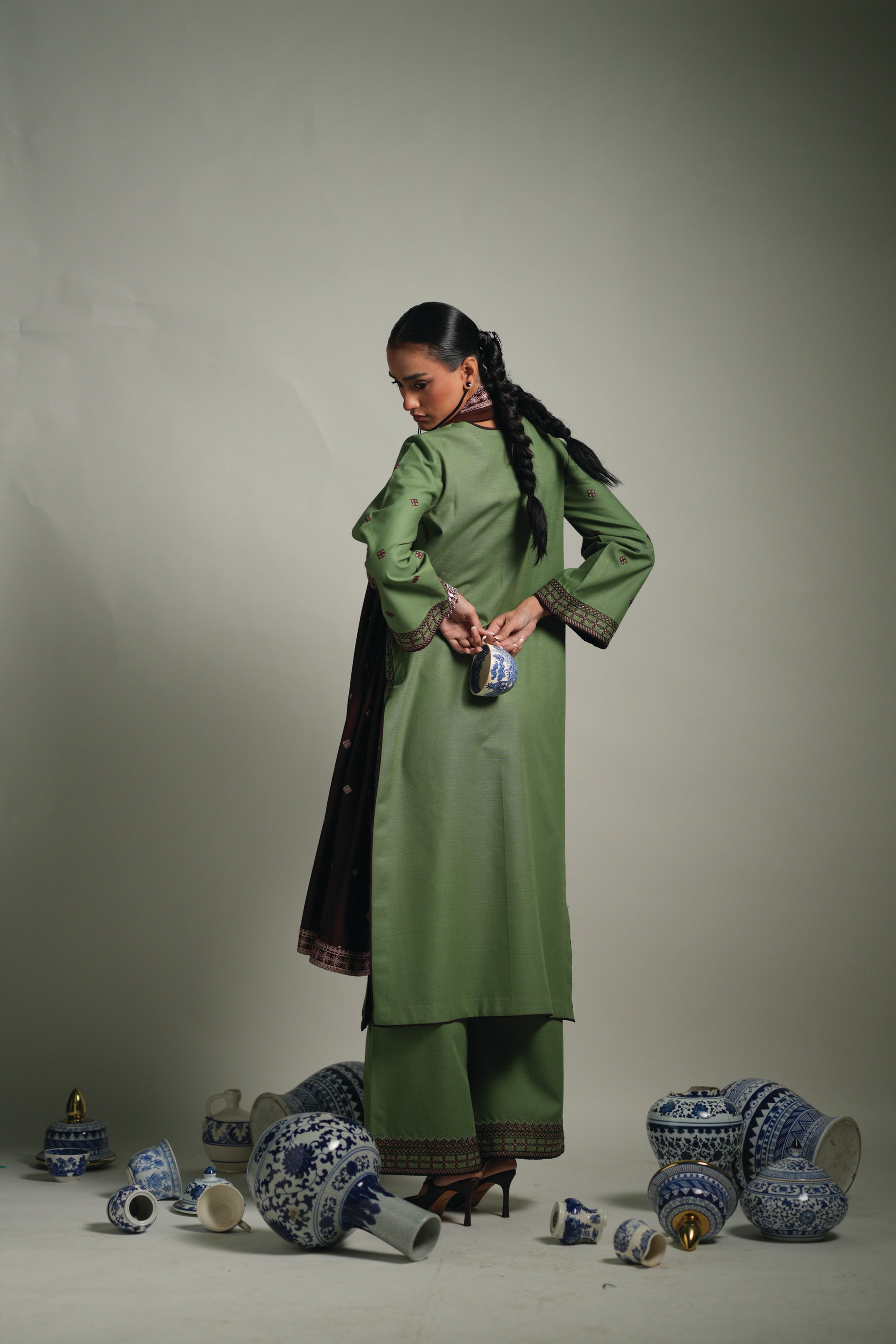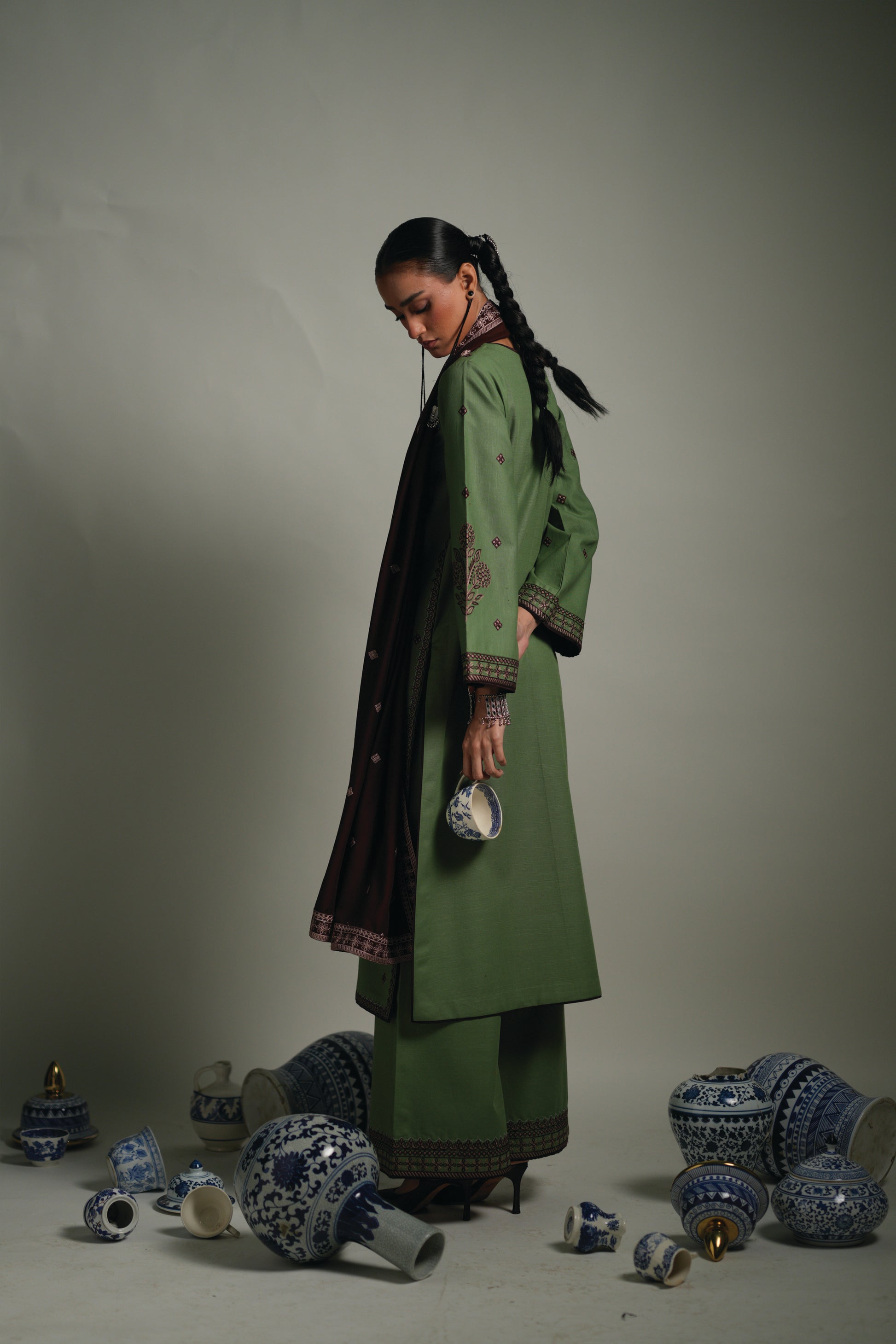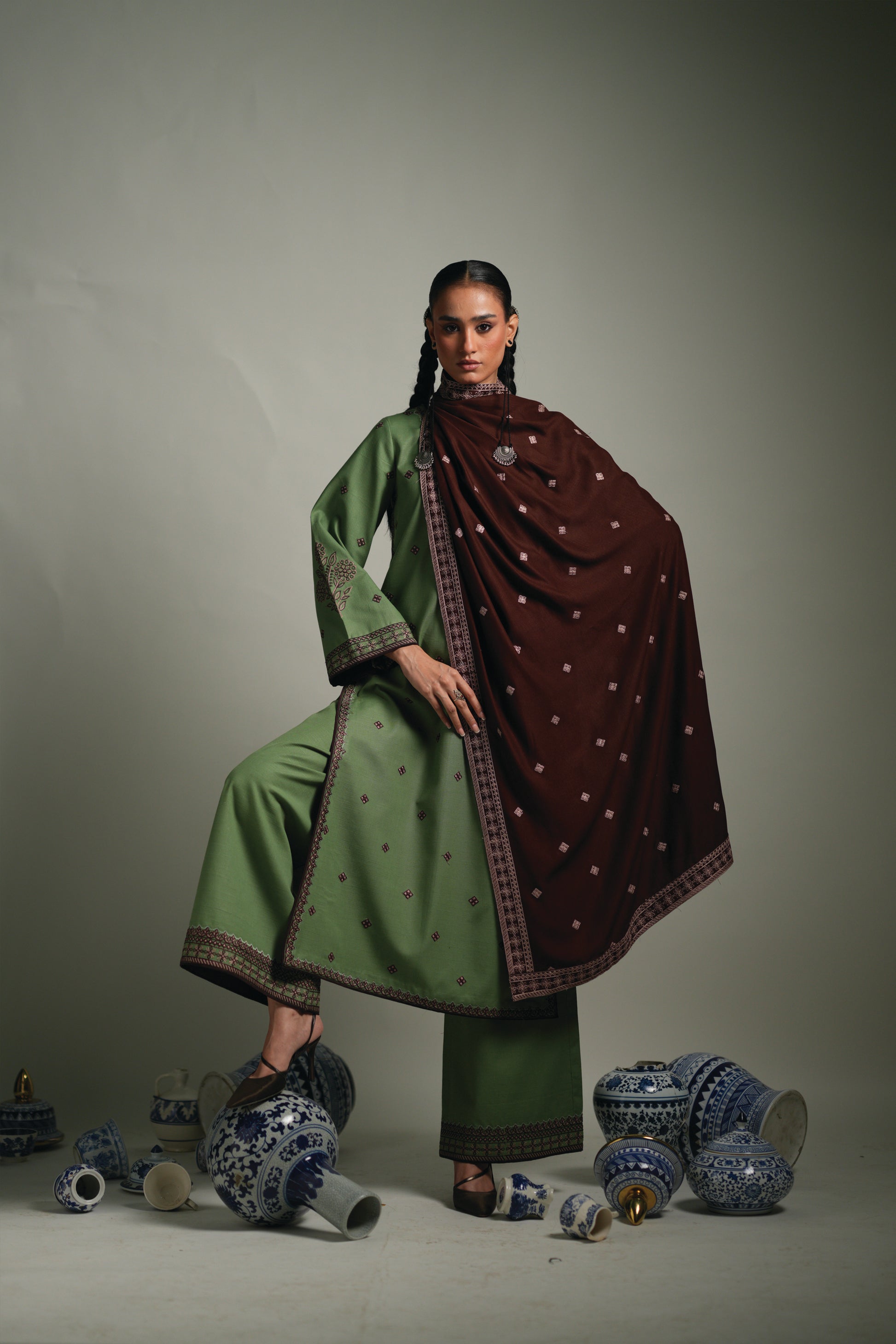 Sage is a sophisticated three-piece ensemble that embodies understated elegance and timeless style. The outfit features a long-length, sage green, Embroidered Khaddar shirt paired with wide-leg, sage green, embroidered Khaddar trousers, beautifully complemented by a rich brown shawl. Intricate embroidery enhances the shirt’s sleeves, neckline, and hem, while coordinated brown embroidered accents on the trousers add depth and refinement. This graceful ensemble is perfectly suited for both formal occasions and semi-formal gatherings, offering a harmonious blend of comfort, elegance, and modern design.