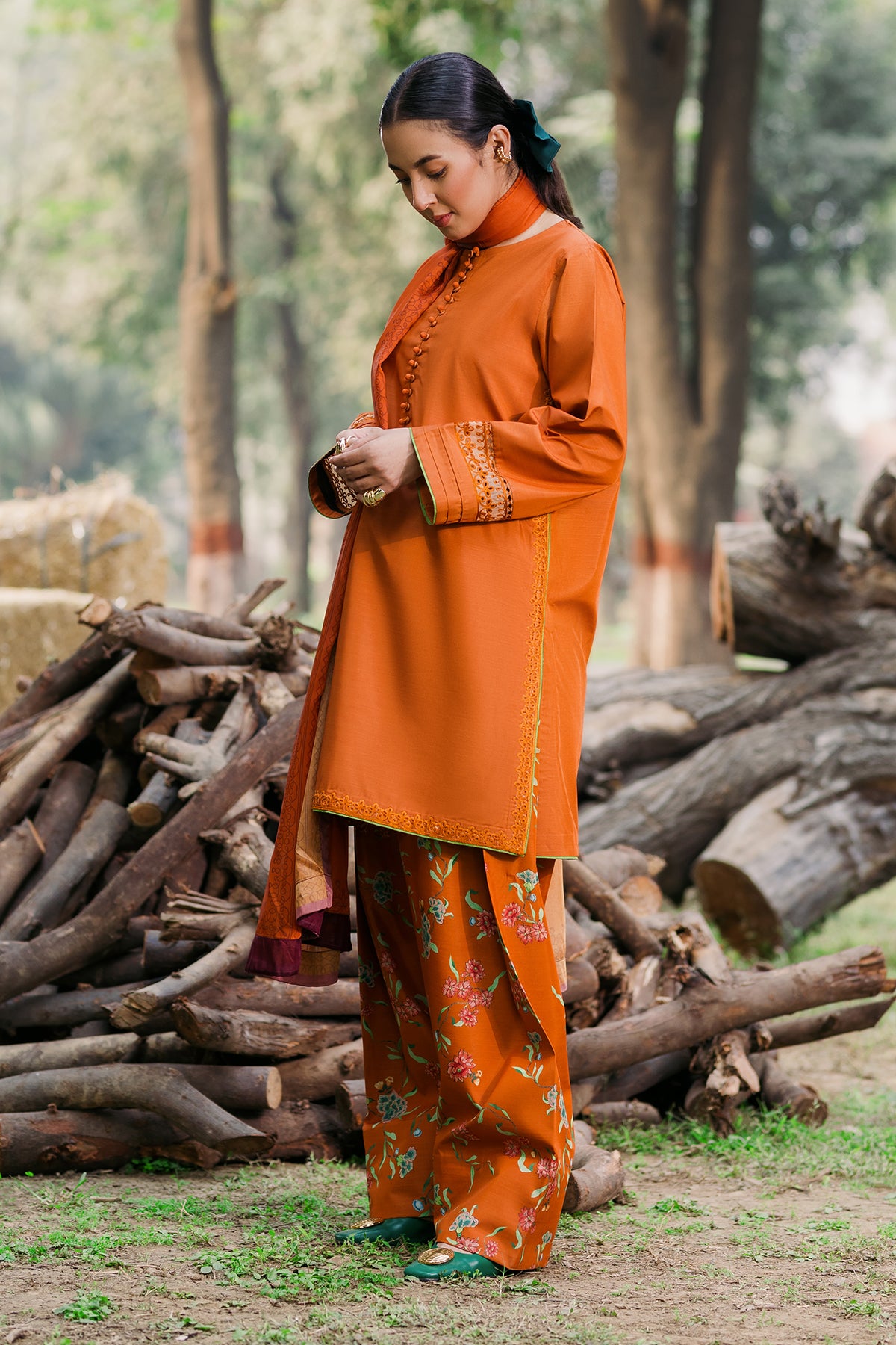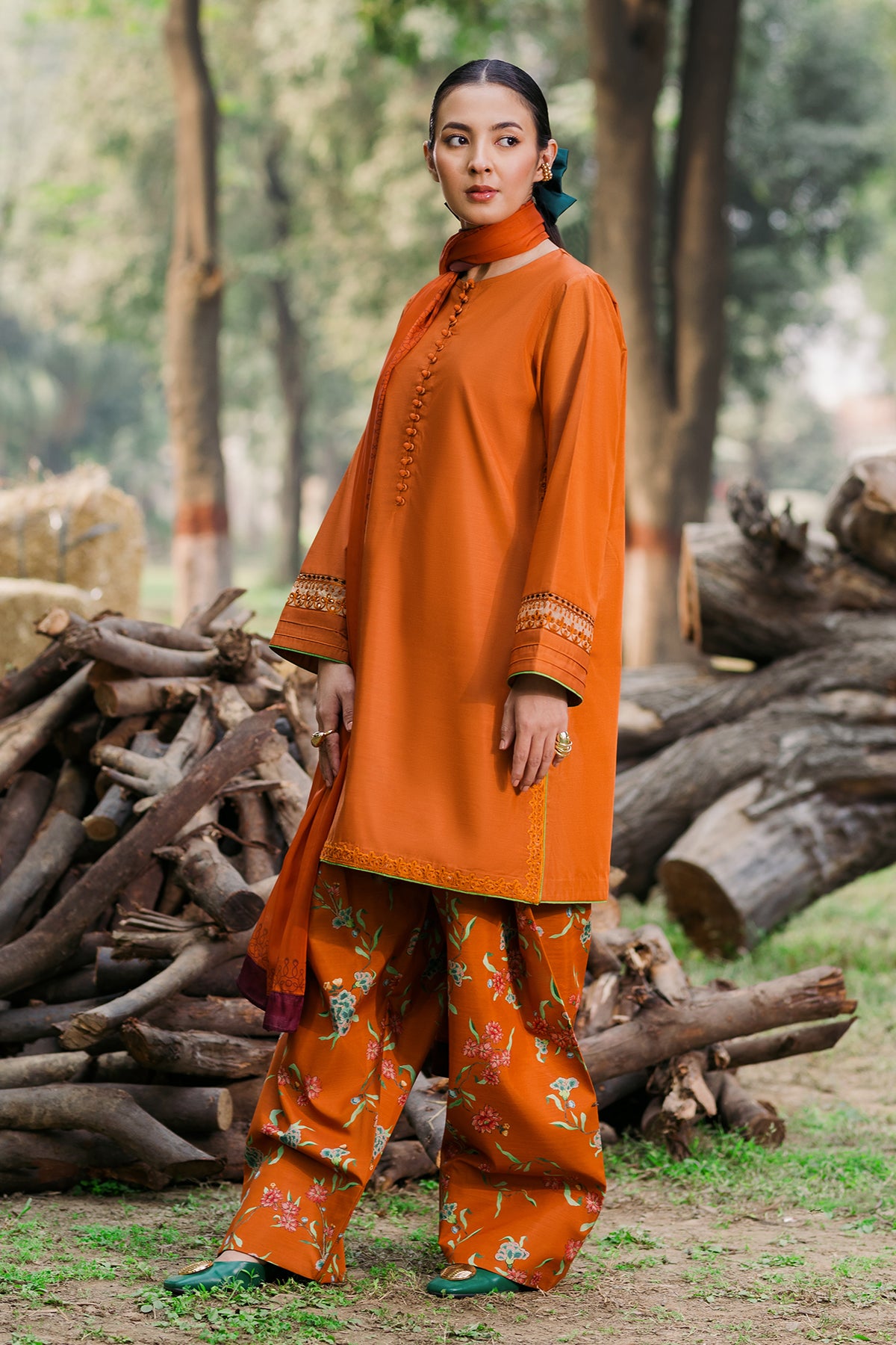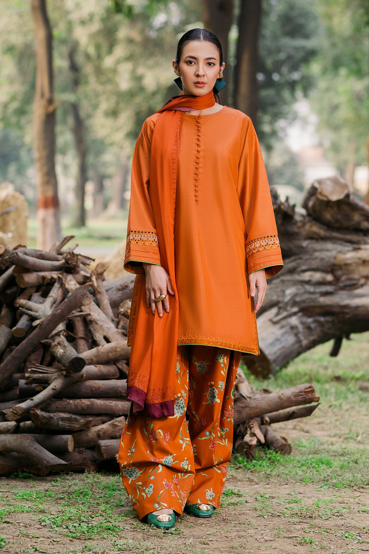 Radiate warmth and style with our Burnt Orange Raw Silk ensemble! Featuring an embroidered shirt with elegant loop button details, paired with a vibrant printed shalwar and a matching printed dupatta. It is a perfect blend of tradition and modernity