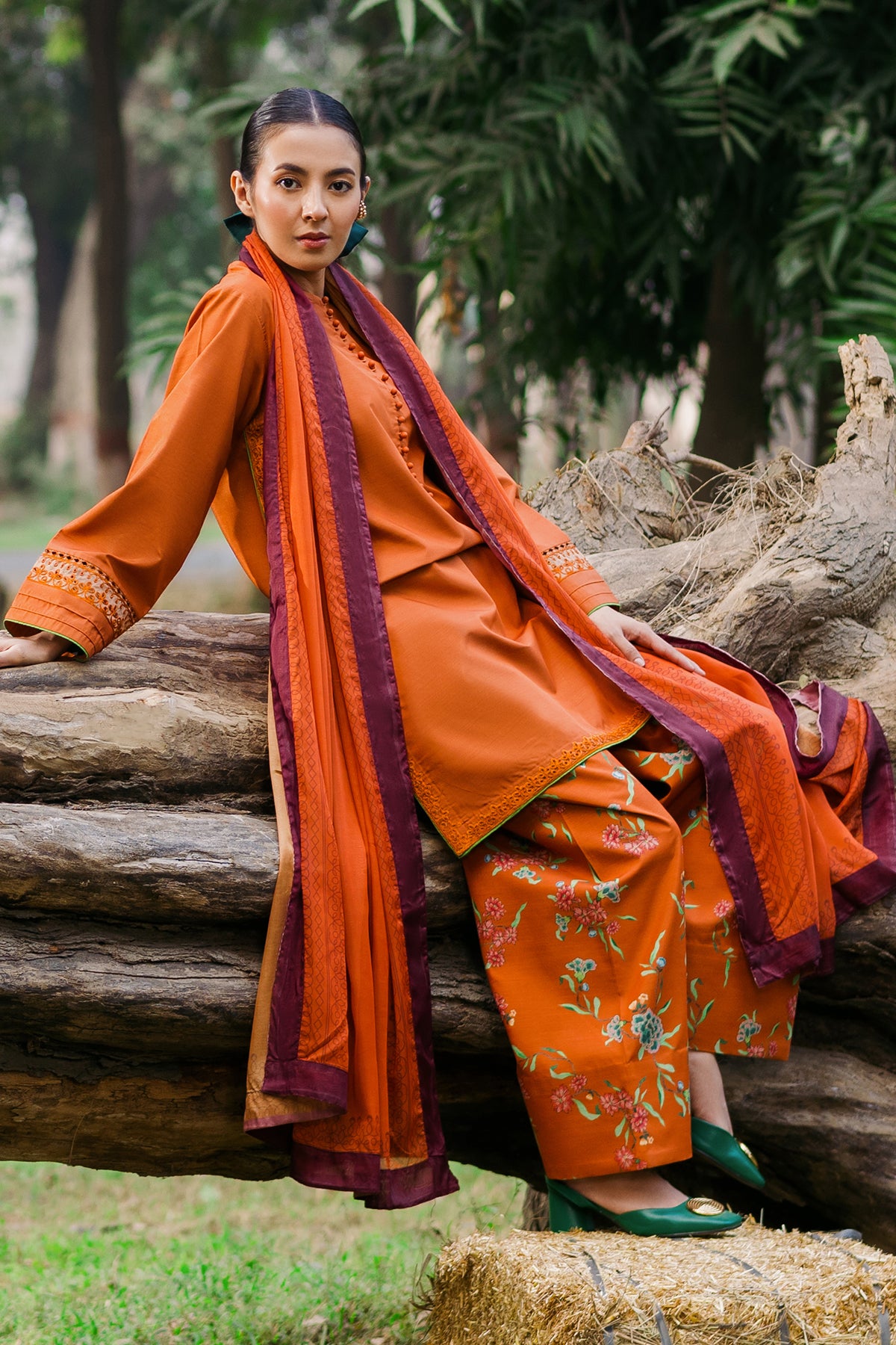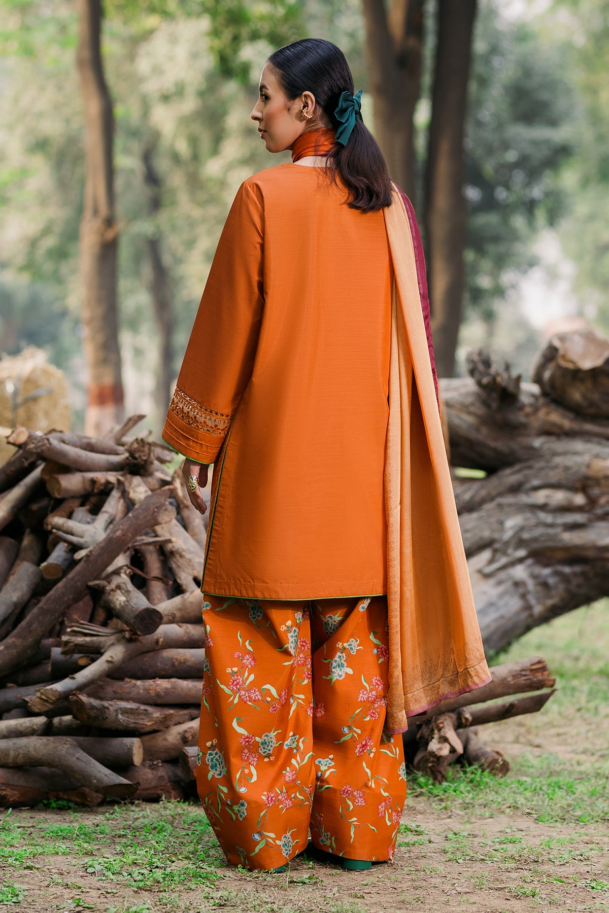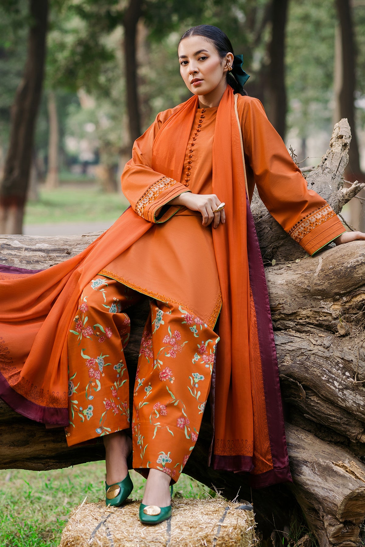 Radiate warmth and style with our Burnt Orange Raw Silk ensemble! Featuring an embroidered shirt with elegant loop button details, paired with a vibrant printed shalwar and a matching printed dupatta. It is a perfect blend of tradition and modernity