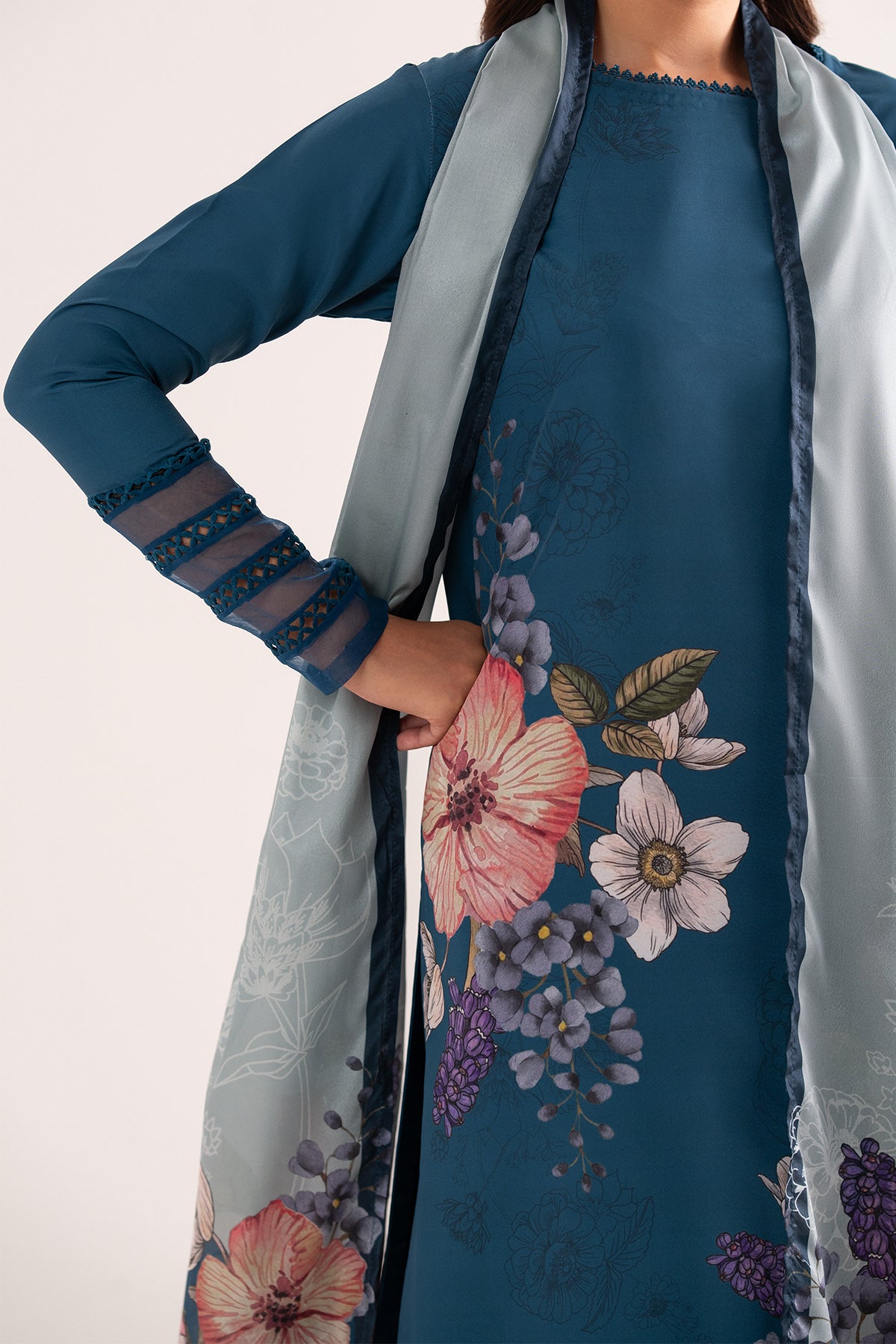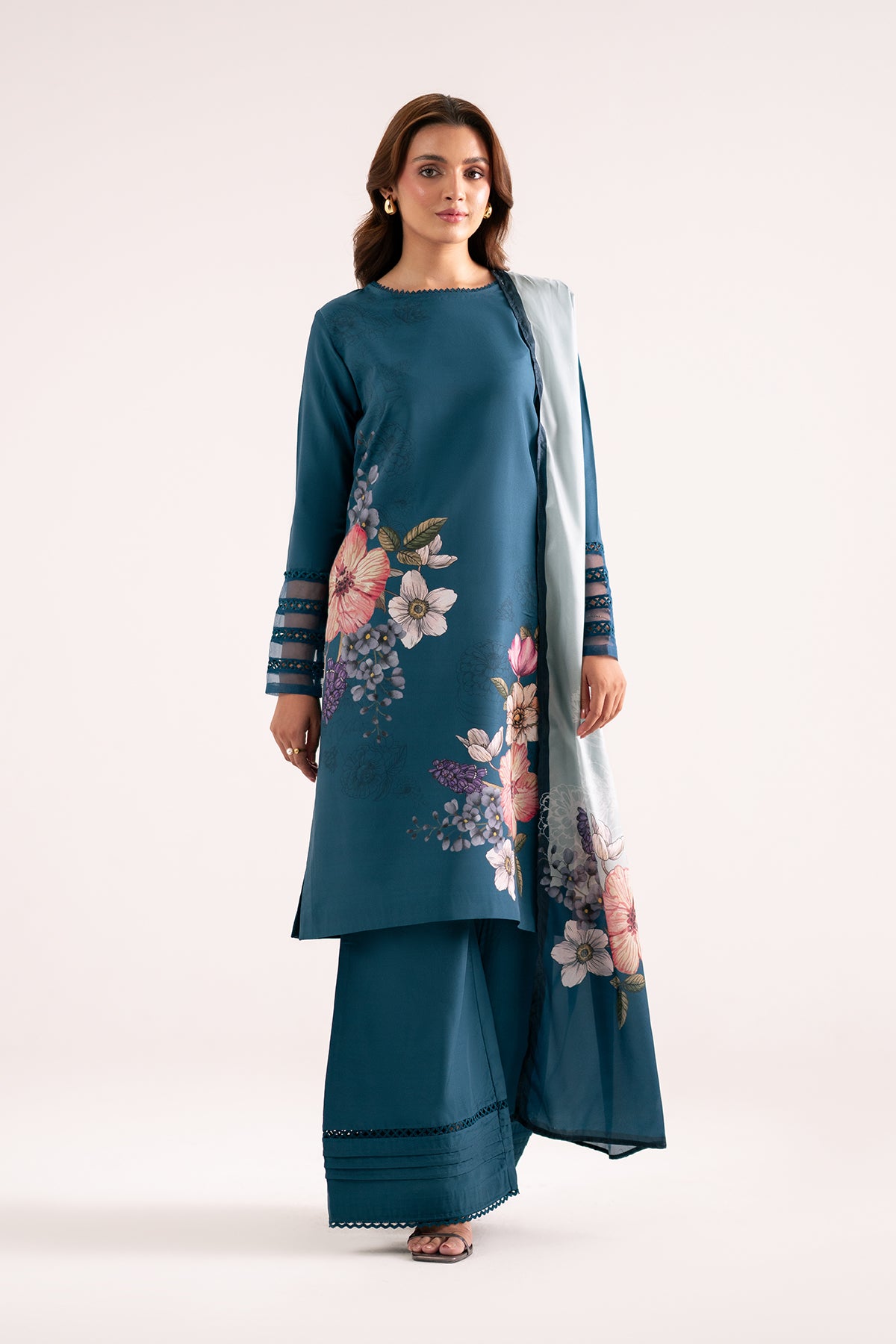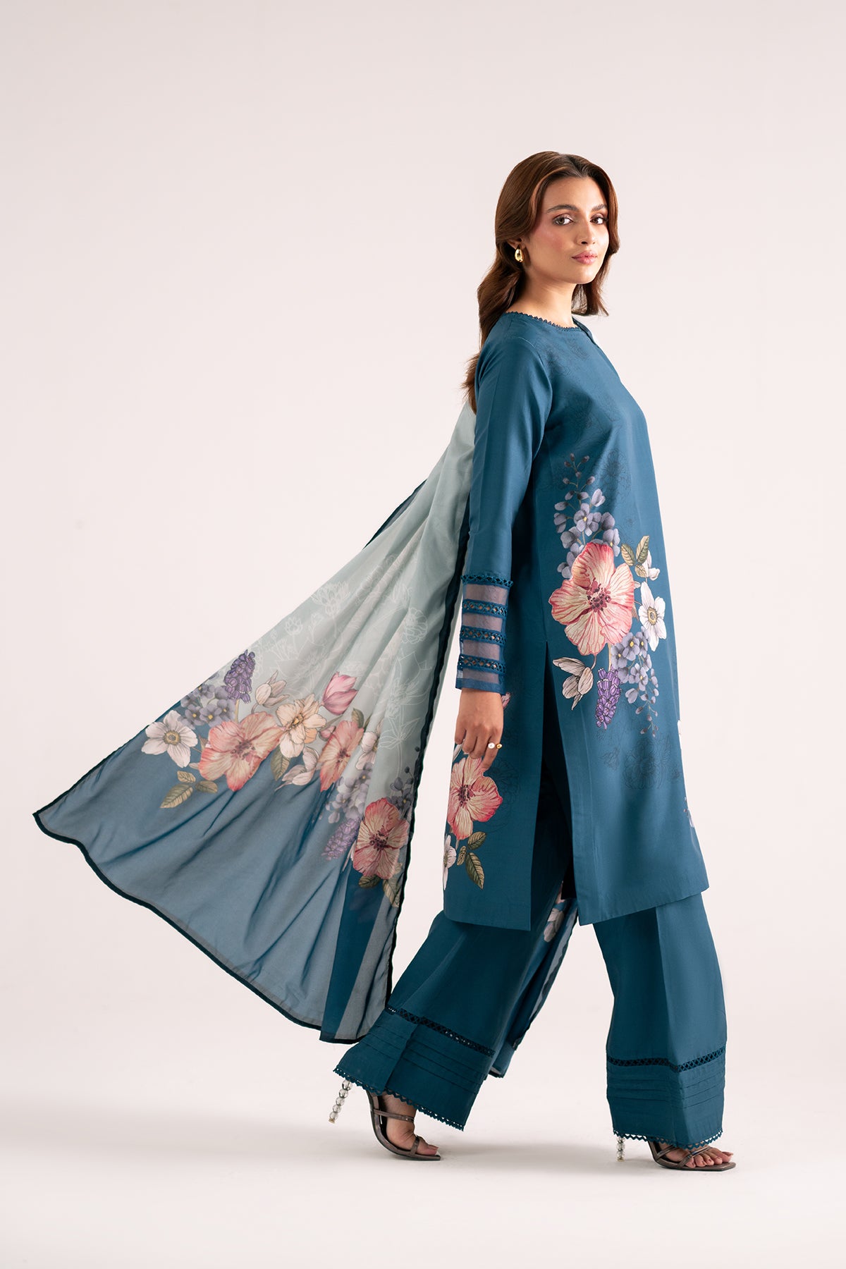 Azulita a three-piece ensemble in a rich teal shade. The sleeveless long shirt, featuring delicate lace detailing, offers a sleek and modern silhouette that’s both stylish and versatile. Complementing the shirt, the straight pants are adorned with matching lace accents, creating a harmonious and refined look. Completing the outfit is a beautifully printed silk dupatta, adding a touch of luxury and grace to the overall ensemble.