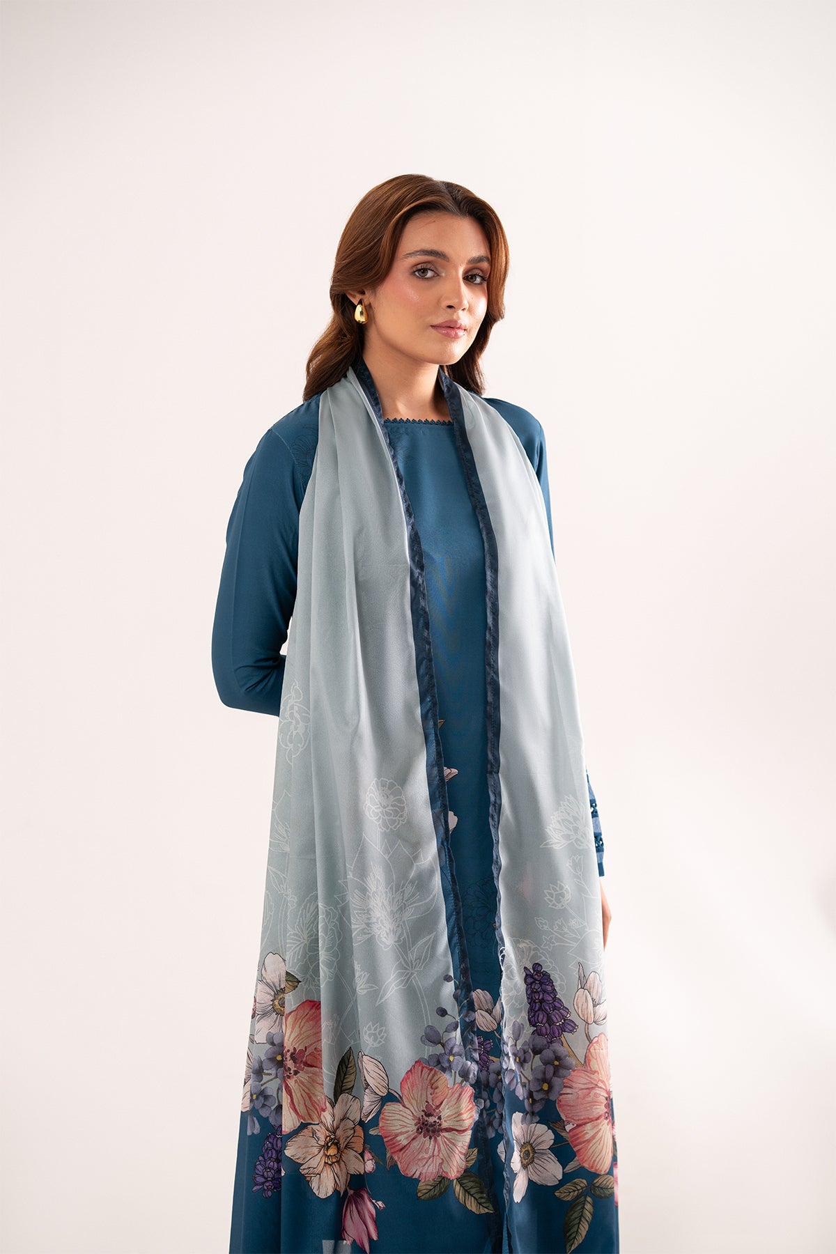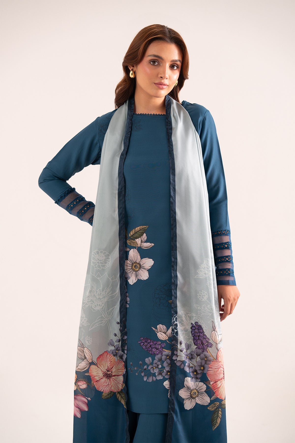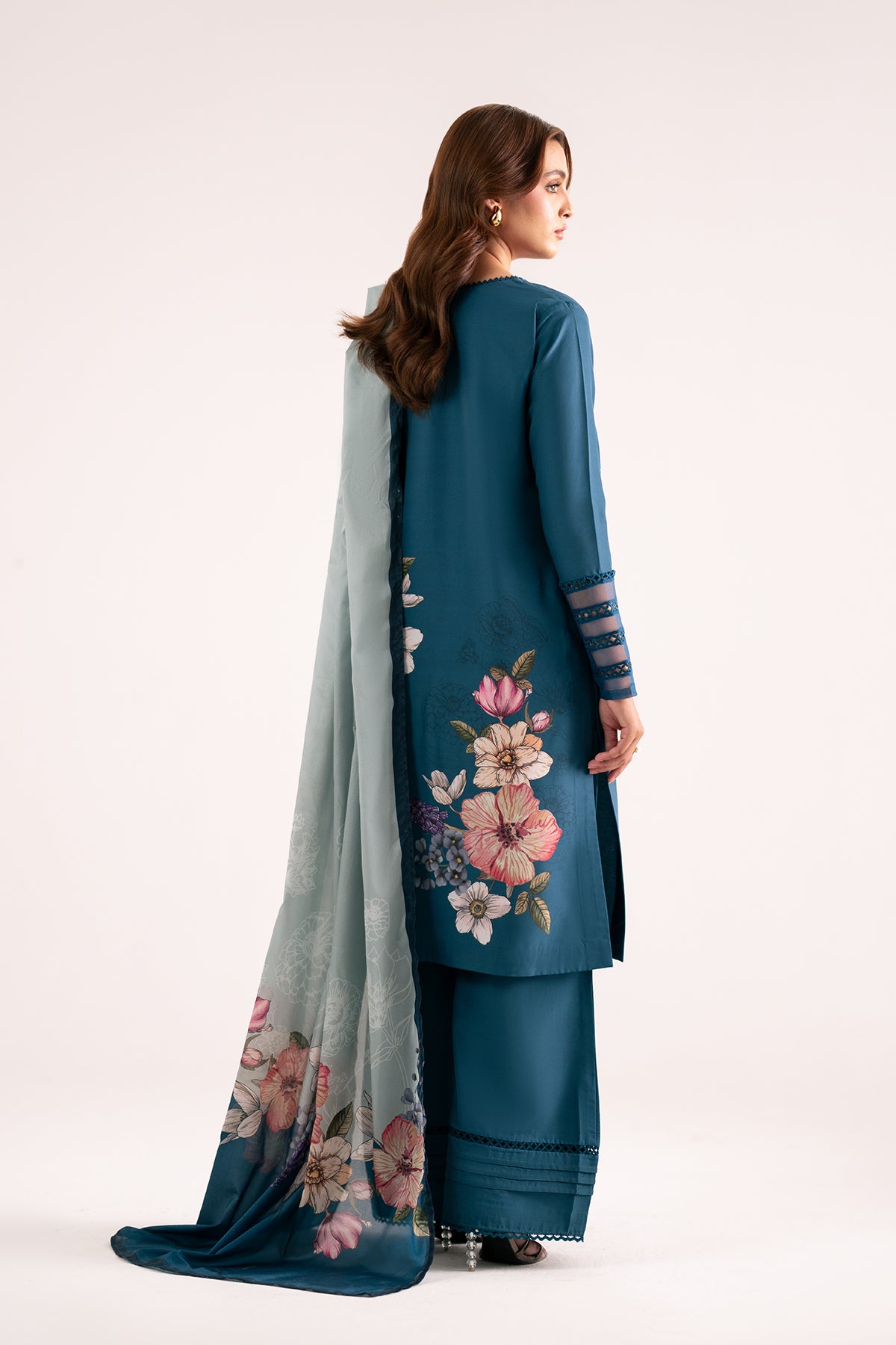 Azulita a three-piece ensemble in a rich teal shade. The sleeveless long shirt, featuring delicate lace detailing, offers a sleek and modern silhouette that’s both stylish and versatile. Complementing the shirt, the straight pants are adorned with matching lace accents, creating a harmonious and refined look. Completing the outfit is a beautifully printed silk dupatta, adding a touch of luxury and grace to the overall ensemble.
