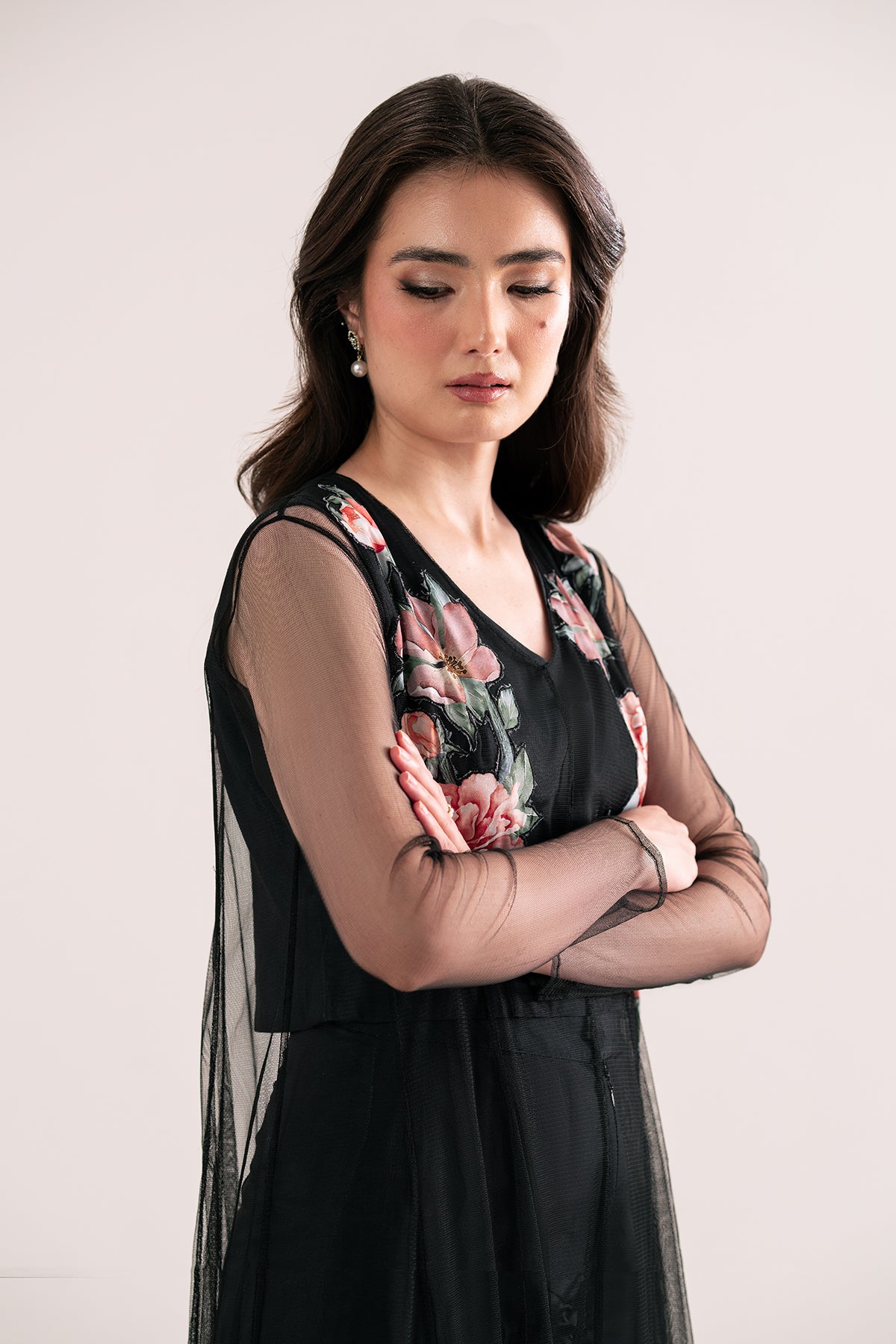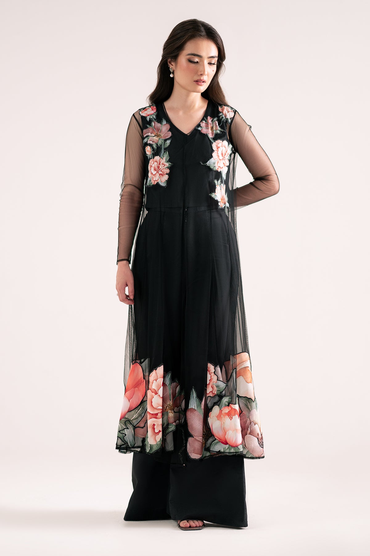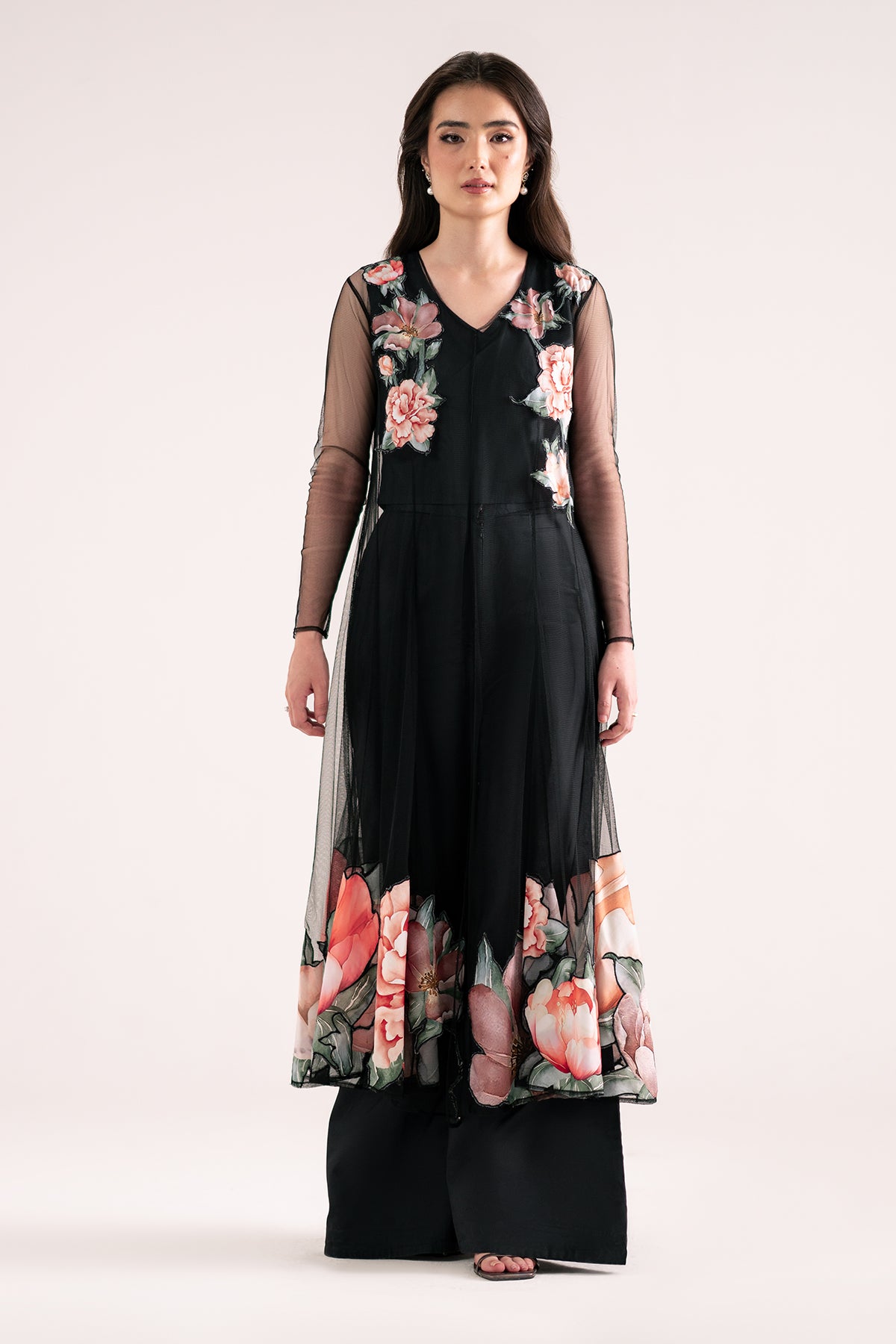 Net flared dress with floral patching on the neckline and hem, paired with an inner crop top and wide pants.