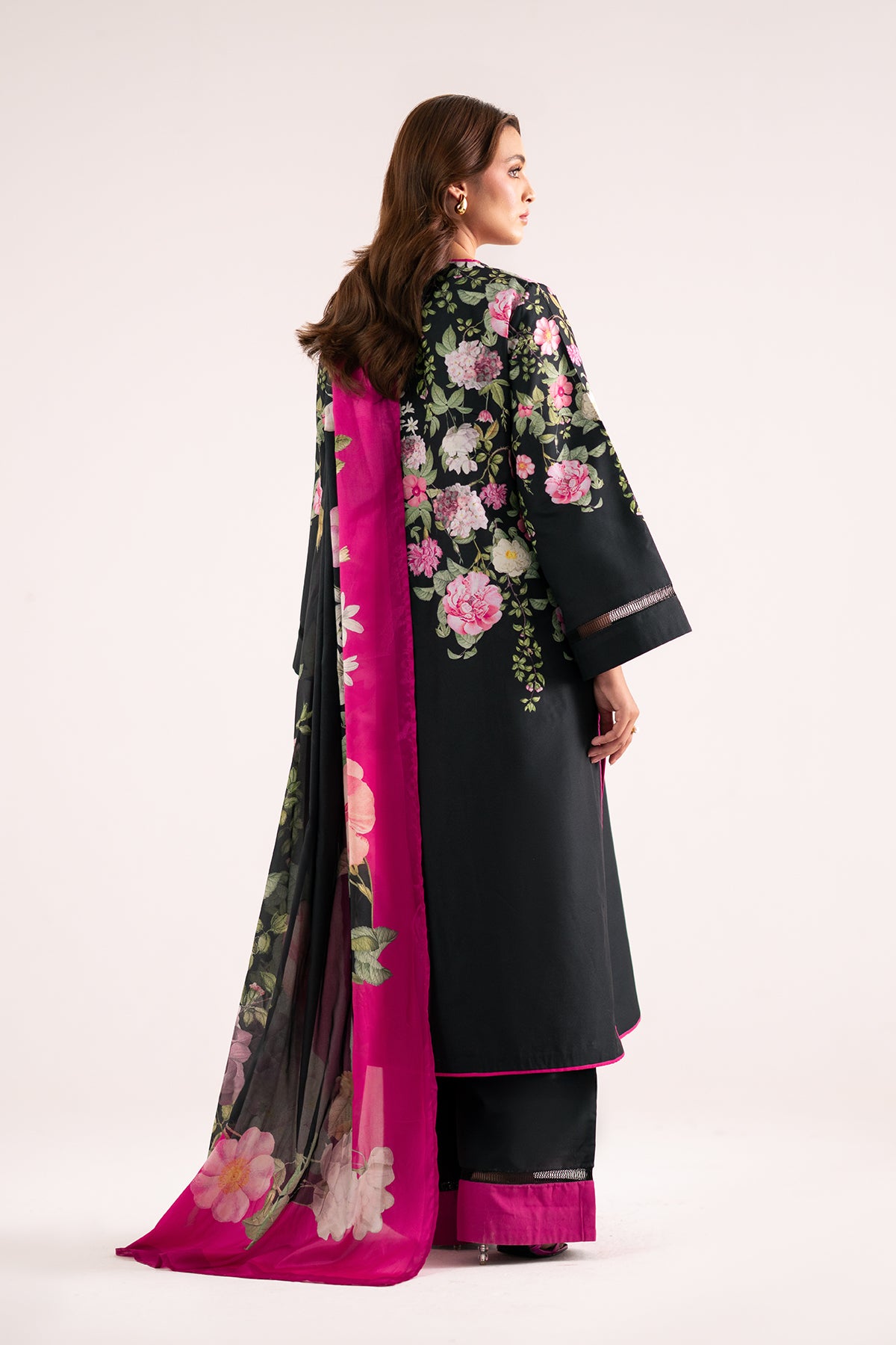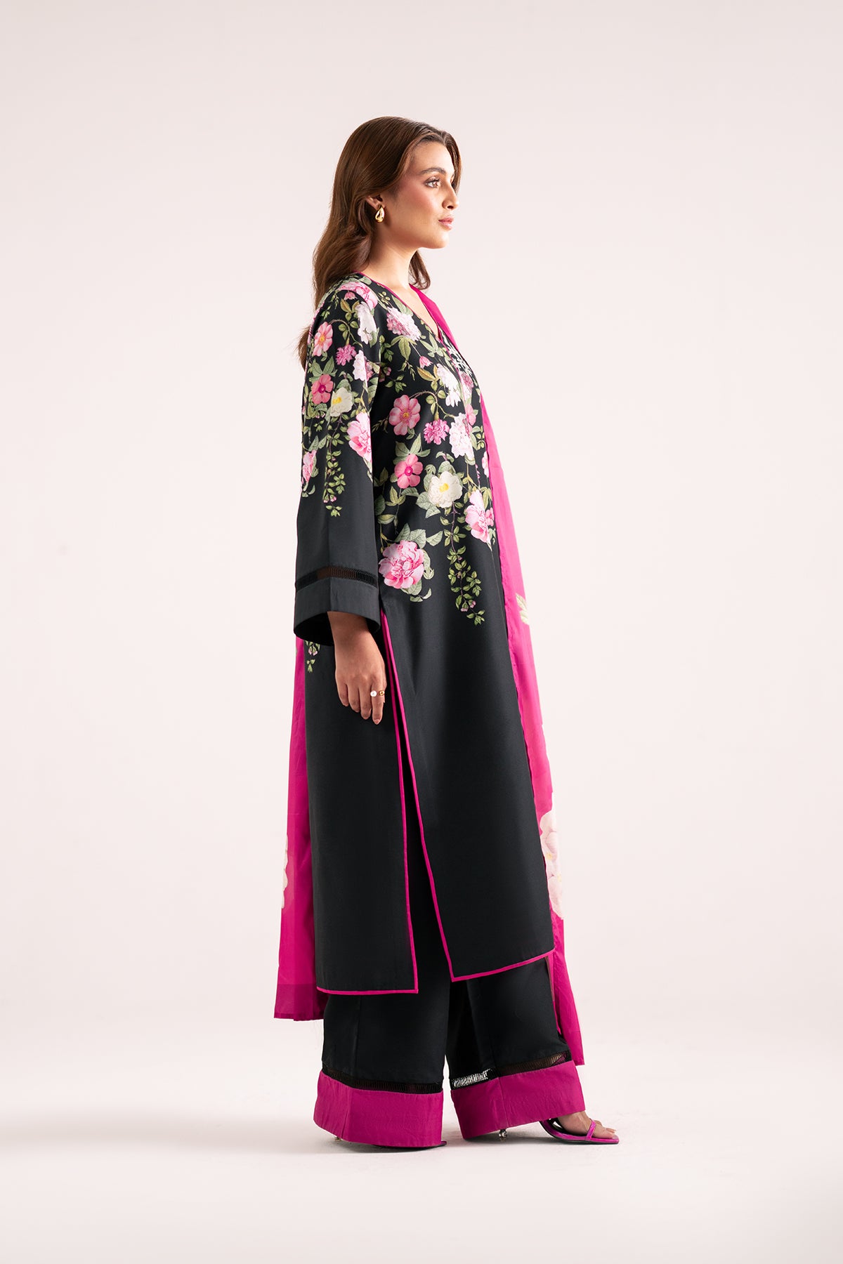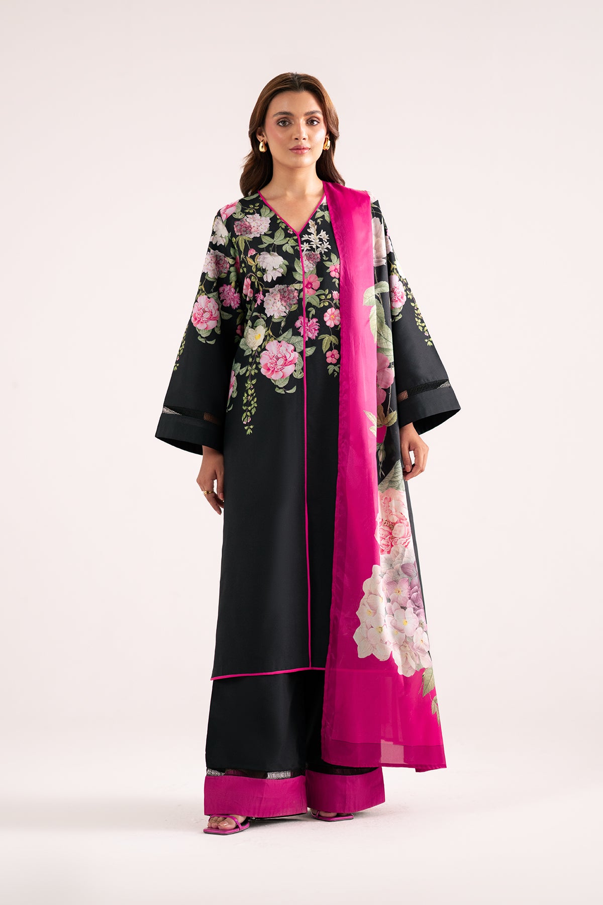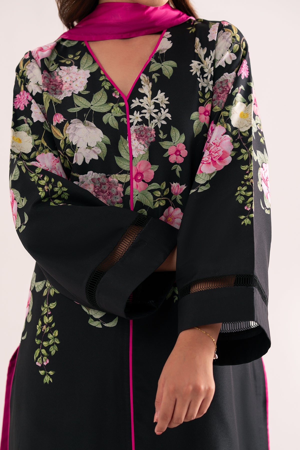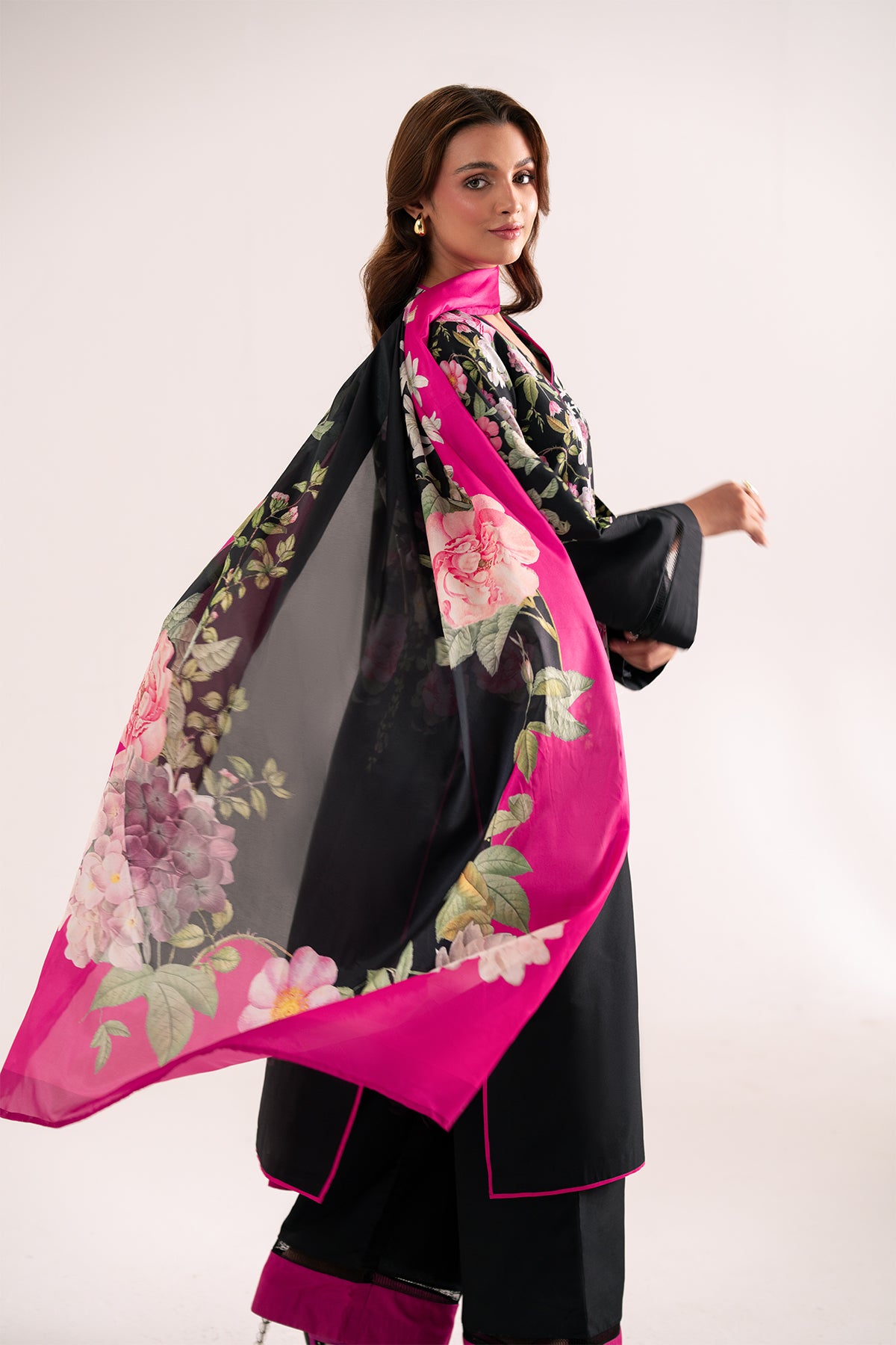 Fleurie is a striking three-piece ensemble in timeless black. The long, front-open shirt features elegant lace detailing on the sleeves. The shirt is complemented by color-block pants, expertly crafted to create a bold yet balanced look. Paired with a beautifully printed silk dupatta.