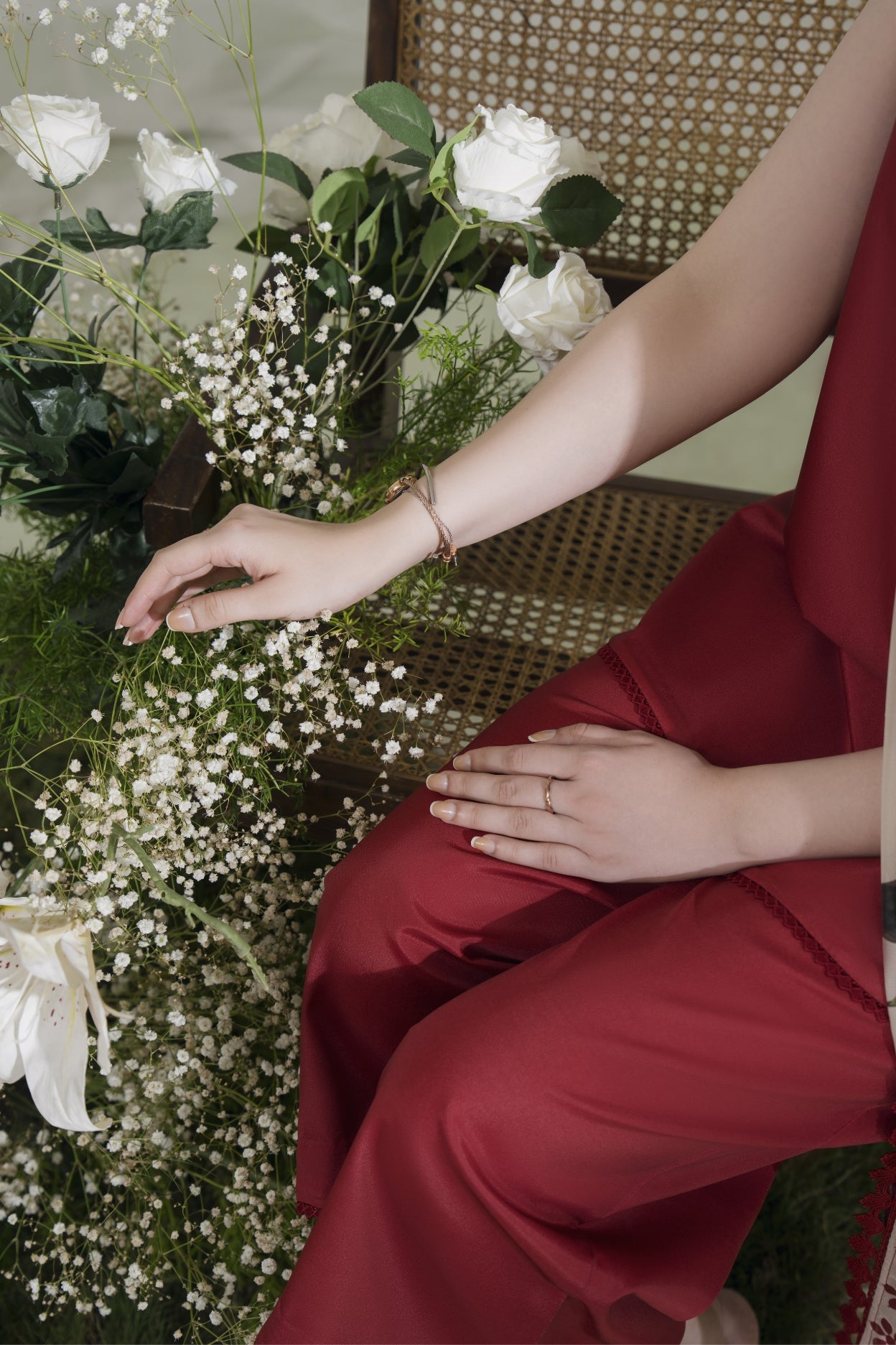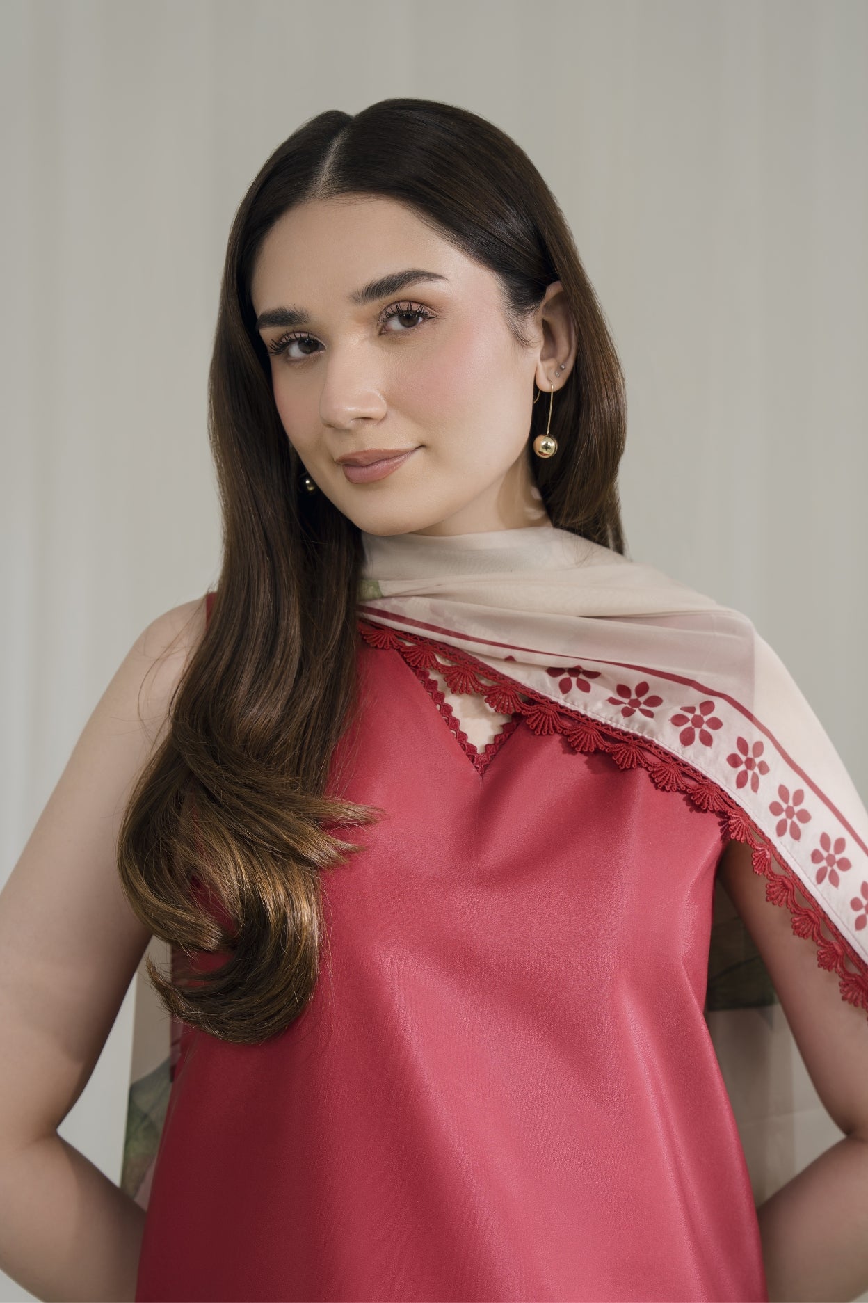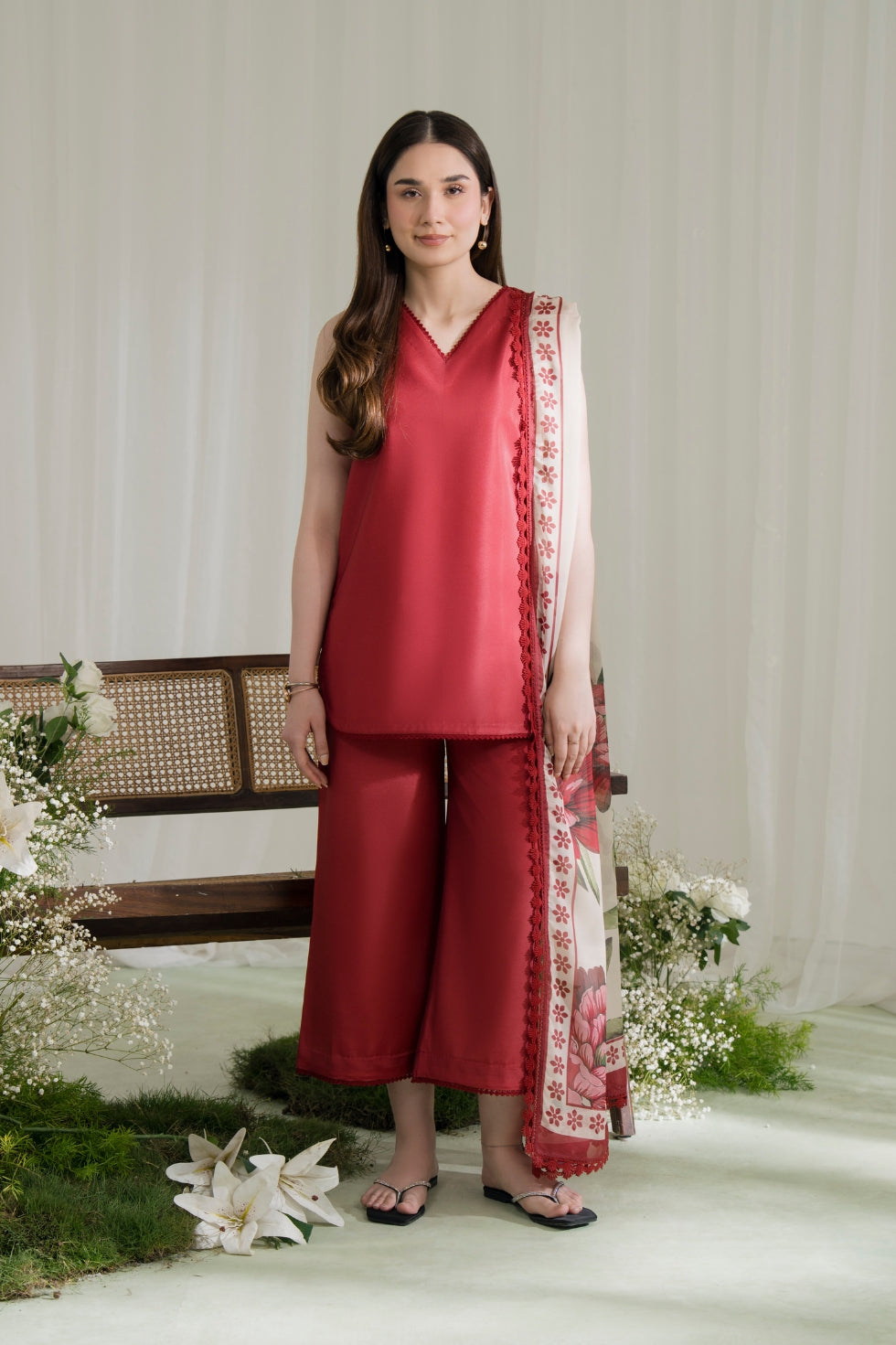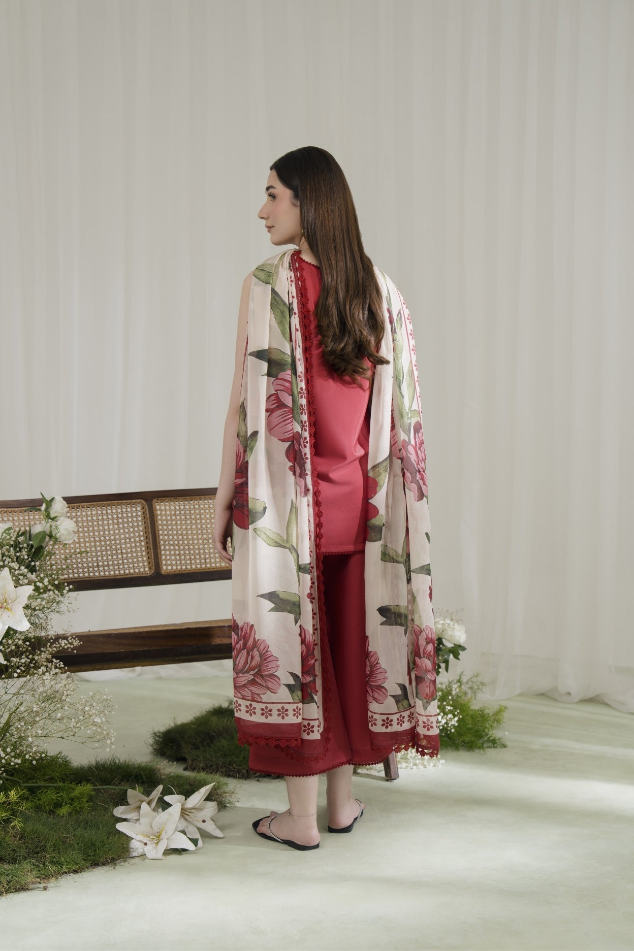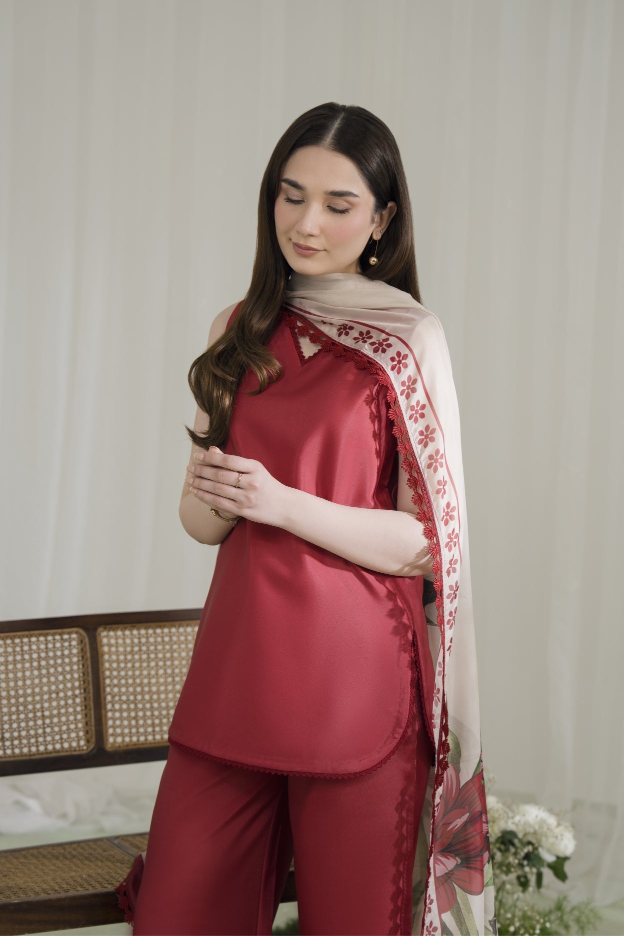 A rich crimson red outfit adorned with a detailed printed dupatta. The minimal yet striking design captures warmth and sophistication for festive evenings.
